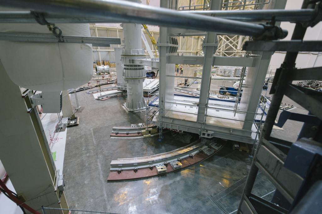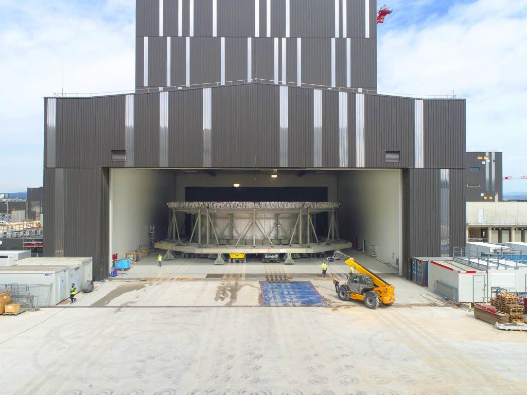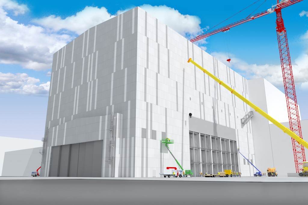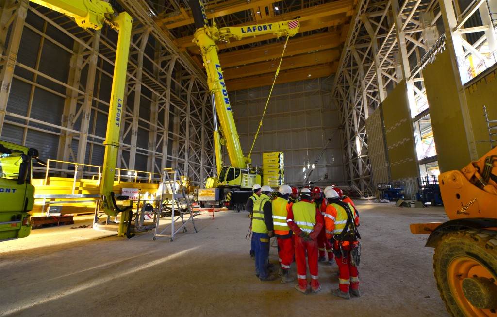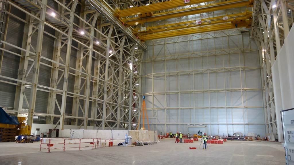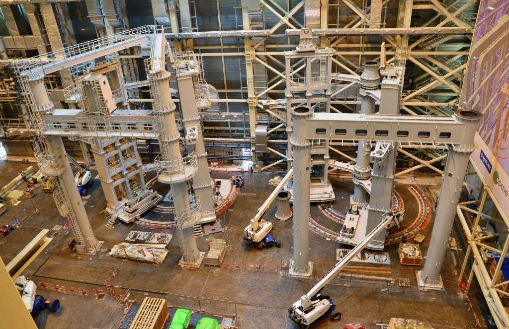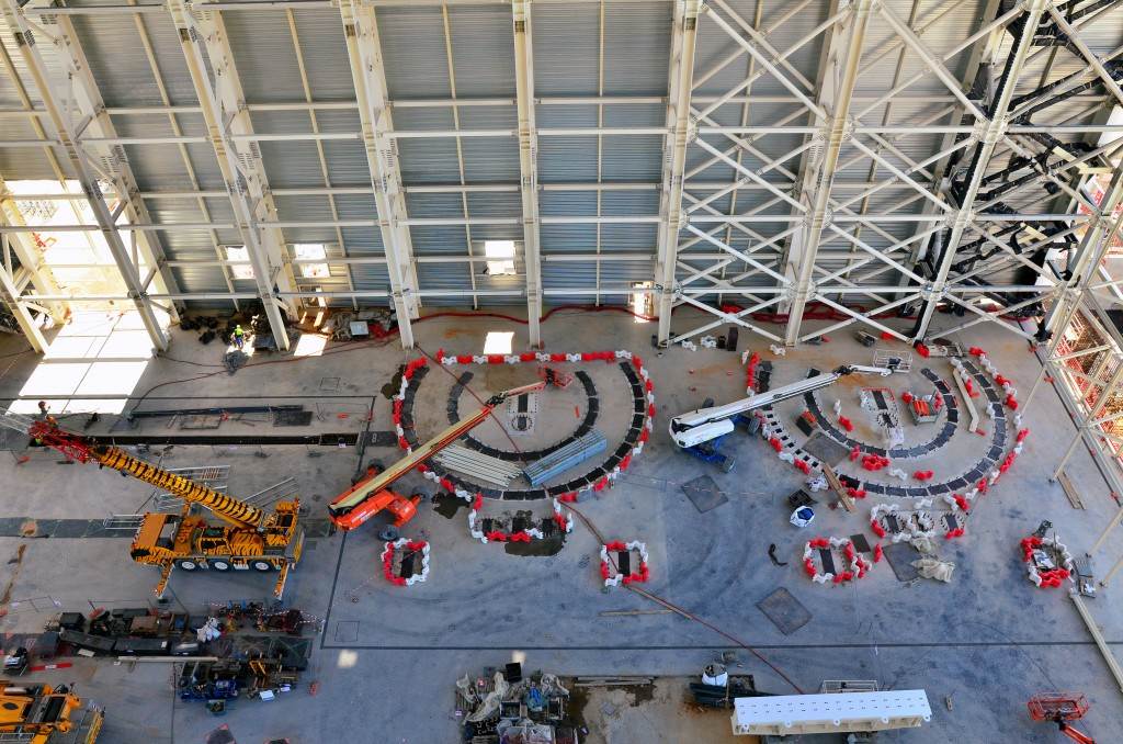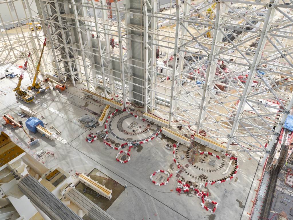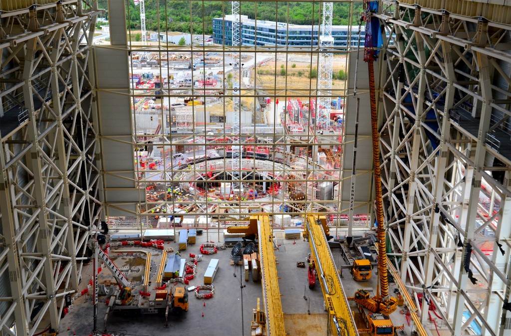 Connected directly to the Tokamak Building, the Assembly Hall is the location for pre-assembly activities on the massive components of the ITER device before they are transported to the Tokamak Pit for installation. This vast workshop hosts custom-made tools as well as two 750-tonne cranes that travel the length of the Assembly and Tokamak buildings.