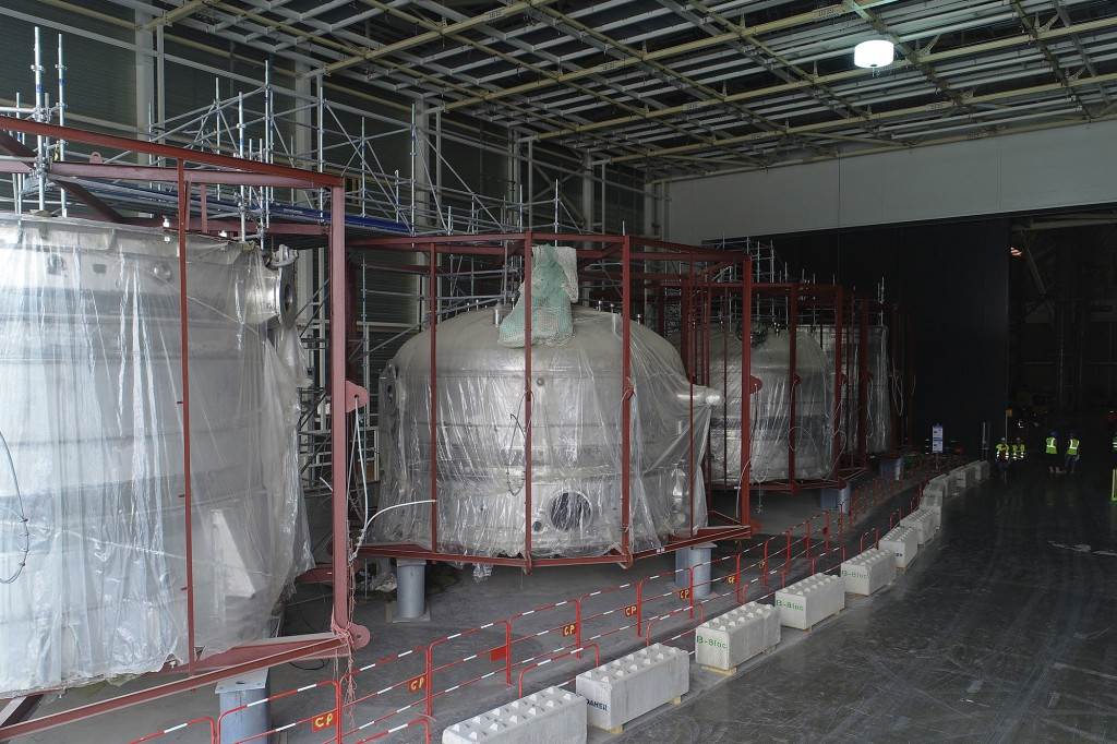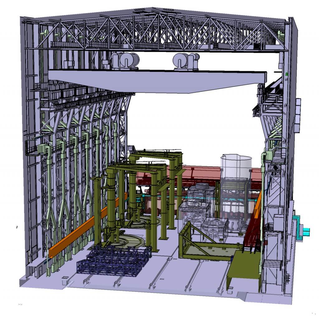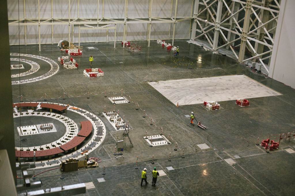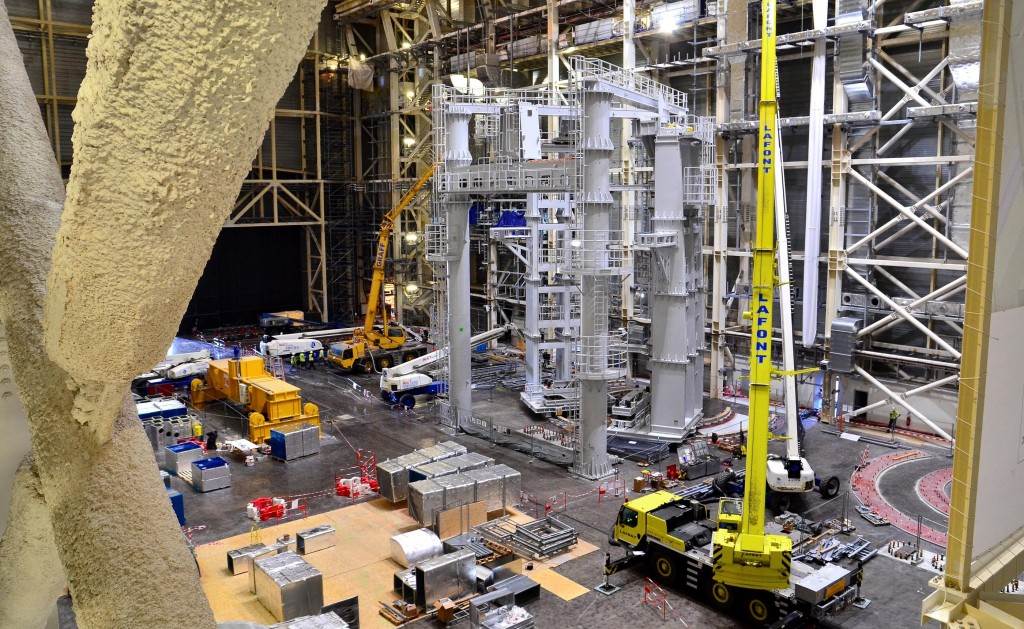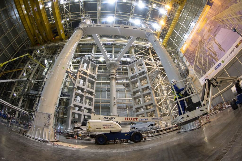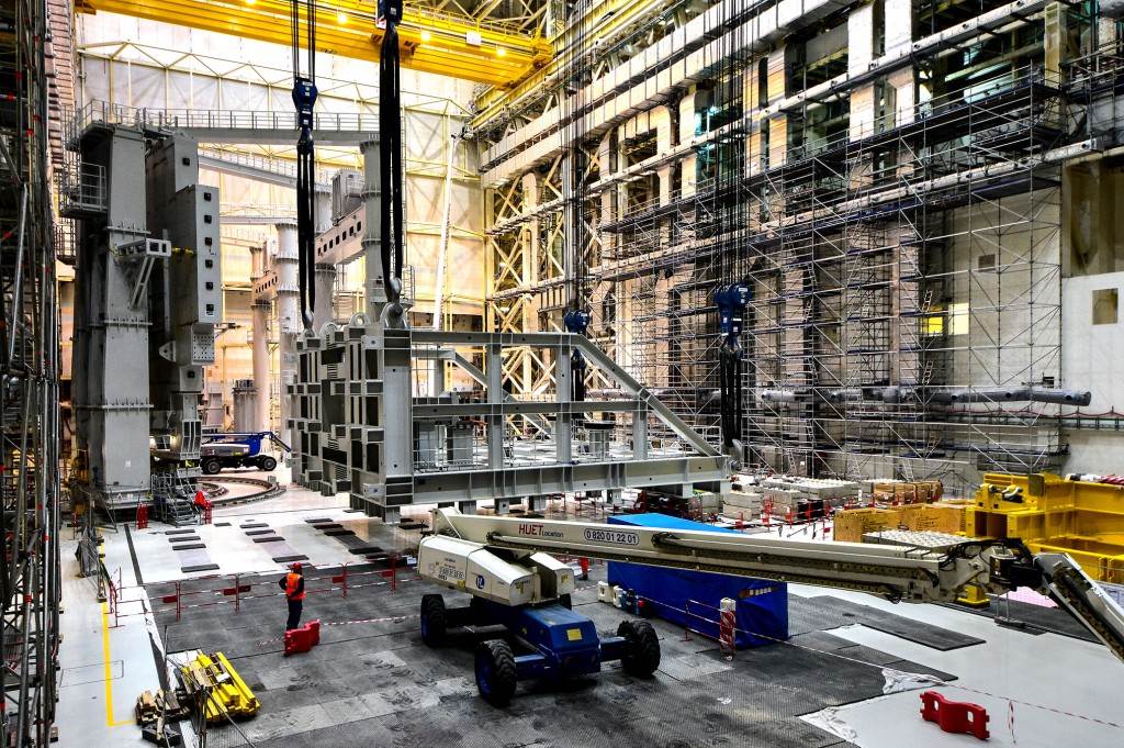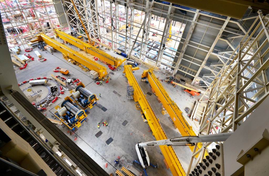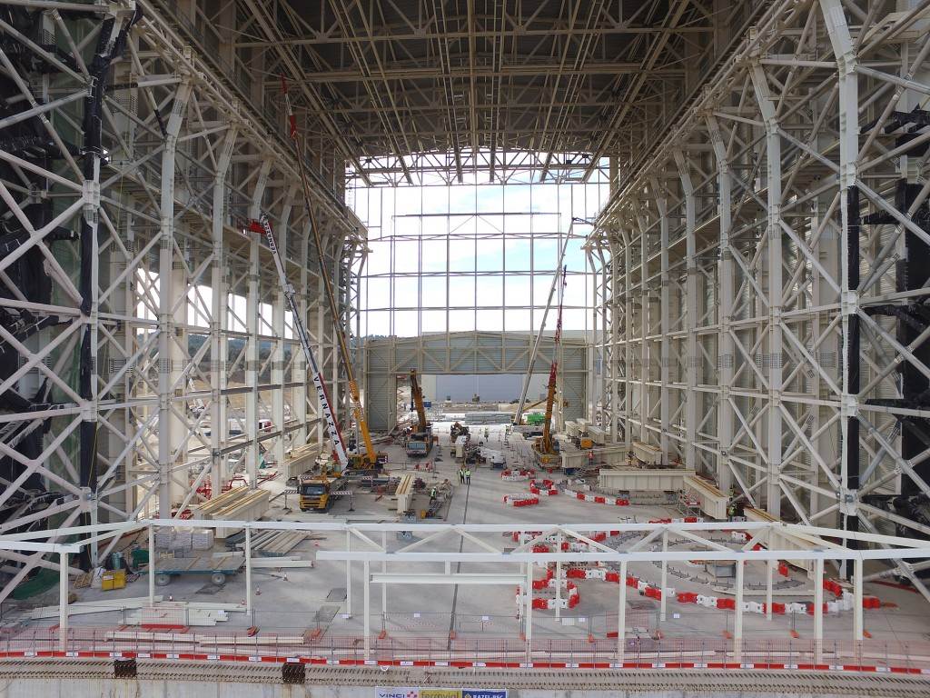 Connected directly to the Tokamak Building, the Assembly Hall is the location for pre-assembly activities on the massive components of the ITER device before they are transported to the Tokamak Pit for installation. This vast workshop hosts custom-made tools as well as two 750-tonne cranes that travel the length of the Assembly and Tokamak buildings.