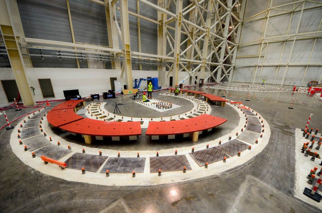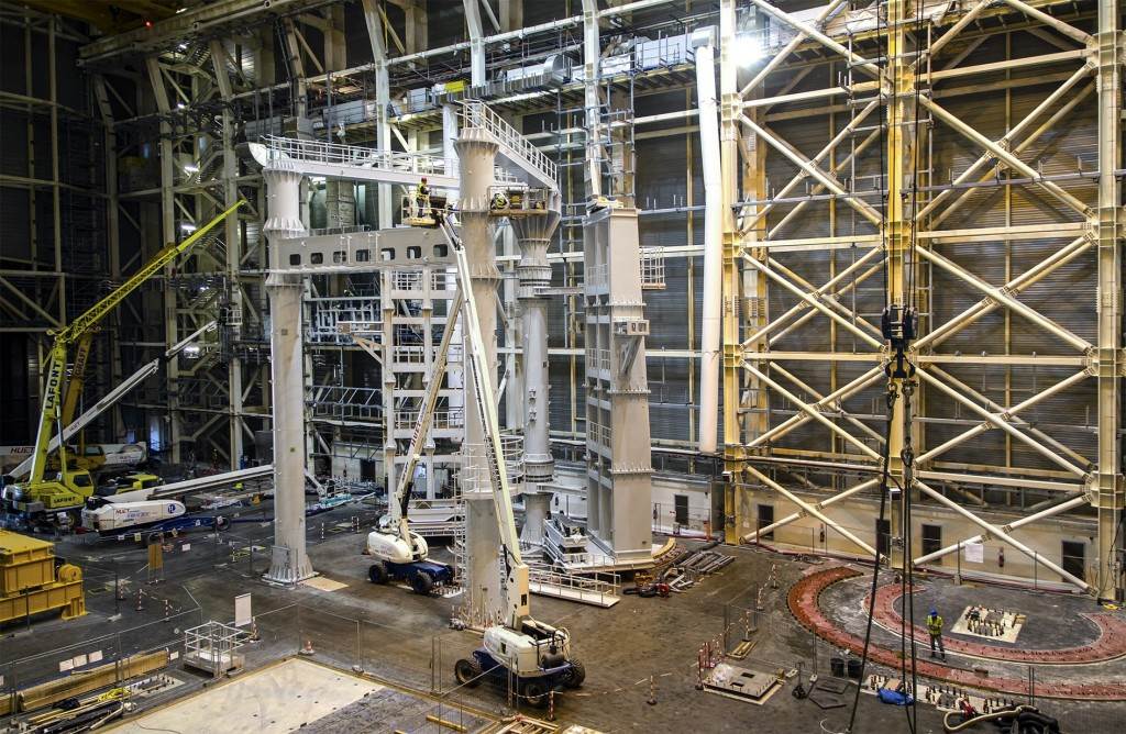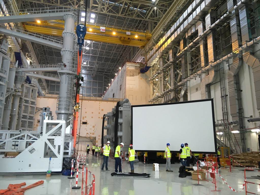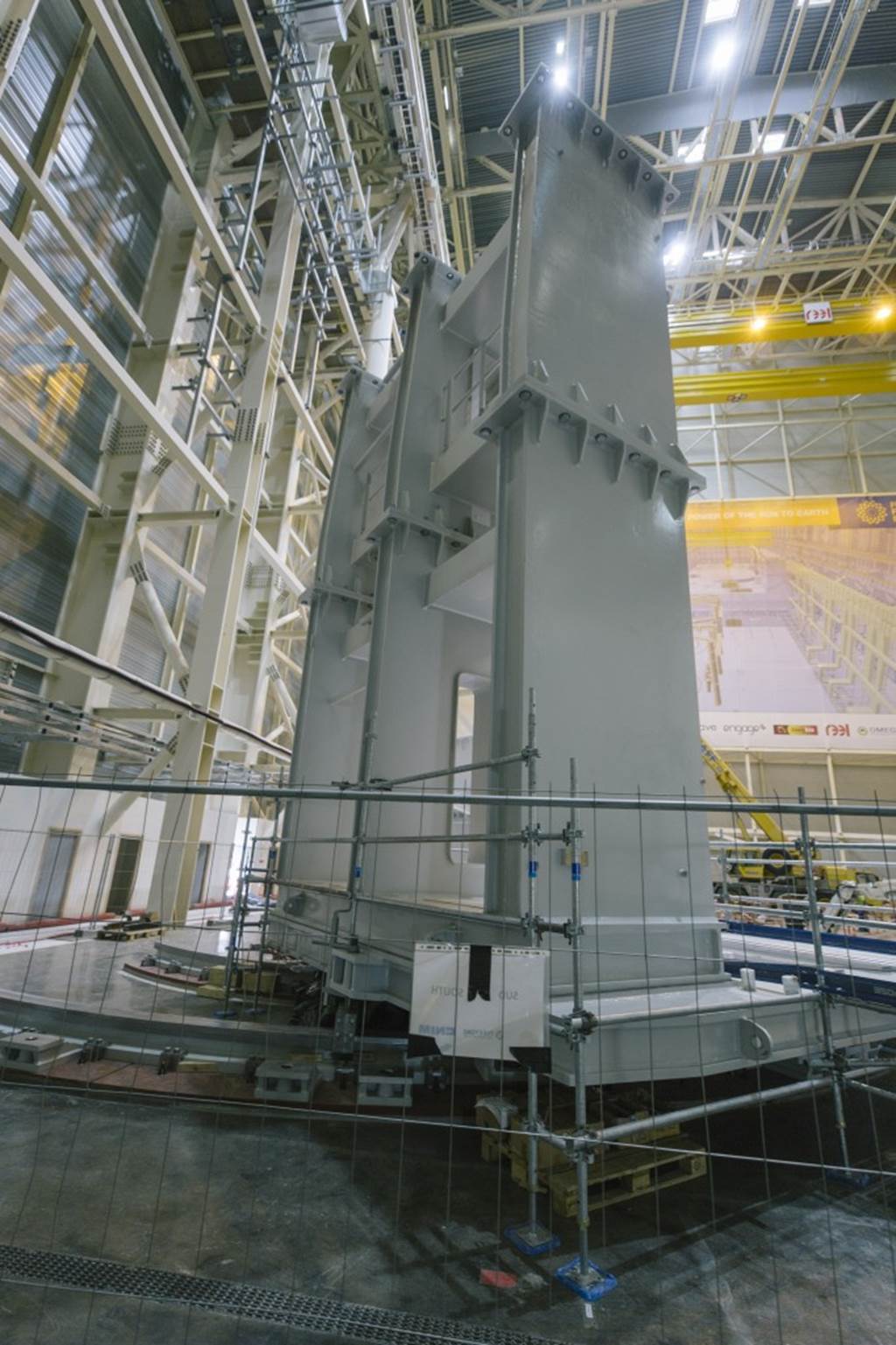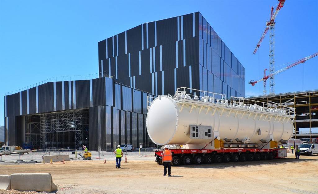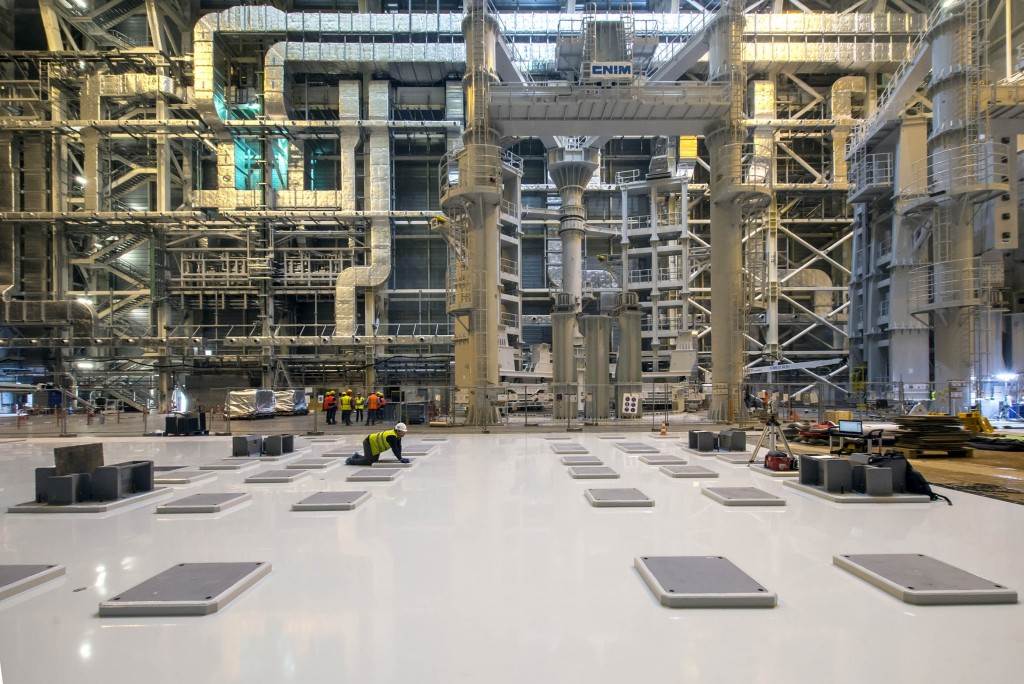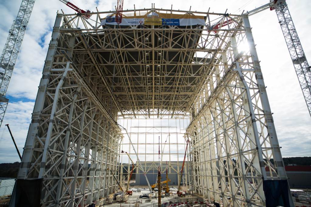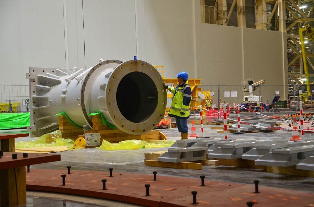 Connected directly to the Tokamak Building, the Assembly Hall is the location for pre-assembly activities on the massive components of the ITER device before they are transported to the Tokamak Pit for installation. This vast workshop hosts custom-made tools as well as two 750-tonne cranes that travel the length of the Assembly and Tokamak buildings.