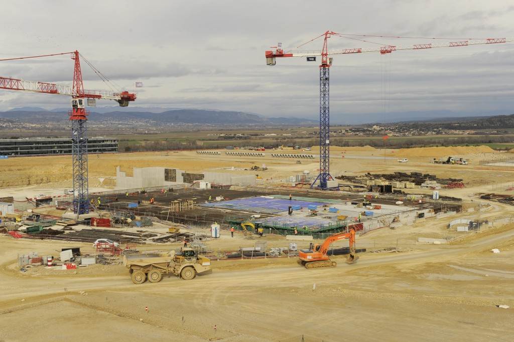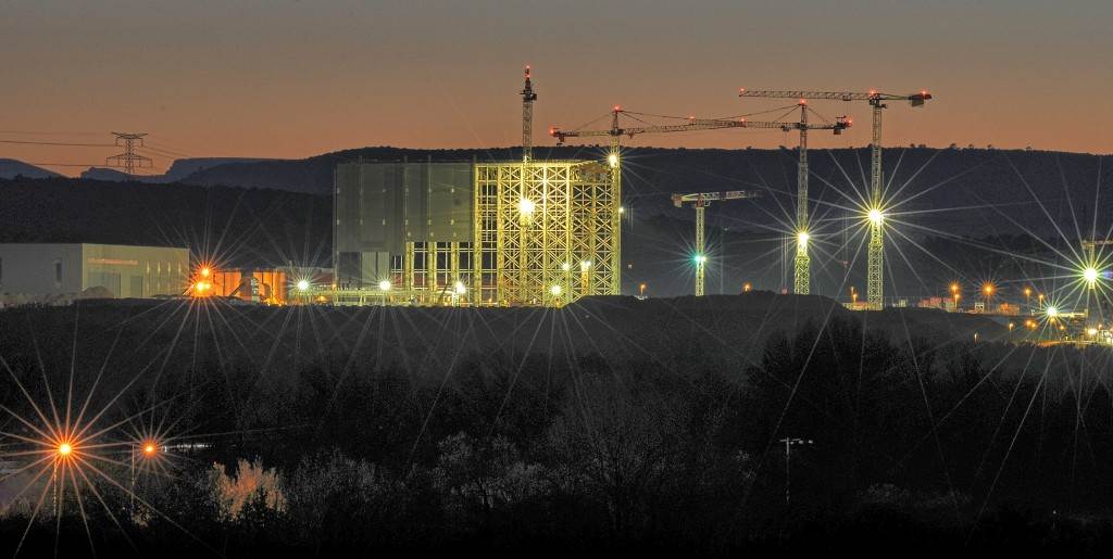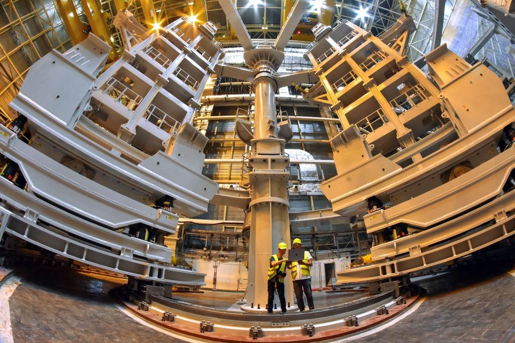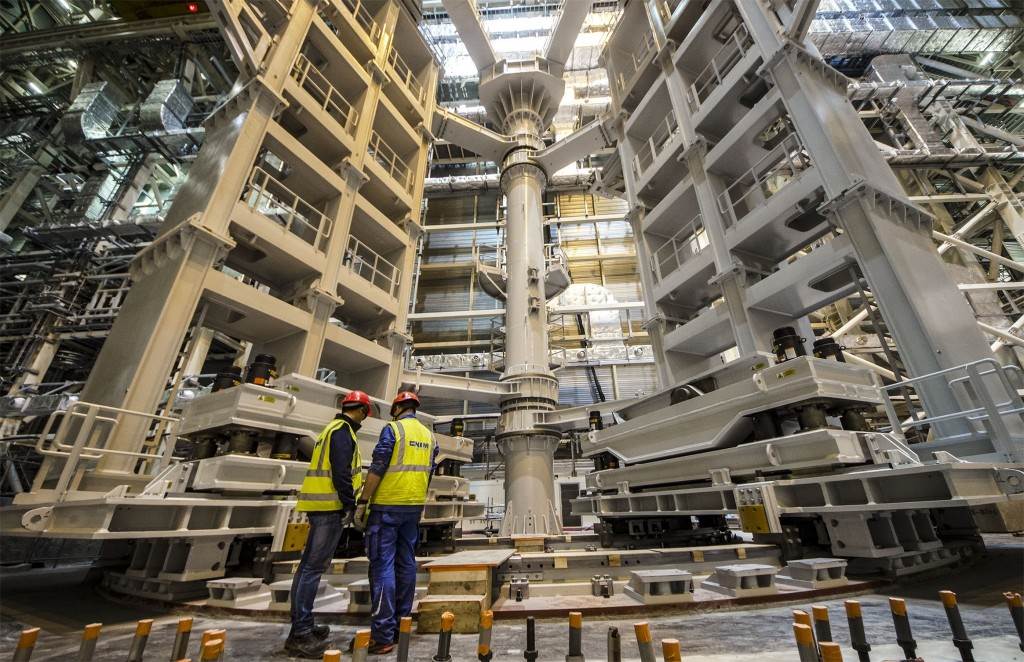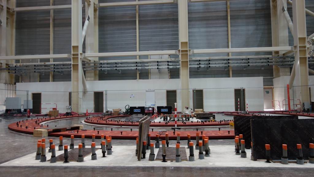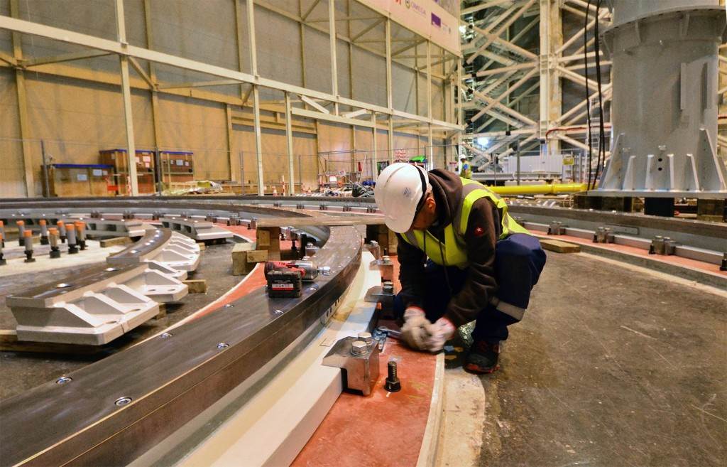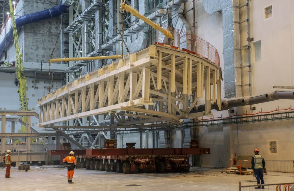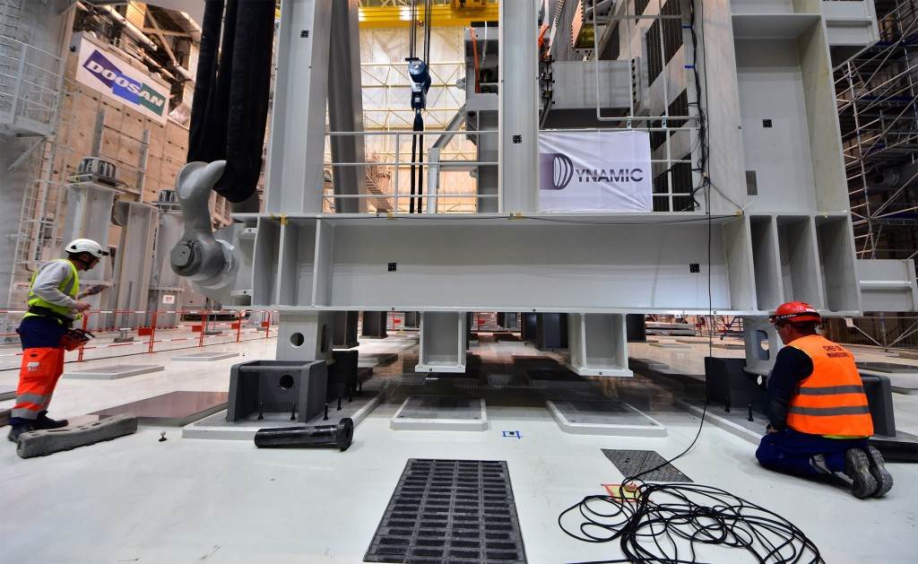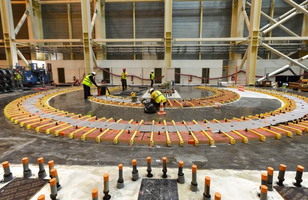 Connected directly to the Tokamak Building, the Assembly Hall is the location for pre-assembly activities on the massive components of the ITER device before they are transported to the Tokamak Pit for installation. This vast workshop hosts custom-made tools as well as two 750-tonne cranes that travel the length of the Assembly and Tokamak buildings.