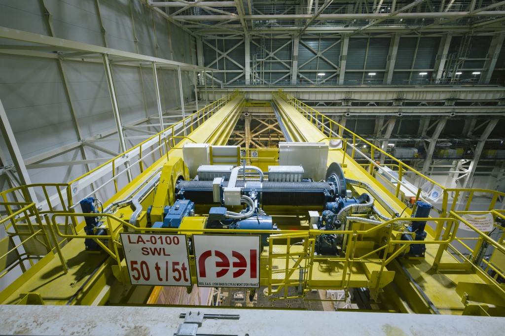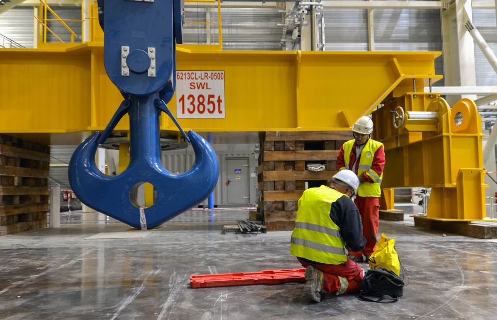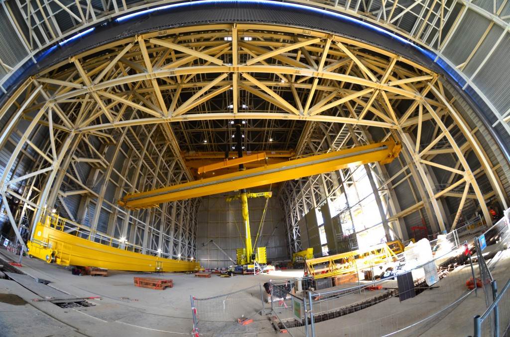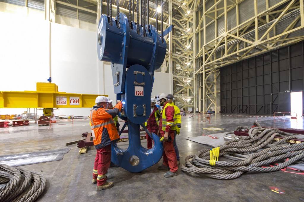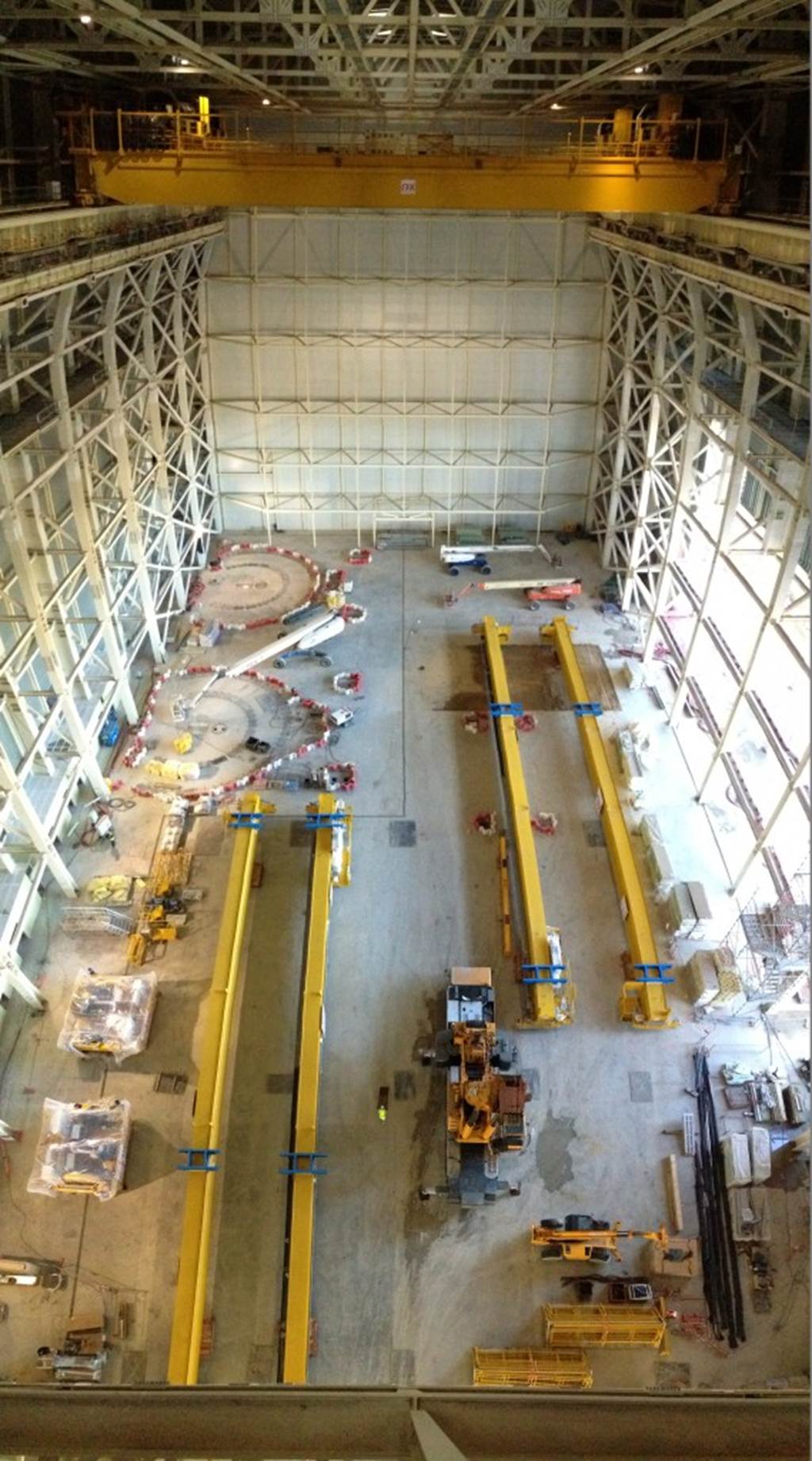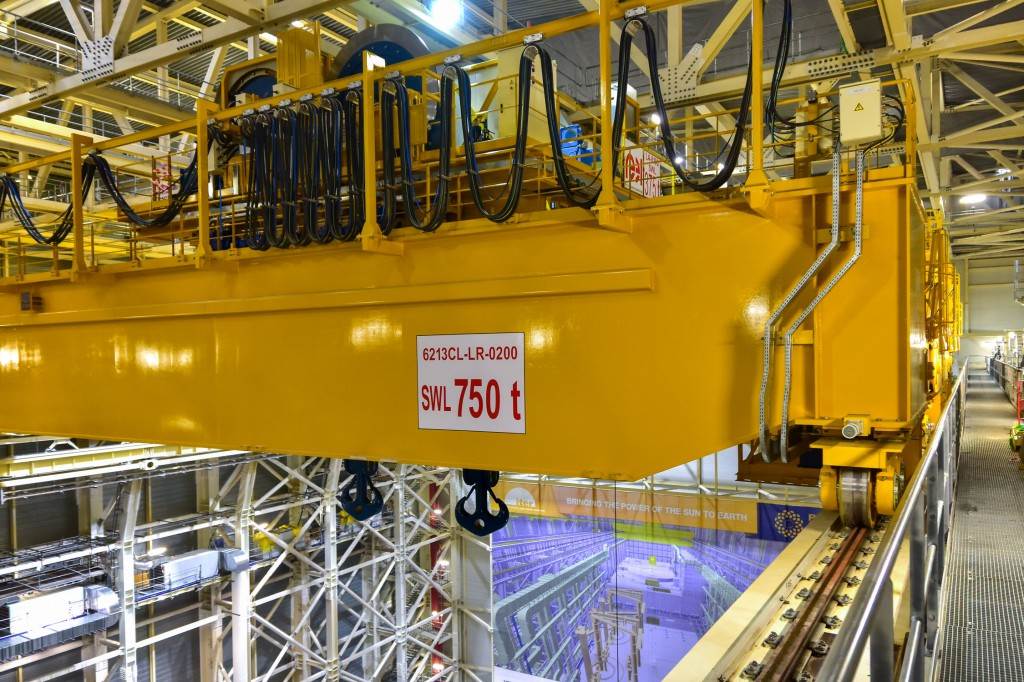 The main hoists of the Assembly Building, capable of handling loads of up to 1,500 tonnes. On the shop floor, some of the specialized tooling required to assemble, lift and finally manoeuver ITER's supersized components.