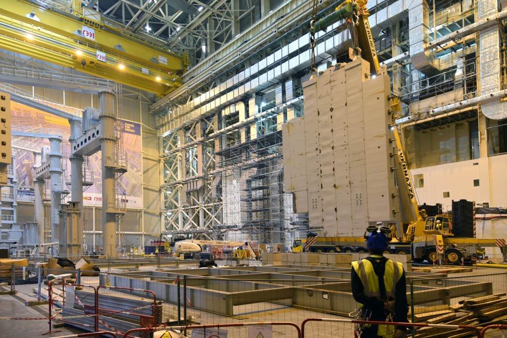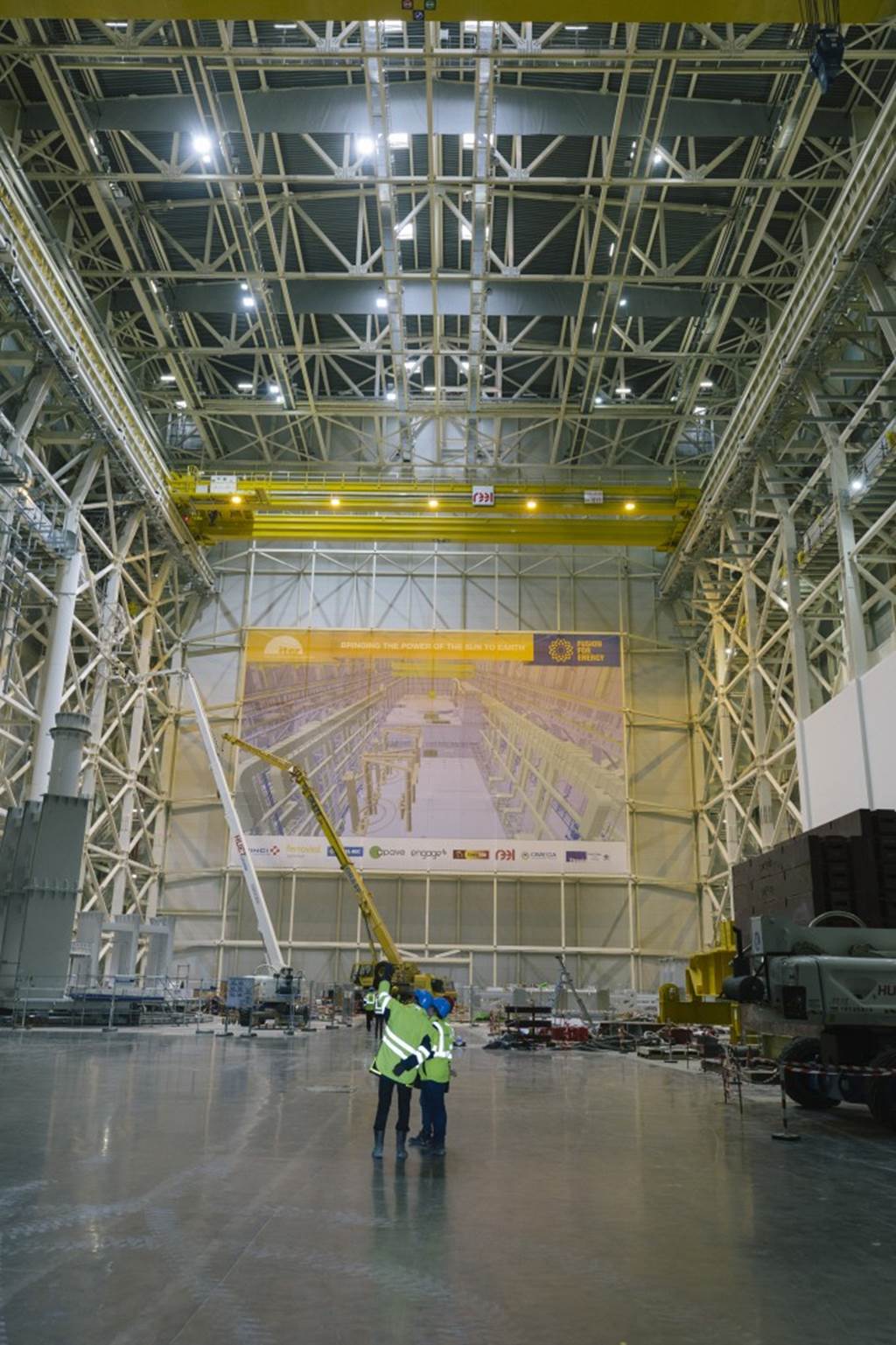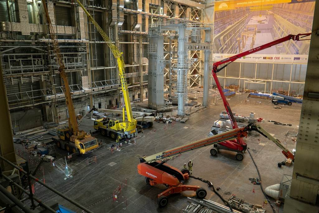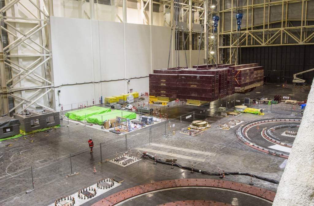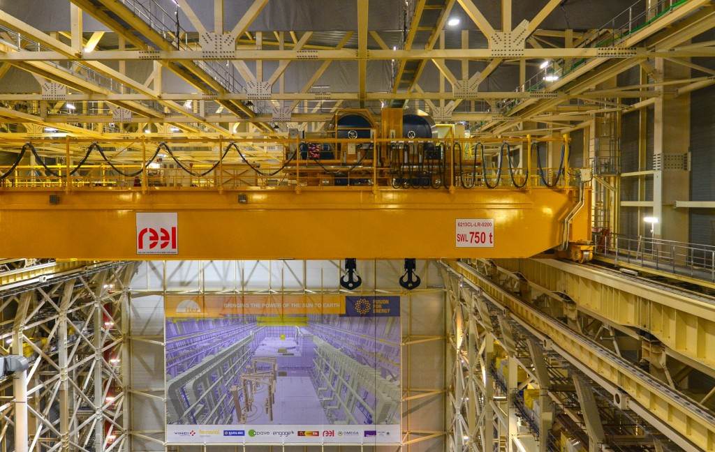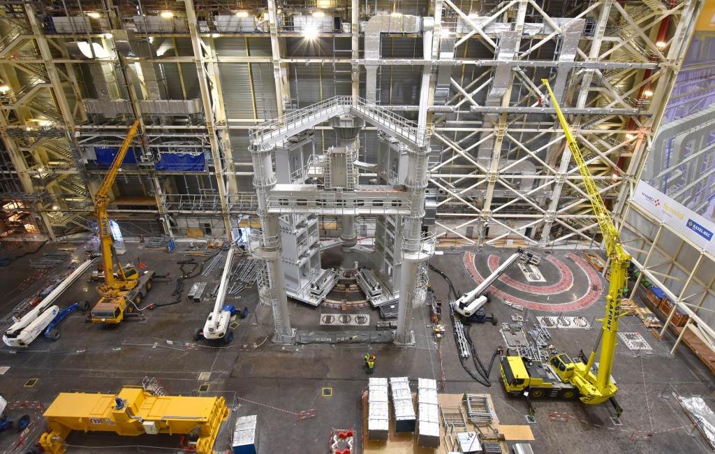 Work on the Assembly Hall began in June 2012 and was completed in September 2015 with the lifting of the massive 730-tonne roof structure. Two 750-tonne overhead cranes and two 50-tonne auxiliary cranes were installed and commissioned; tools for major assembly tasks were also put in place. In March 2020, the temporary wall separating the Assembly Hall from the Tokamak Building was removed, and the crane rails were extended over the Tokamak assembly pit to allow for the start of machine assembly.