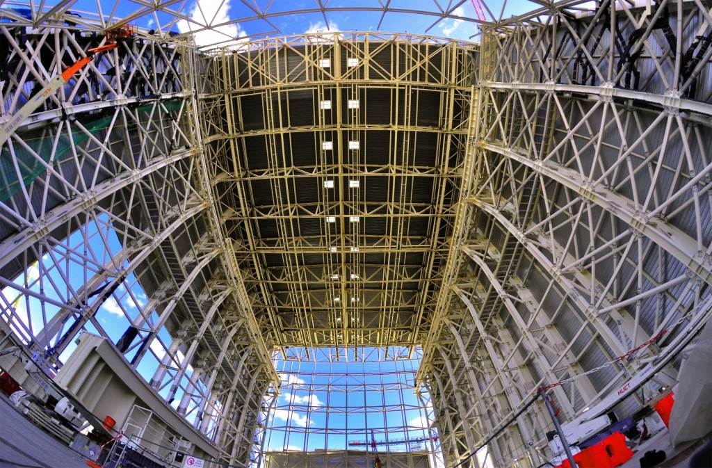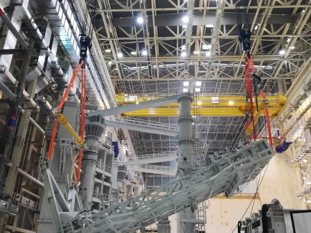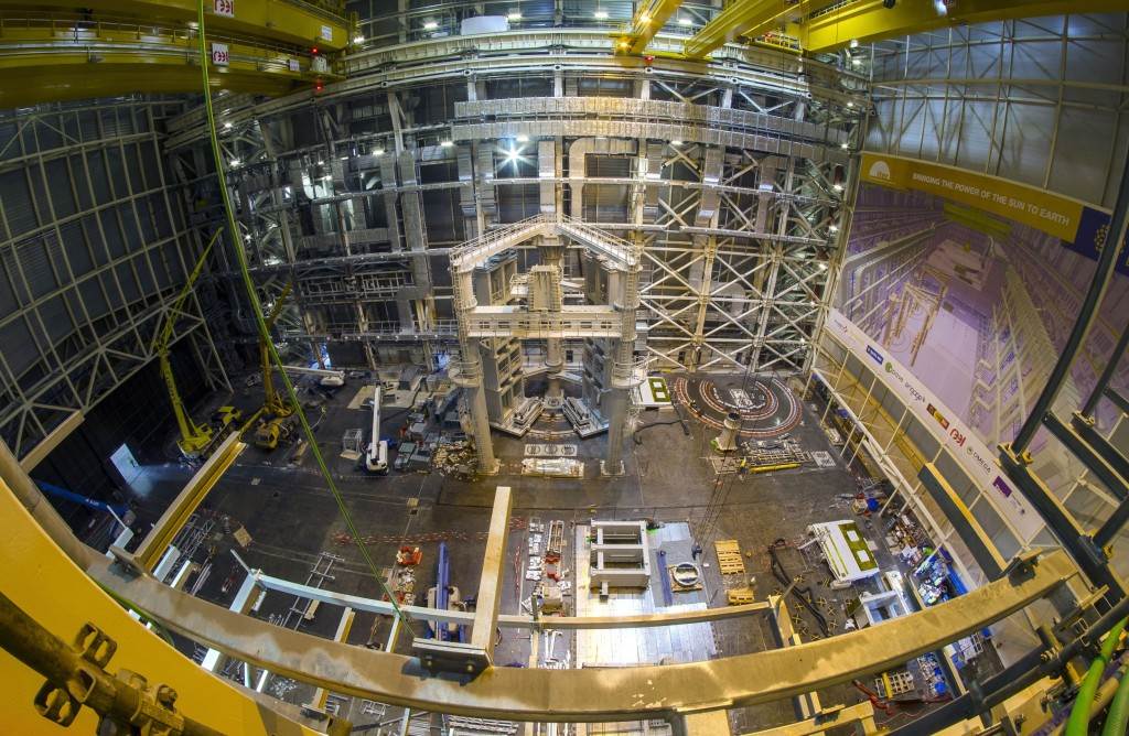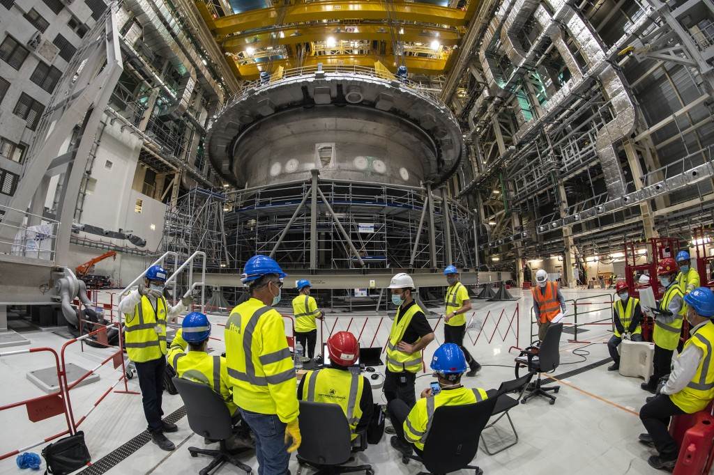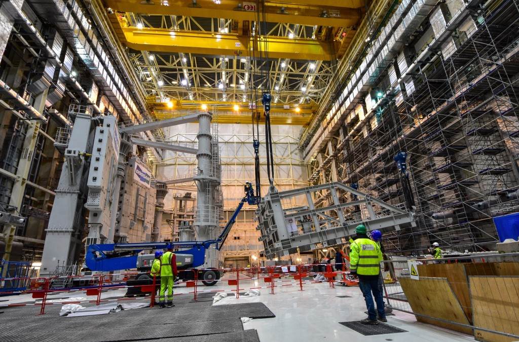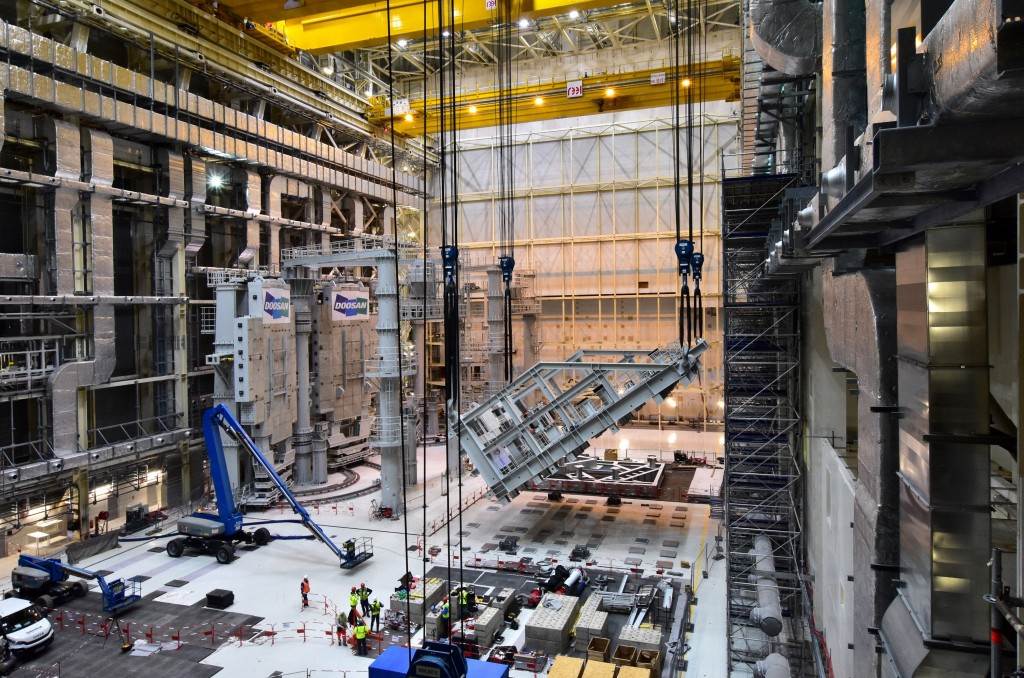 Work on the Assembly Hall began in June 2012 and was completed in September 2015 with the lifting of the massive 730-tonne roof structure. Two 750-tonne overhead cranes and two 50-tonne auxiliary cranes were installed and commissioned; tools for major assembly tasks were also put in place. In March 2020, the temporary wall separating the Assembly Hall from the Tokamak Building was removed, and the crane rails were extended over the Tokamak assembly pit to allow for the start of machine assembly.