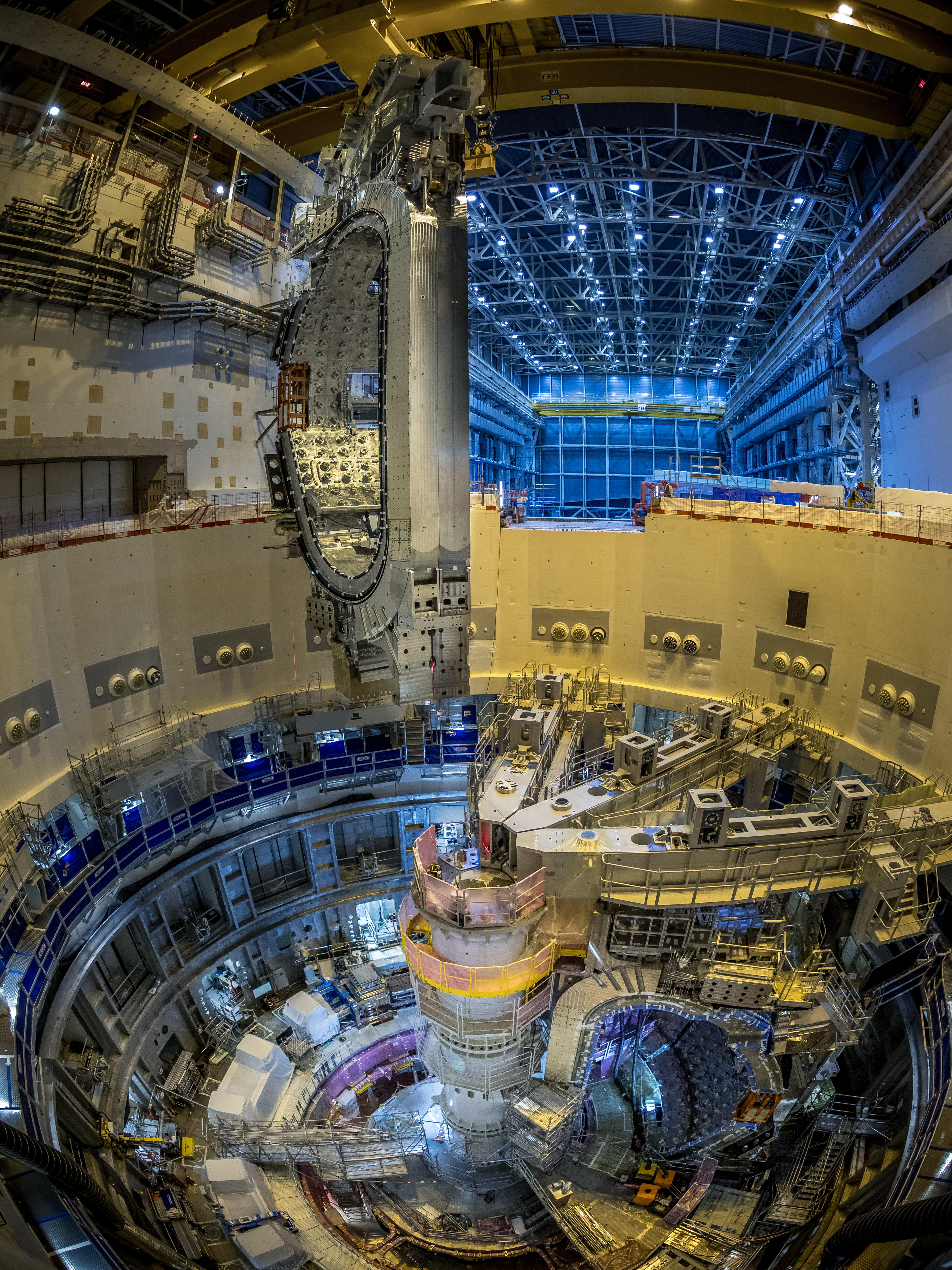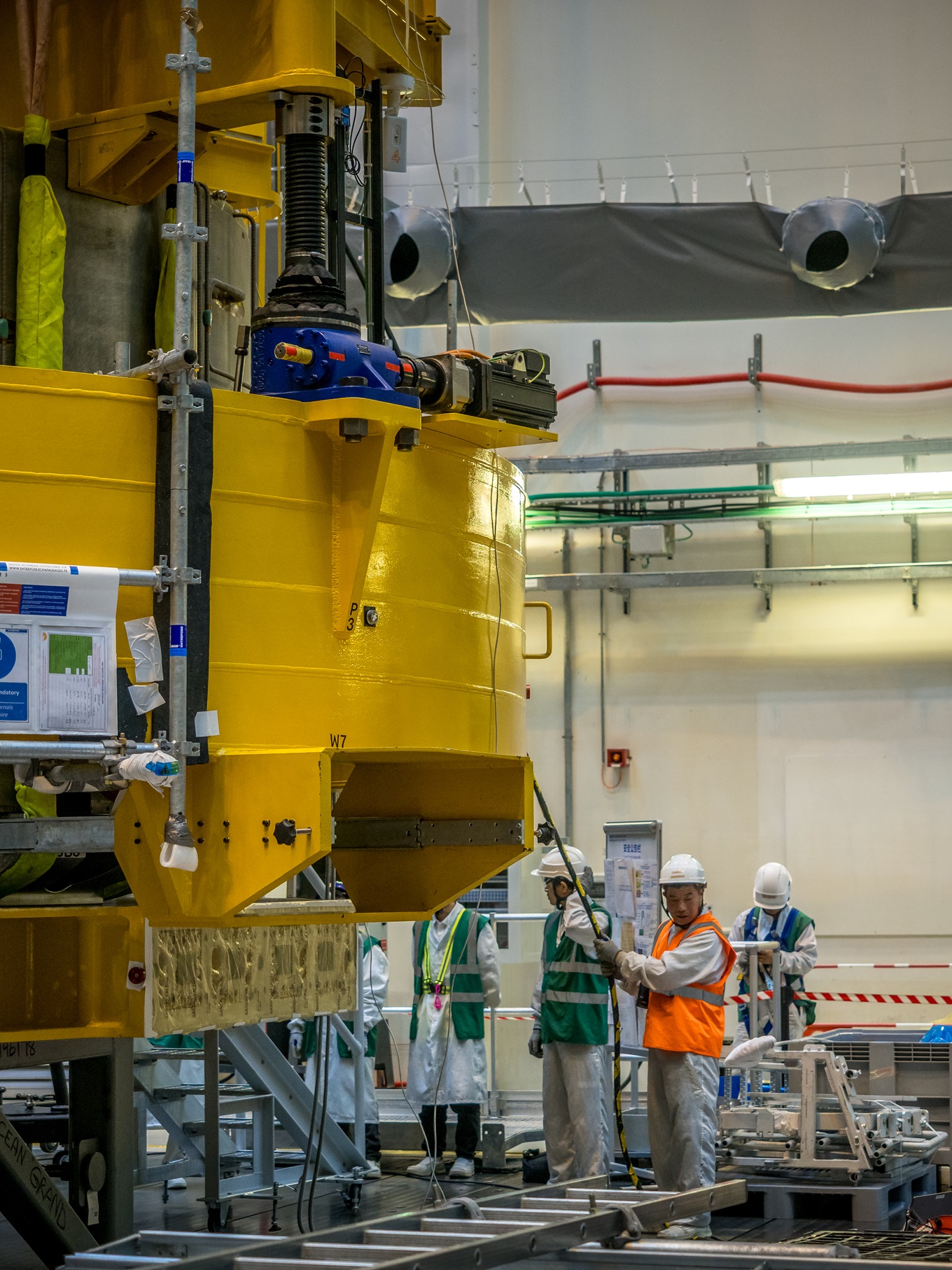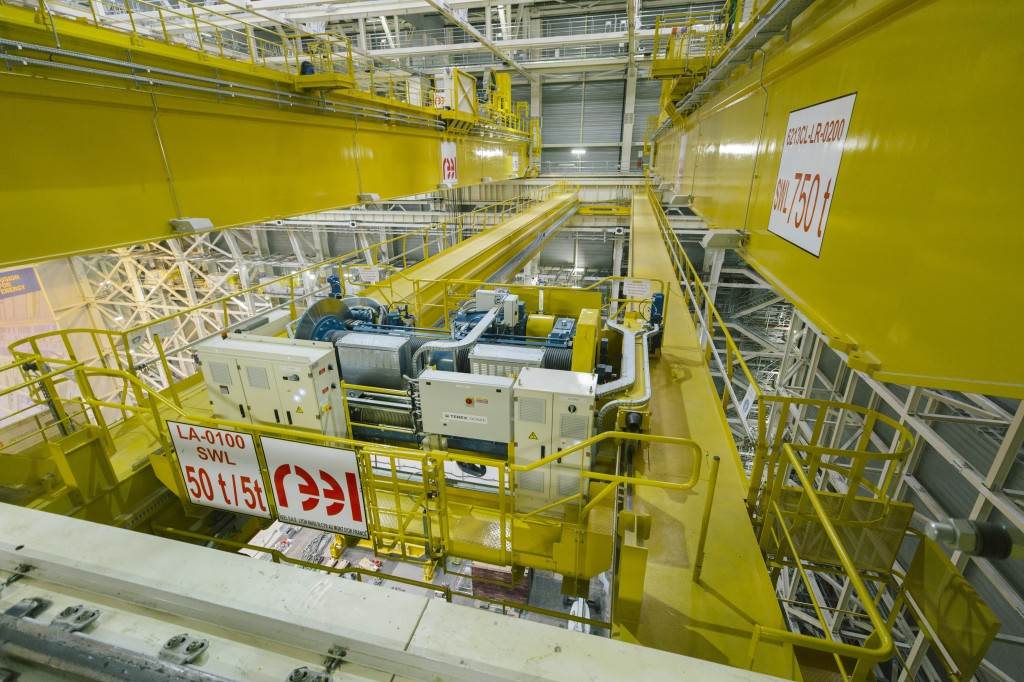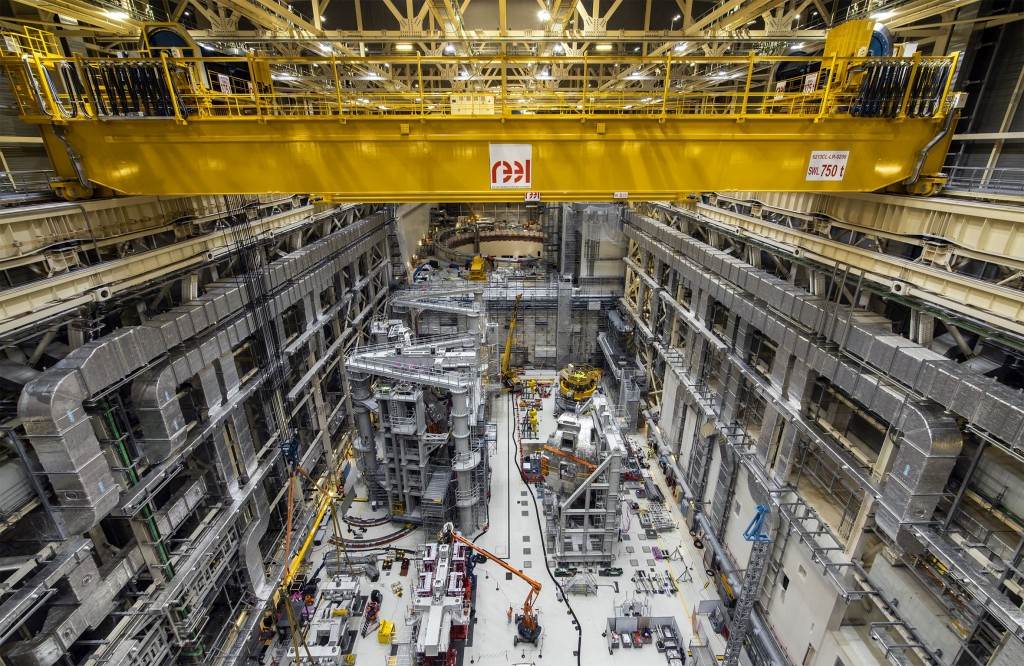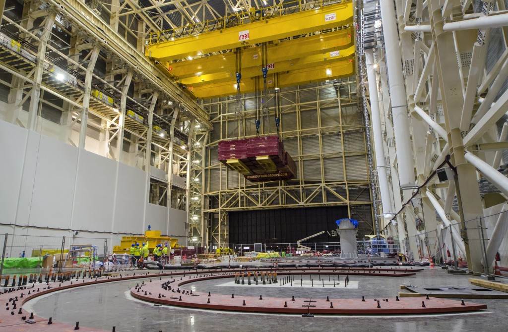 Two sets of bridge cranes installed at a height of 46 metres are the major lift and transport tools for delivering components from the Assembly Hall to the Tokamak pit. The heavy-duty set (two 750-tonne cranes) can work together to lift loads of 1,500 tonnes—or the approximate weight of four jetliners. The system is complemented by two smaller 50-tonne auxiliary cranes. (Procured by Europe)