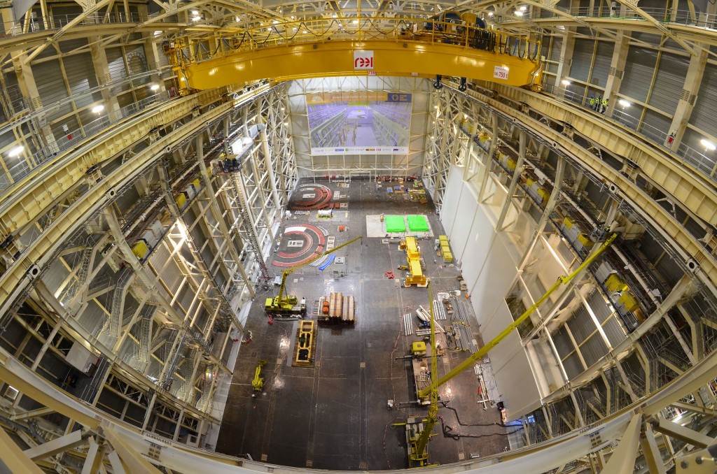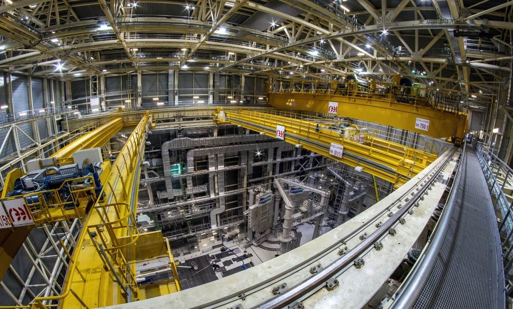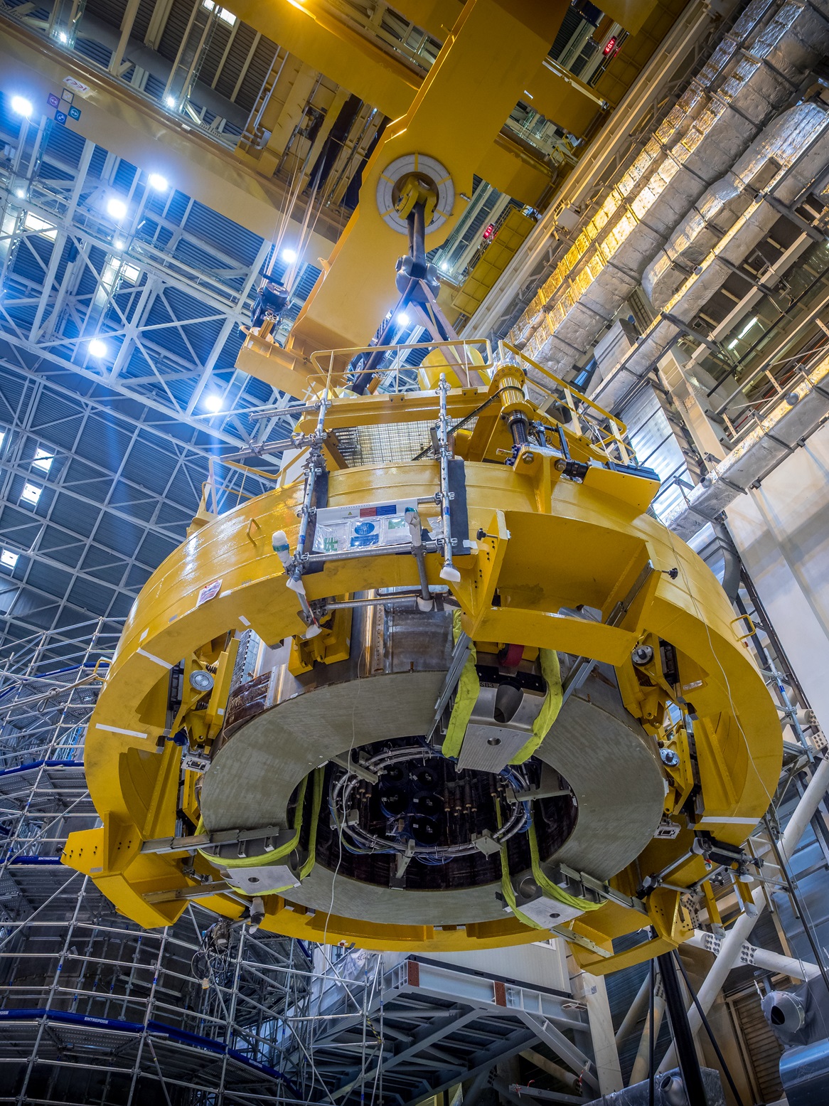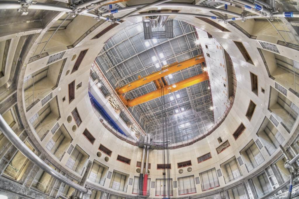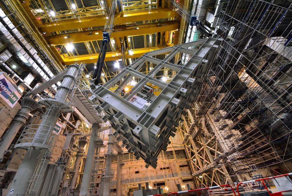 Two sets of bridge cranes installed at a height of 46 metres are the major lift and transport tools for delivering components from the Assembly Hall to the Tokamak pit. The heavy-duty set (two 750-tonne cranes) can work together to lift loads of 1,500 tonnes—or the approximate weight of four jetliners. The system is complemented by two smaller 50-tonne auxiliary cranes. (Procured by Europe)