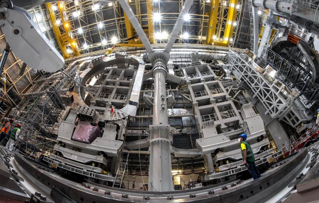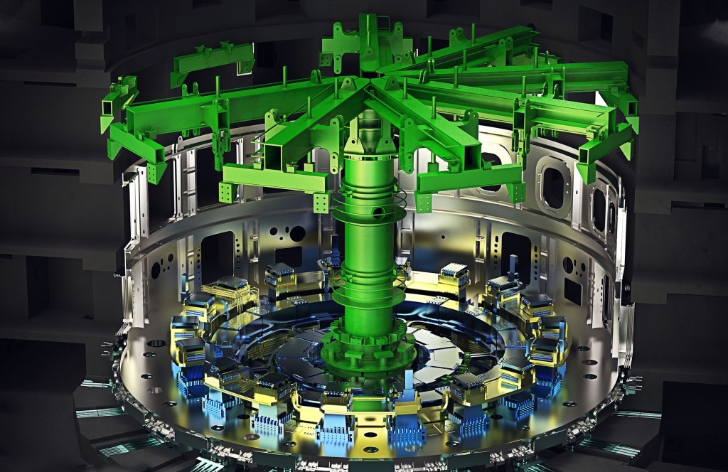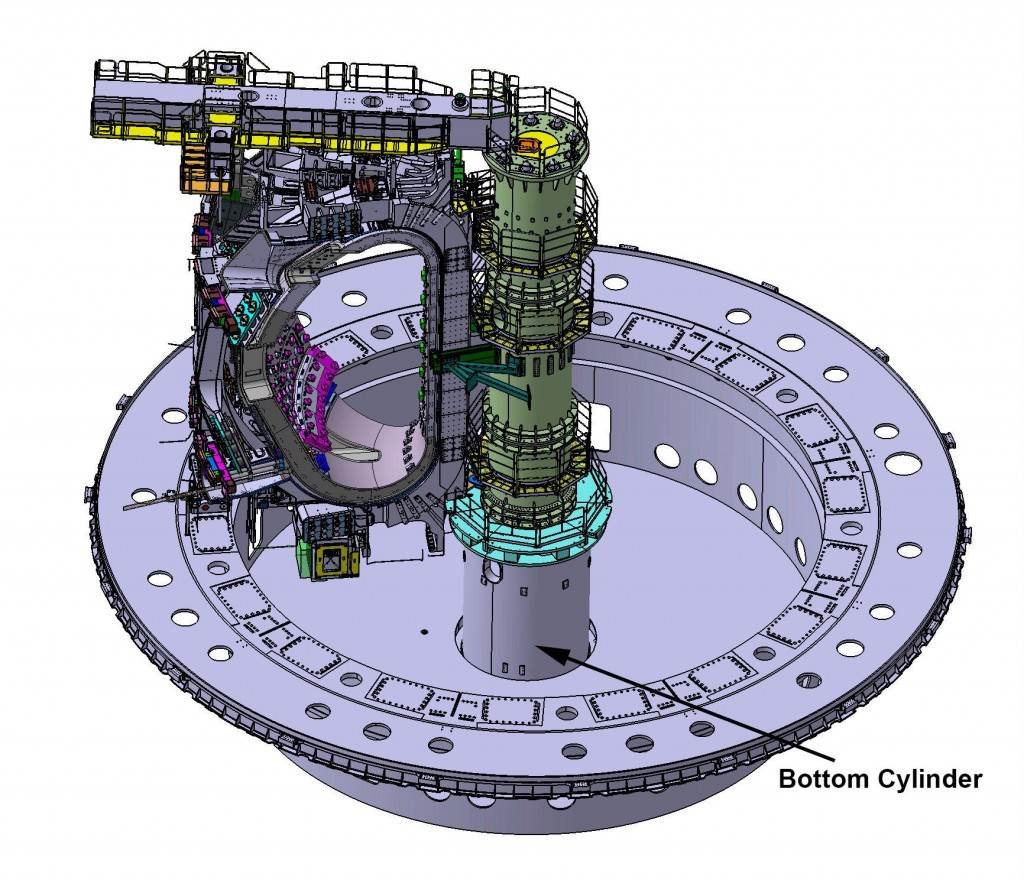 Formed from a central column and nine radial beams, this tool is installed inside of the Tokamak Pit to support, align and stabilize vacuum vessel sub-assemblies as they are joined and welded. With the central column anchored to the Tokamak Building basemat and the radial beams supported between the column and the concrete bioshield, the in-pit assembly tool is designed to support a nominal weight of 5,400 tonnes. (Procured by Korea)