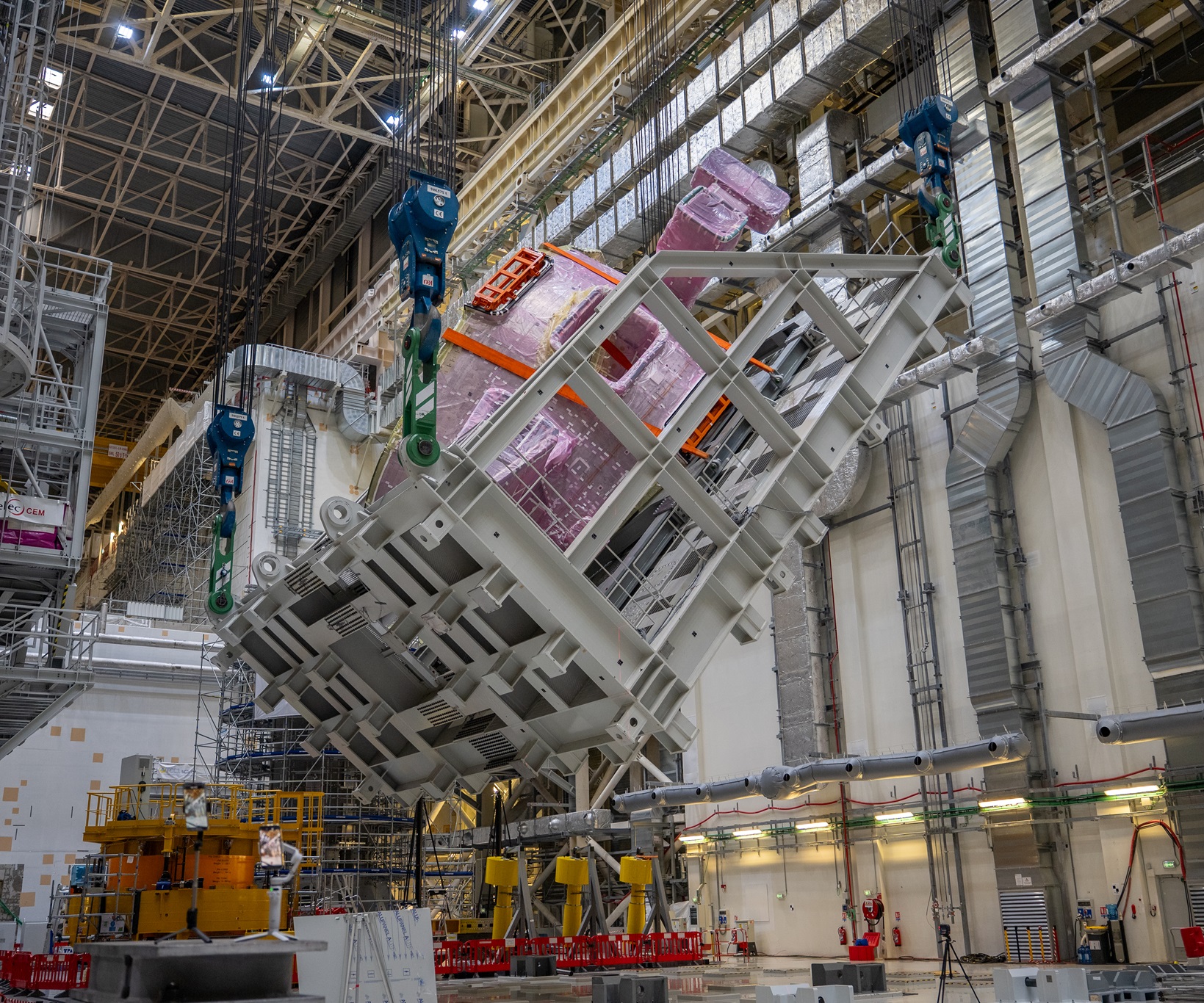 Standing six storeys high in the Assembly Hall, the 800-tonne tools suspend the vacuum vessel sectors while carefully positioning and installing—via the rotary motion of the "wings"—thermal shield panels and two toroidal field coils. Actuators will permit the components to be positioned with the highest degree of accuracy (1.5 mm for the toroidal field coils) and adjusted to six degrees of freedom (up and down, side-to-side, forward and backward, swivel, tilt, and pivot). The completed "sector sub-assembly" to be transported to the Tokamak pit weighs 1,200 tonnes. The operation must be carried out nine times, for nine vacuum vessel sectors. (Procured by Korea)
