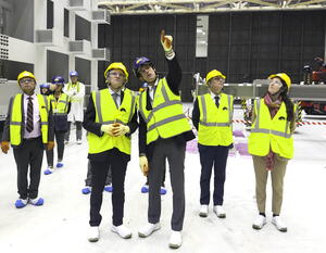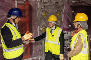 IAEA Director General Rafael Grossi and CEA Chairman Anne-Isabelle Etienvre listen to the ITER Director-General's explanations inside the tokamak pit.