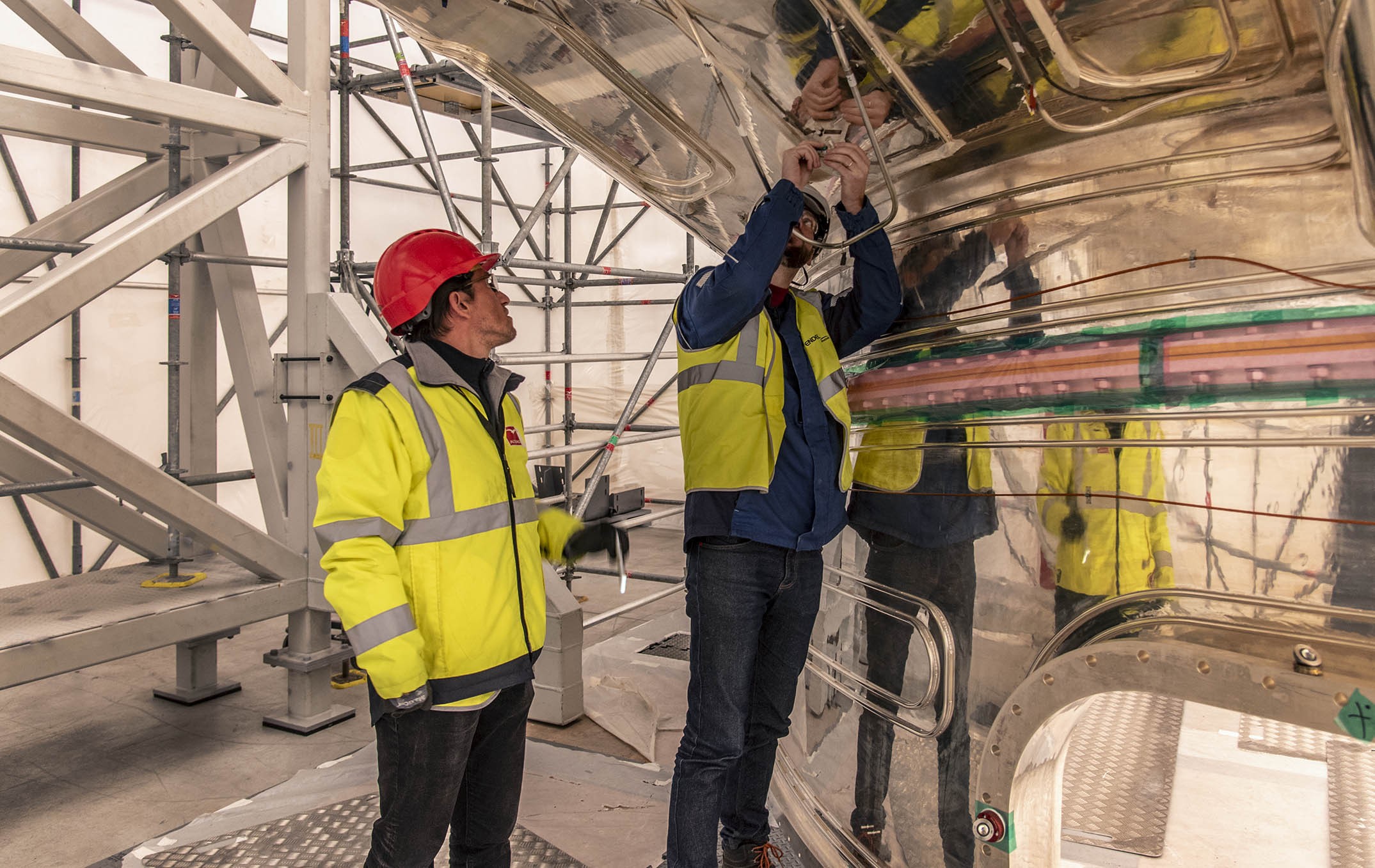 The discovery of major defects in two of the components making up these sector modules brought vacuum vessel sub-assembly works to a halt and mobilized resources inside the ITER Organization to identify the root causes of the defects and to explore different repair options. The ITER team worked with experts from the ITER Domestic Agencies, professional organizations from the ITER Members, and research institutes such as CEA, CERN and professional welding institutes to arrive at its final strategy, and with industrial partners to test its assumptions through mock-ups and trials. The repair campaign would be handled under three separate contracts—one for the repair of thermal shield panels, a second for the manufacturing of new thermal shield panels, and a third for vacuum vessel bevel repair.
