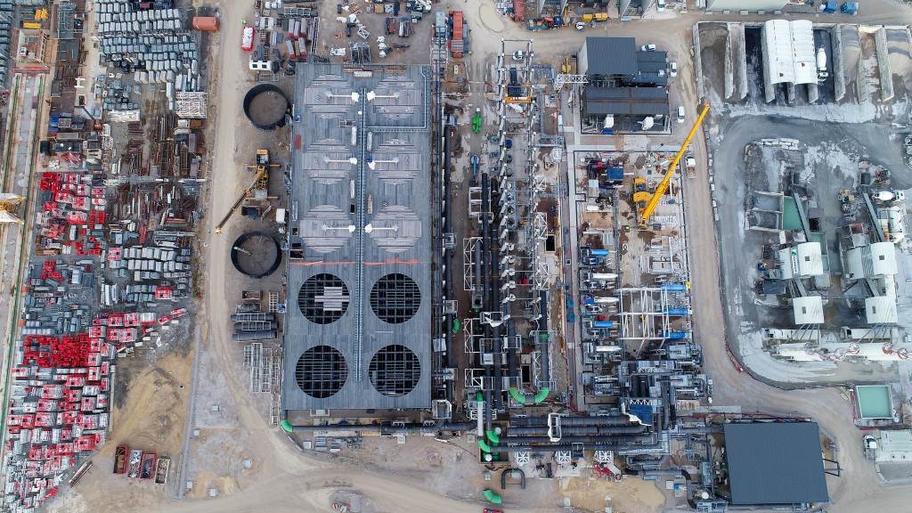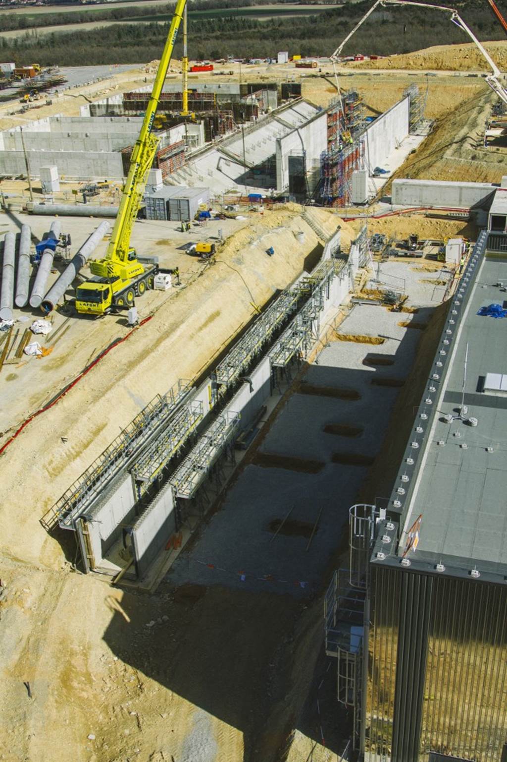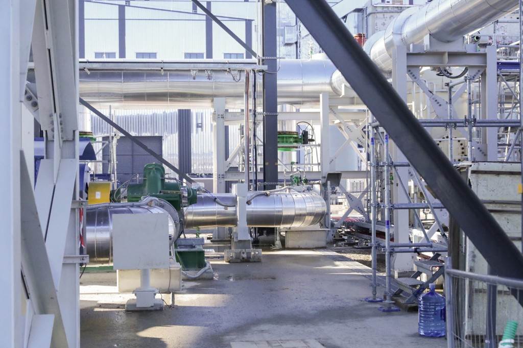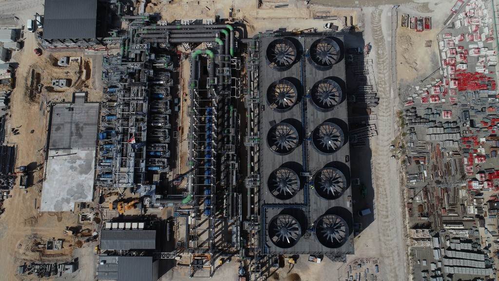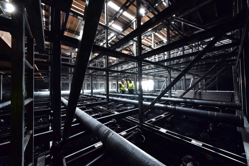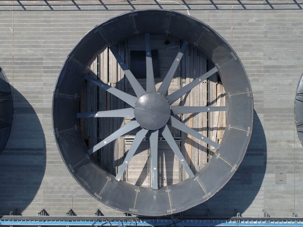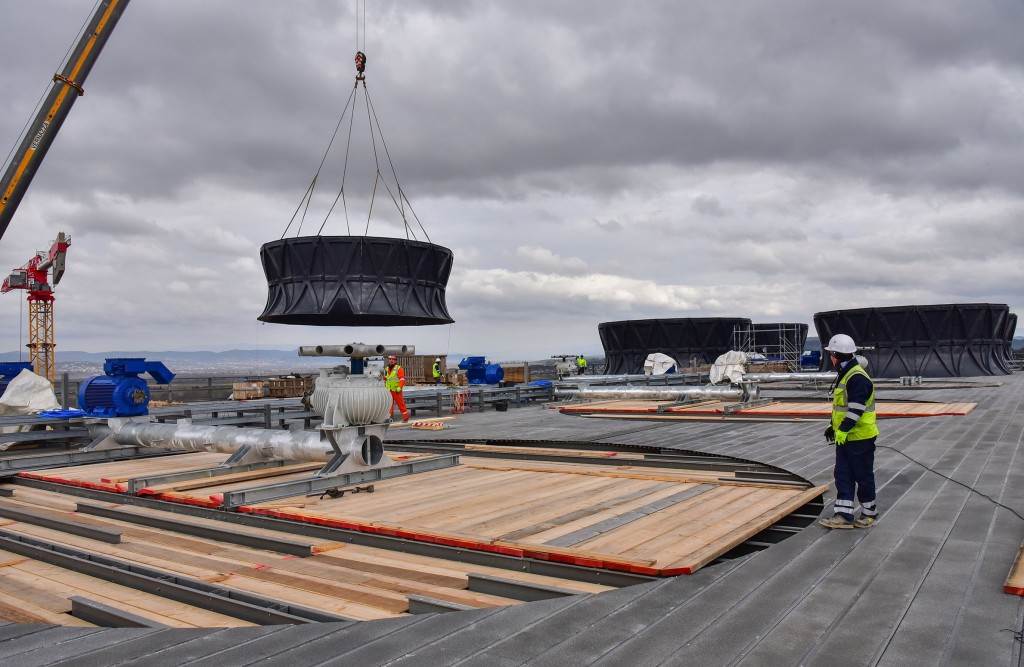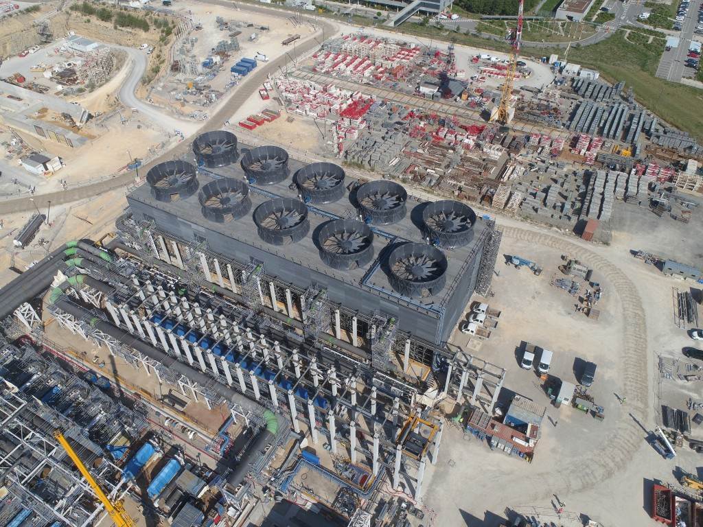 The heat rejection infrastructure is concentrated in a 6,000-square-metre area that comprises hot and cold cooling water basins, powerful pumps, heat exchangers, and an induced-draft cooling tower with ten individual cells.