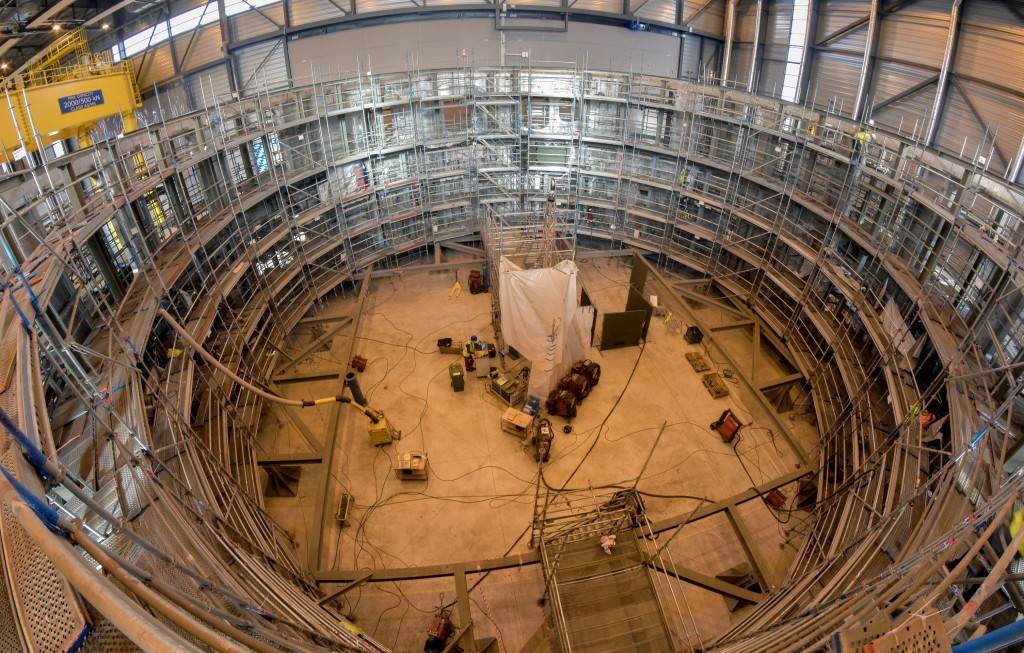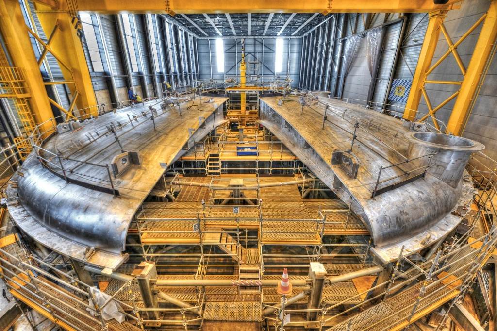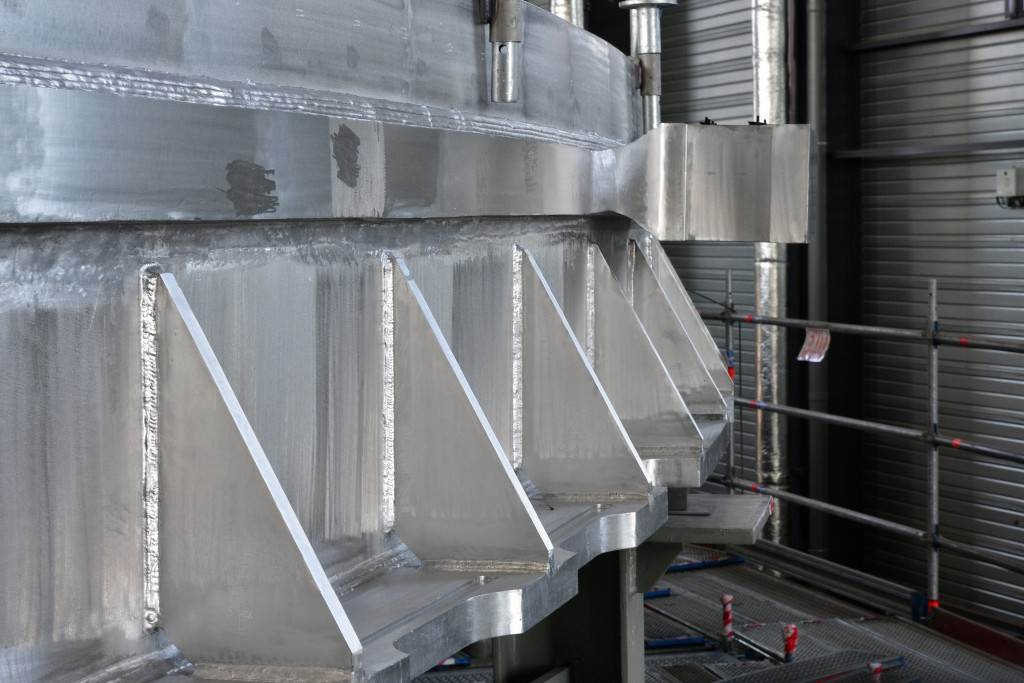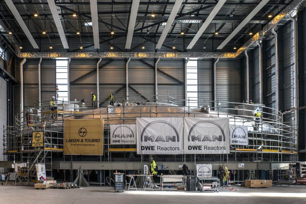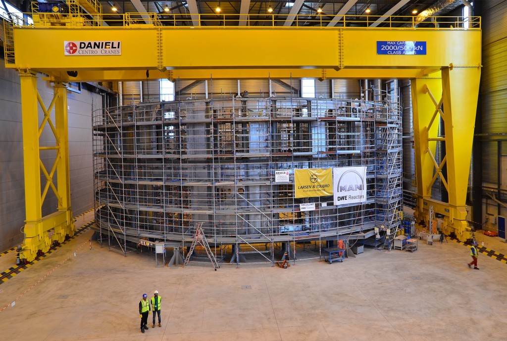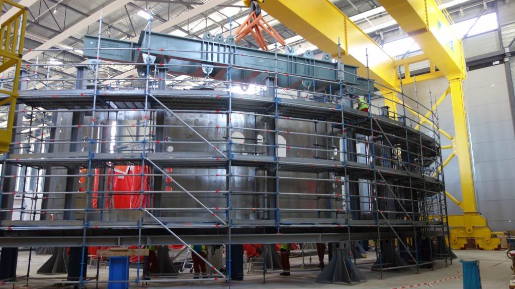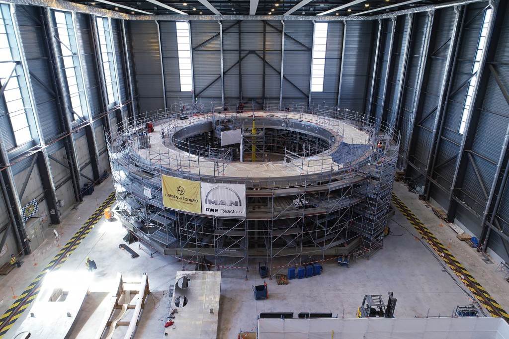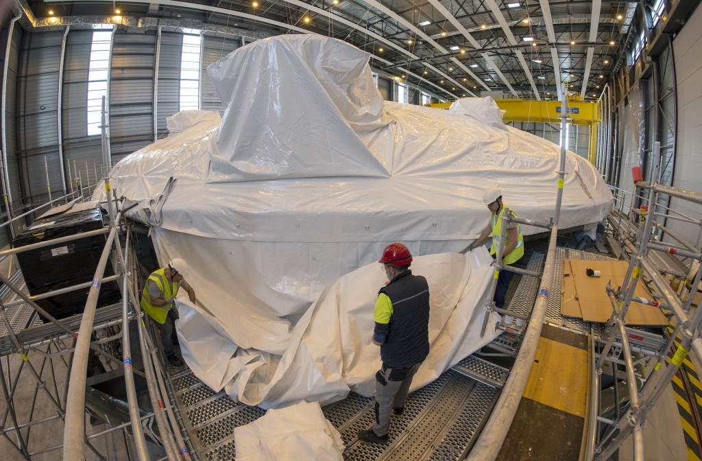 The less-complex lower cylinder (375 tonnes) was assembled in two years, and completed in 2019, while the upper cylinder and top lid were completed in 2020 and 2022 respectively. The top lid is considered the most complex of the sections because of its 3D profile.