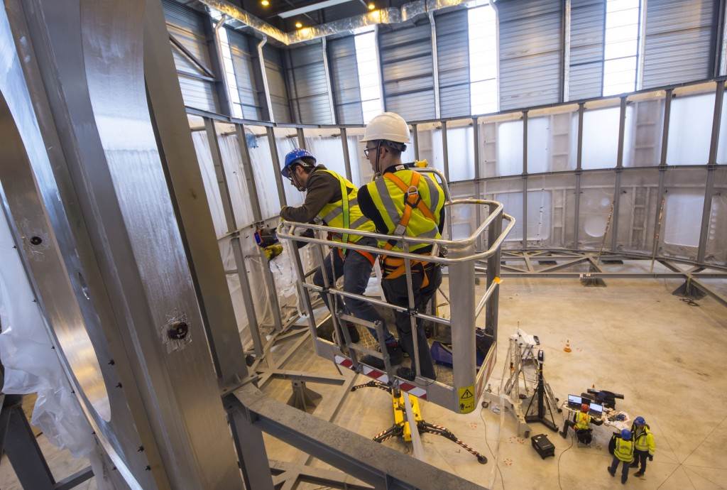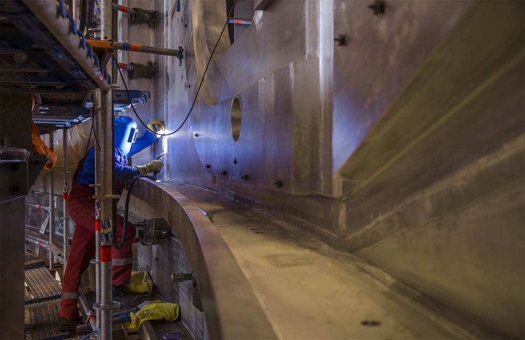 Using optical metrology techniques and strict dimensional control, operators carefully aligned the segments to be welded. A small team of highly specialized technicians—working singly or in teams (one above, one below)—filled the gaps between each segment with weld material. Given the importance of high vacuum in the cryostat, each weld was verified through a variety of leak detection techniques.