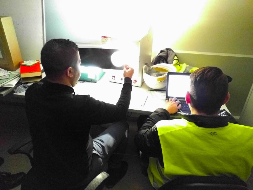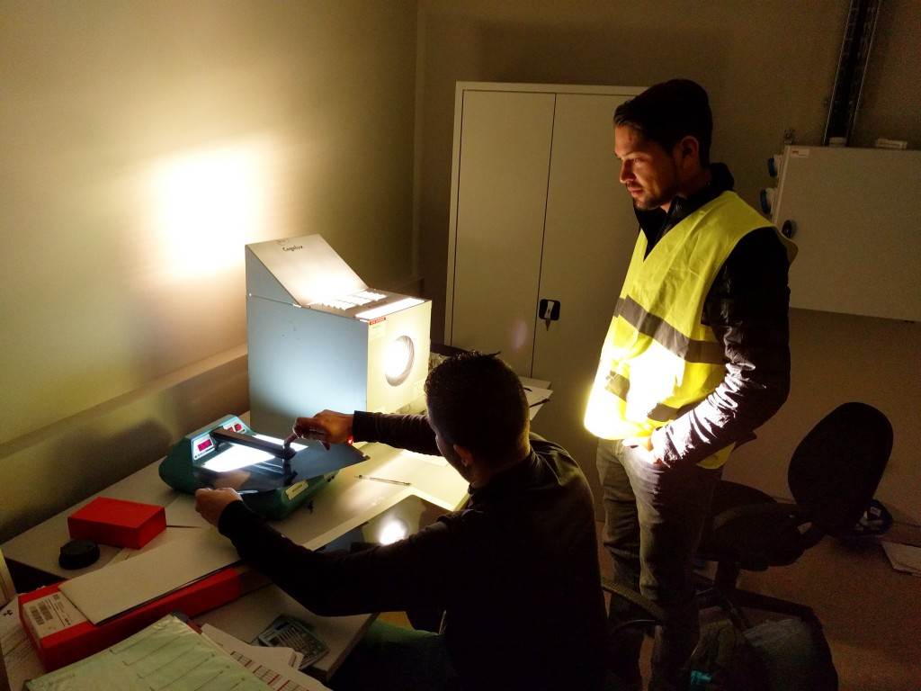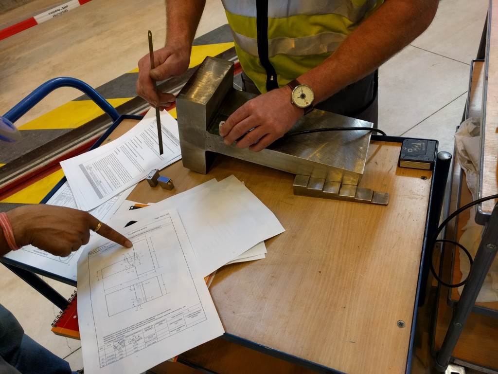 In helium leak detection, one-metre sections of the weld to be verified were "enclosed" within leak-tight boxes positioned on opposite surfaces. Helium injected on one side of the weld is detected—if it has filtered through a crack—by a mass spectrometer on the other side, thereby signalling a leak that must be repaired by grinding out the faulty weld and replacing it.