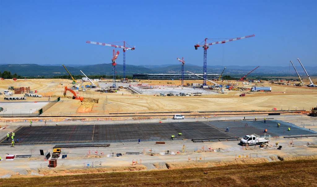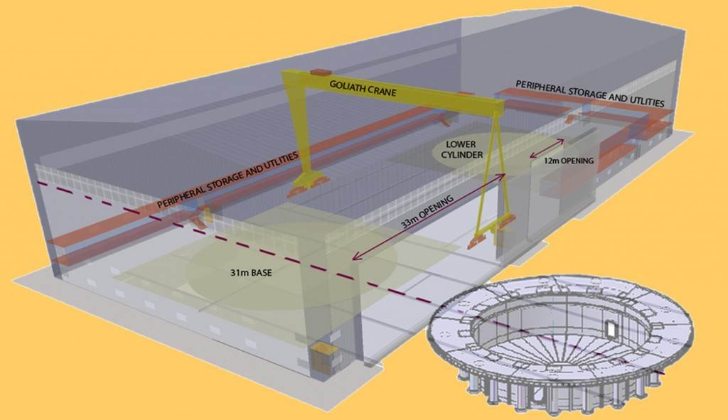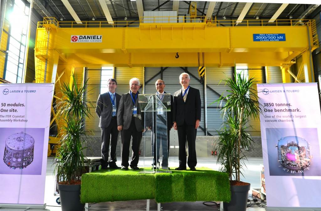 In the northeast corner of the ITER platform, the 6,000-square-metre Cryostat Workshop was built to house the assembly of the four main cryostat sections from 54 smaller segments manufactured in India.