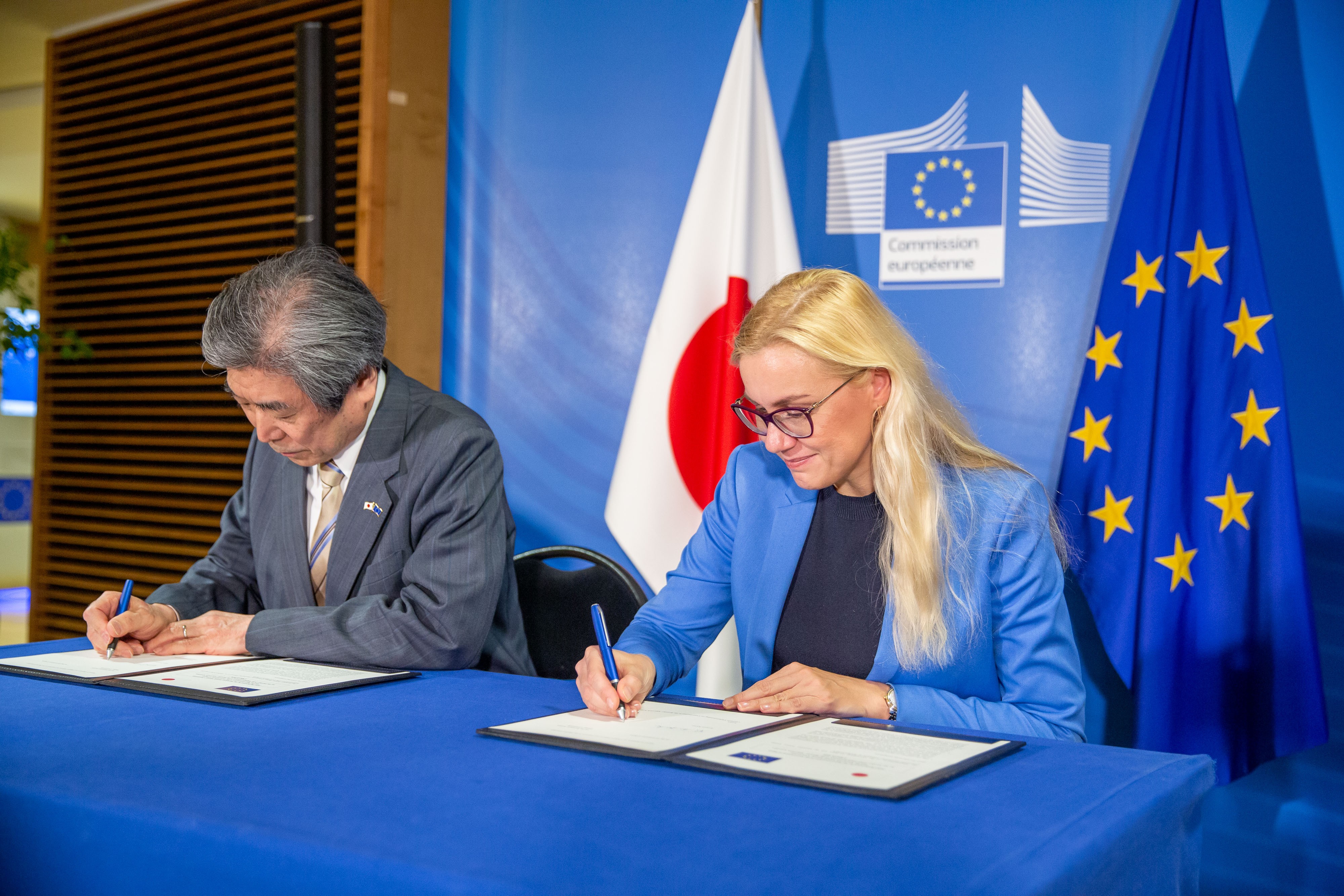 Kazuo Kodama, the Ambassador Extraordinary and Plenipotentiary of Japan to the European Union, and Energy Commissioner Kadri Simson, representing the European Atomic Energy Community (Euratom), sign the joint declaration on the Broader Approach activities on 2 March.