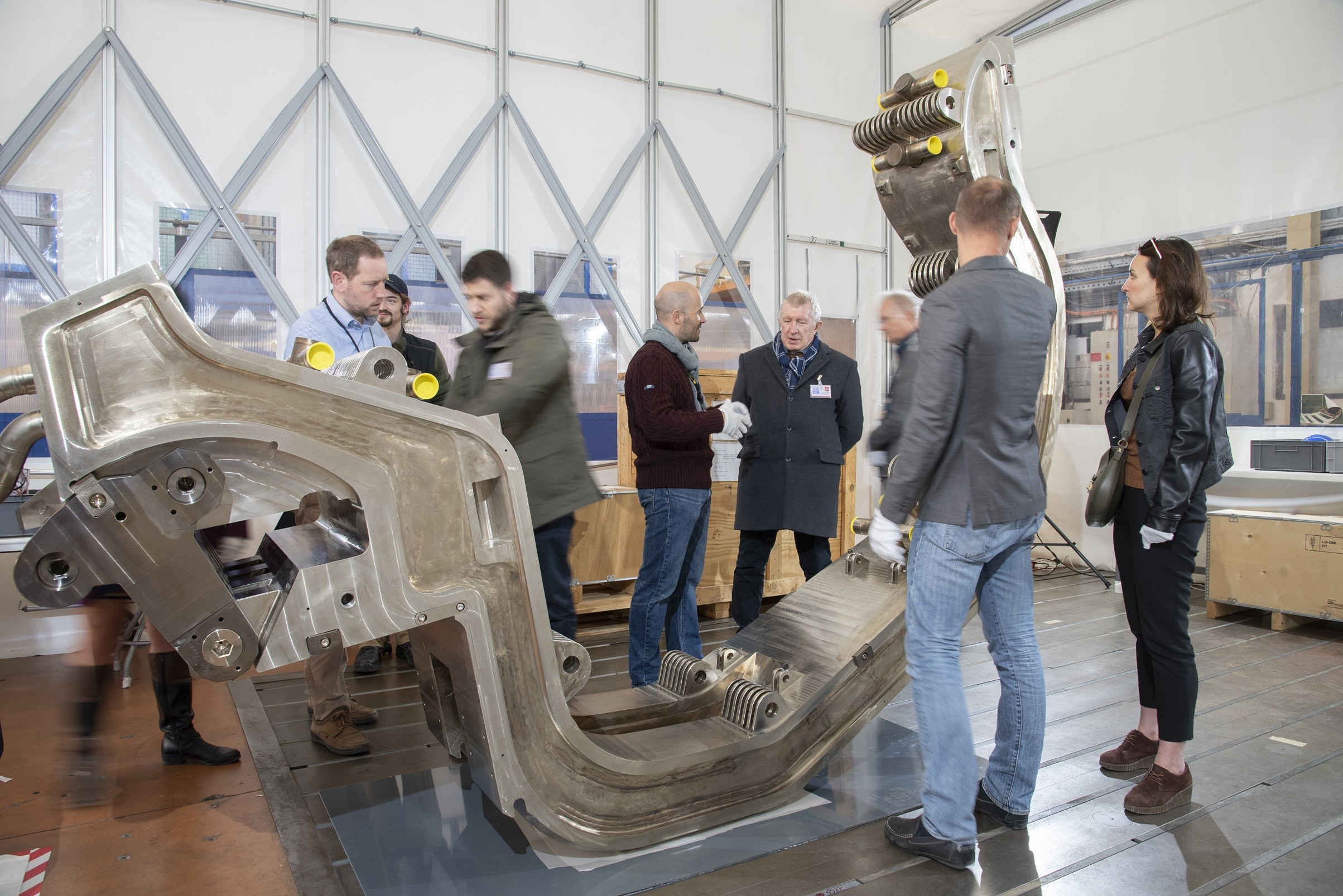 Members of the ITER divertor team examine a cassette body prototype produced by the CNIM-SIMIC consortium under contract with the European Domestic Agency. The prototype recently underwent final acceptance tests, including leak-tightness and dimensional inspection tests, next door to ITER at CEA-Cadarache. Photo: Christophe Roux (CEA)