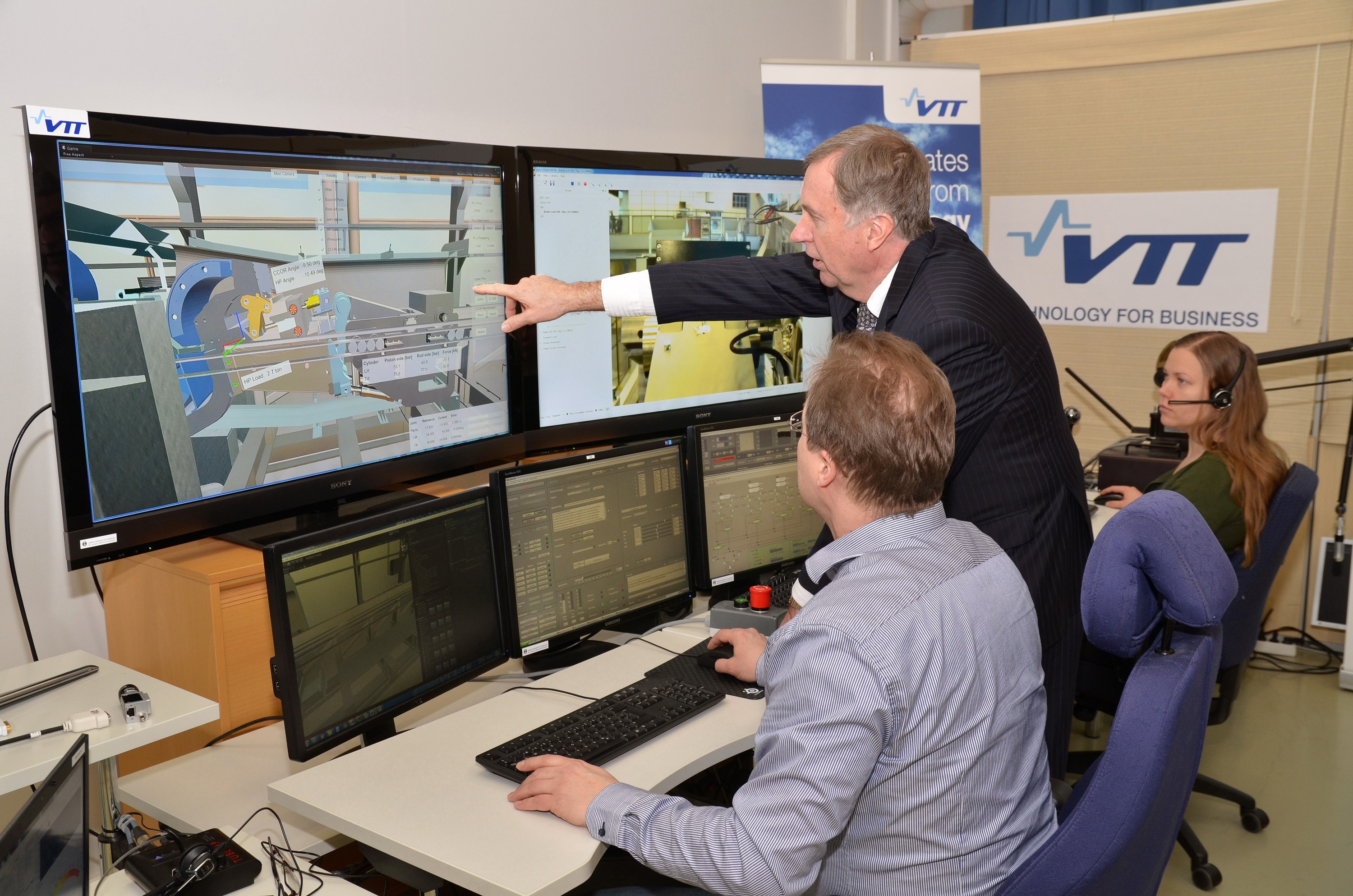 From the control room at the VTT Technical Research Centre in Finland, a mockup of an ITER divertor cassette is "inserted" into a 1:1 scale section of the ITER vacuum vessel. Research financed by the European Domestic Agency at VTT between 2011 and 2015 confirmed divertor cassette remote handling and installation procedures.