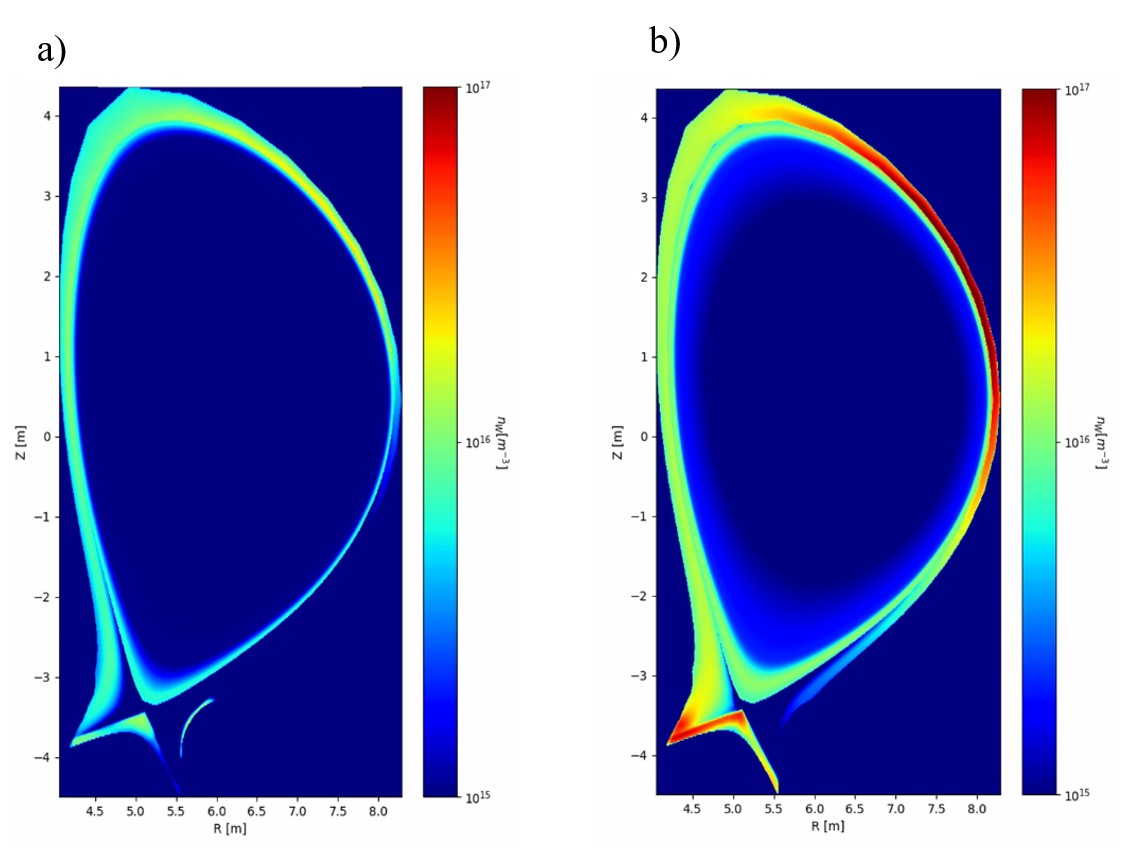 Modelled tungsten (W) density between ELMs (a) and after an ELM (b) showing the good screening of W in the ITER plasma periphery between ELMs and the increase of the W density following an ELM. (Modelling carried out by UKAEA under a Fusion for Energy Task Agreement with the ITER Organization.)