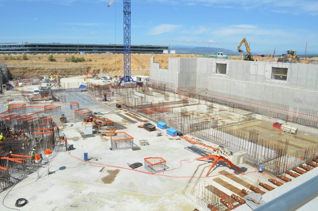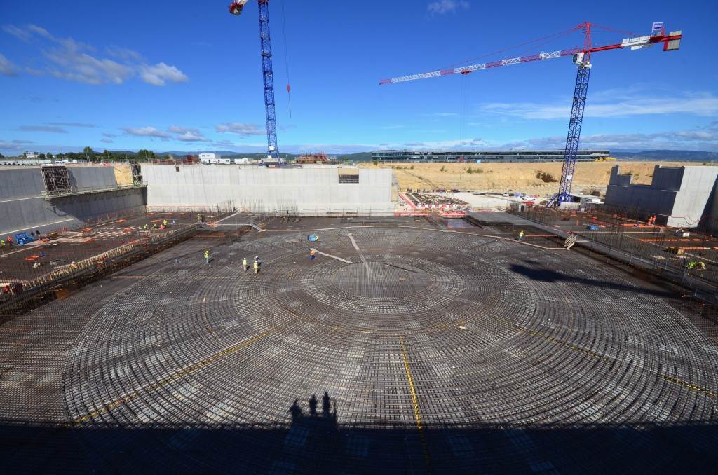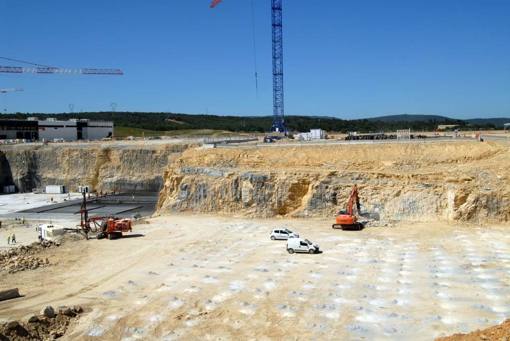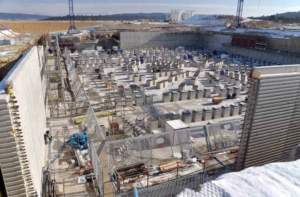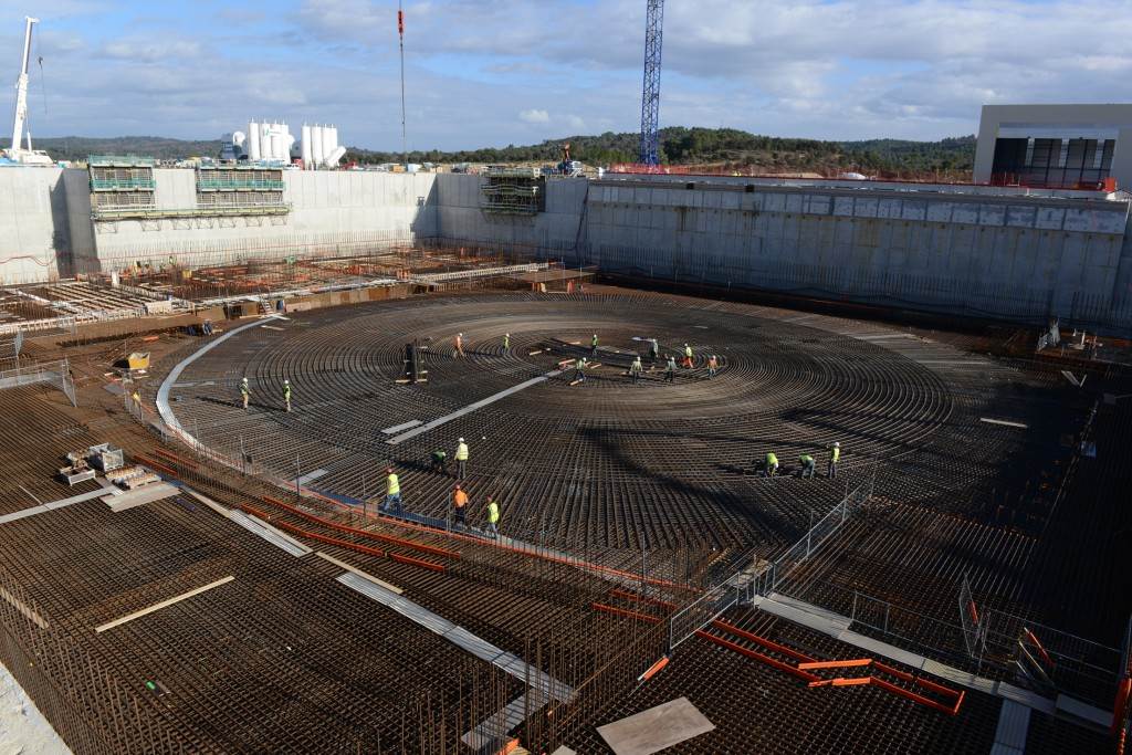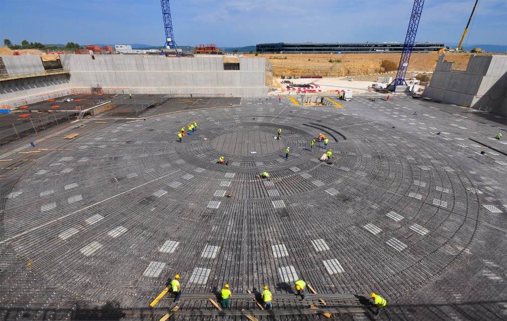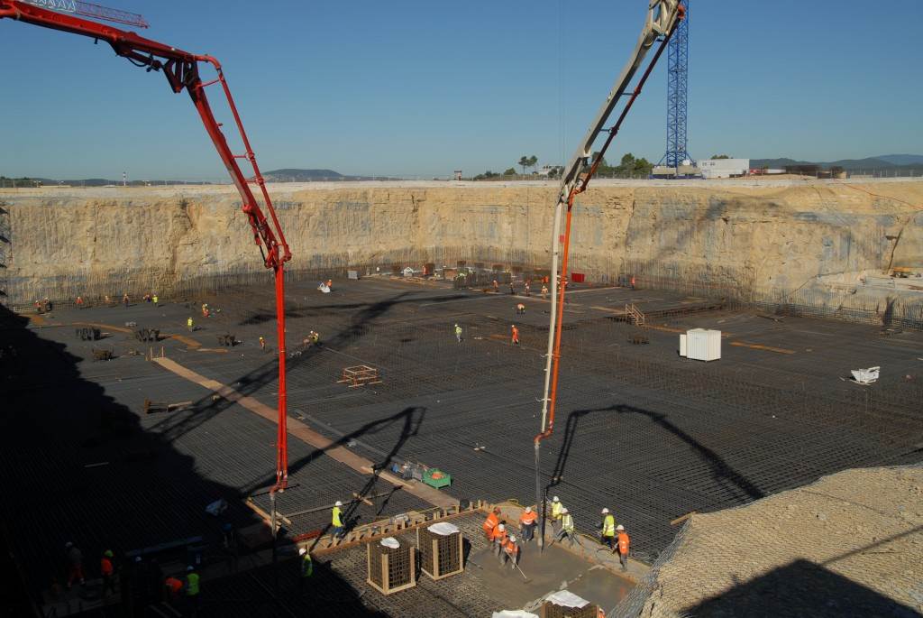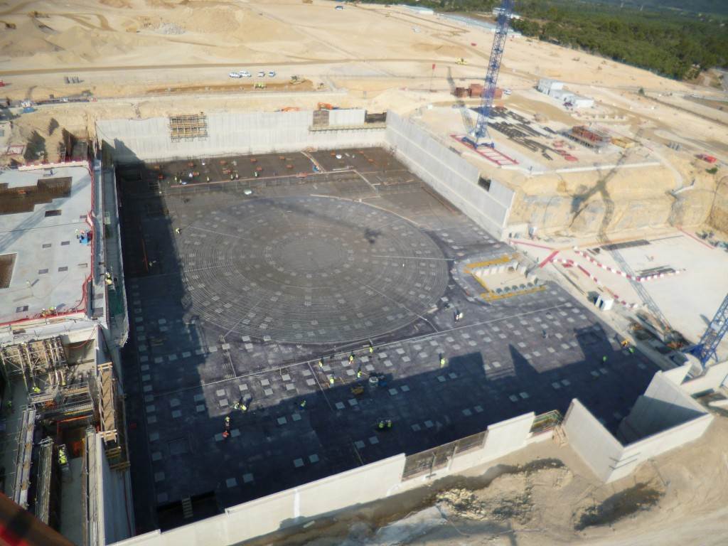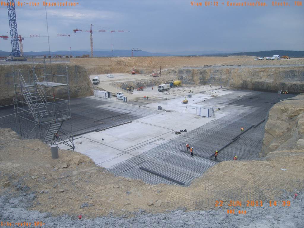 From August 2010 to August 2014, workers excavated the 17-metre-deep, 90 x 130 metre Tokamak Complex Seismic Pit, created a ground-level basemat and retaining walls, installed 493 seismic columns and pads, and poured the B2 basemat slab (the "floor" of the Tokamak Complex).