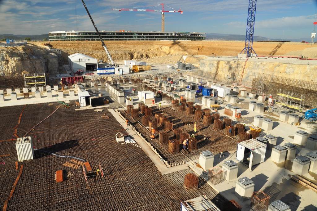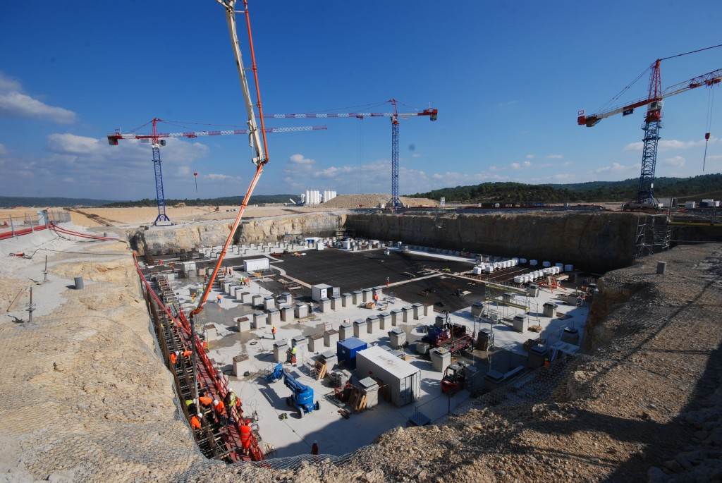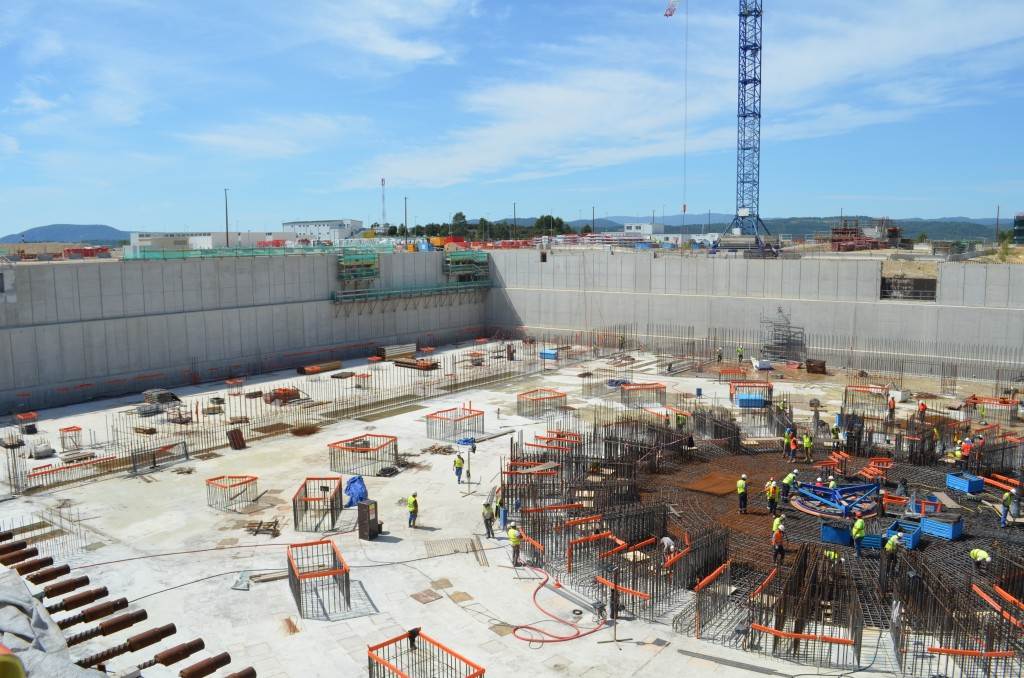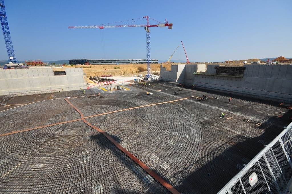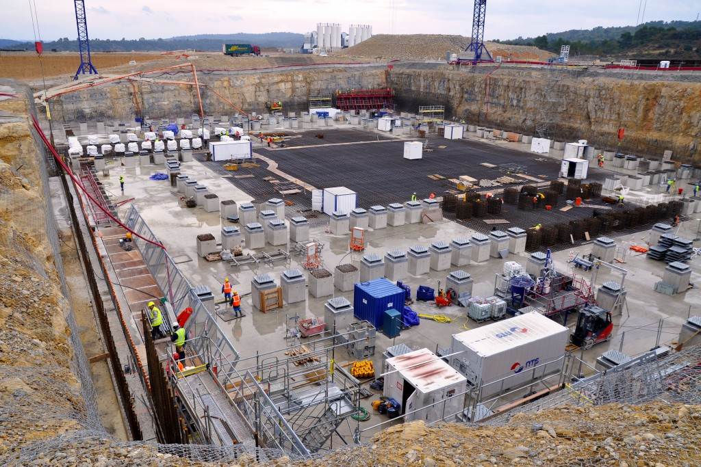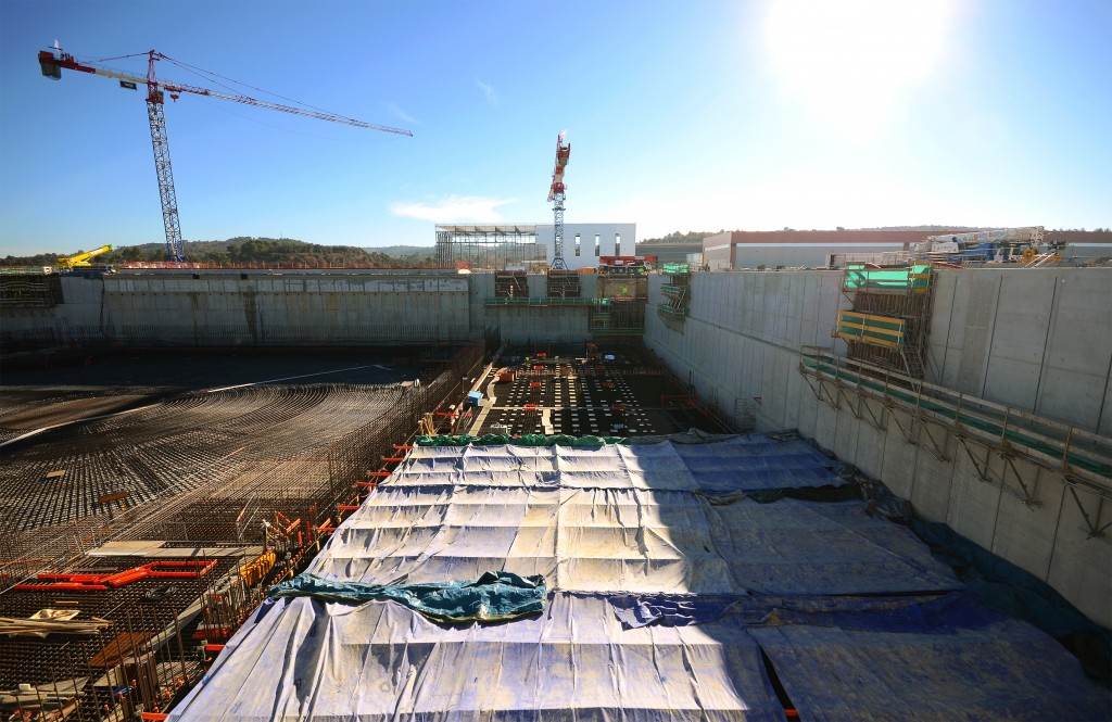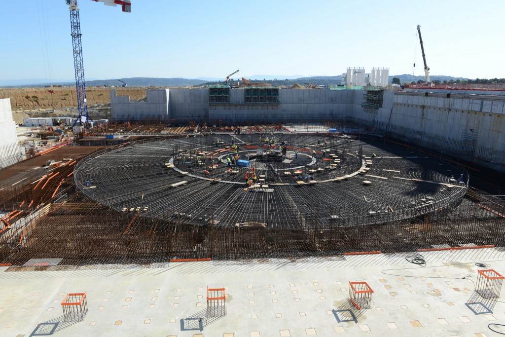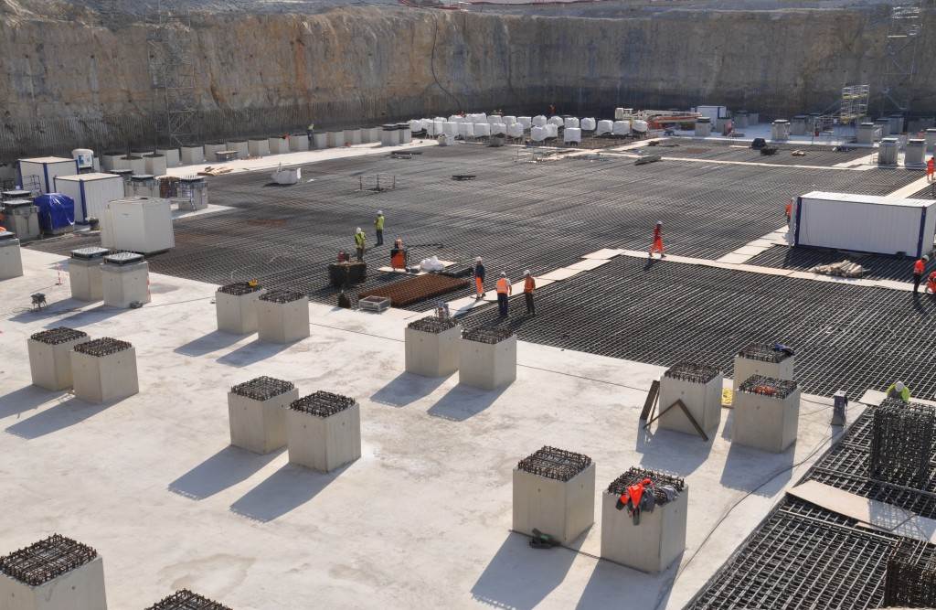 From August 2010 to August 2014, workers excavated the 17-metre-deep, 90 x 130 metre Tokamak Complex Seismic Pit, created a ground-level basemat and retaining walls, installed 493 seismic columns and pads, and poured the B2 basemat slab (the "floor" of the Tokamak Complex).