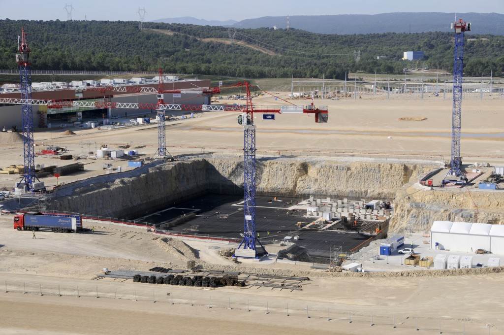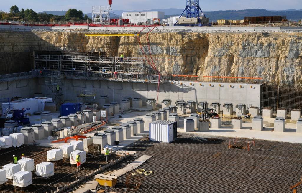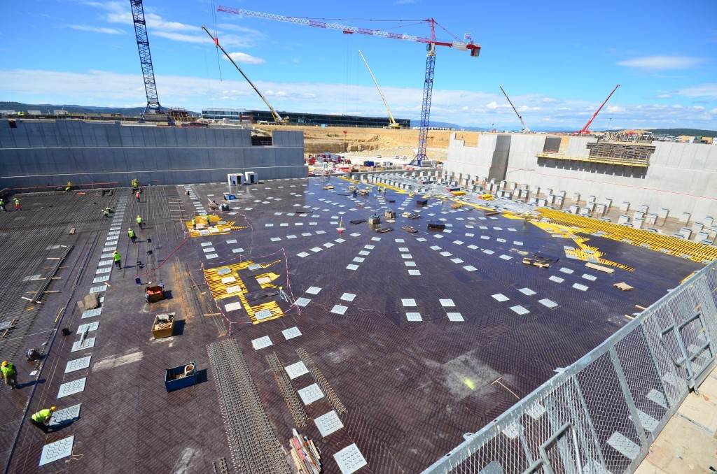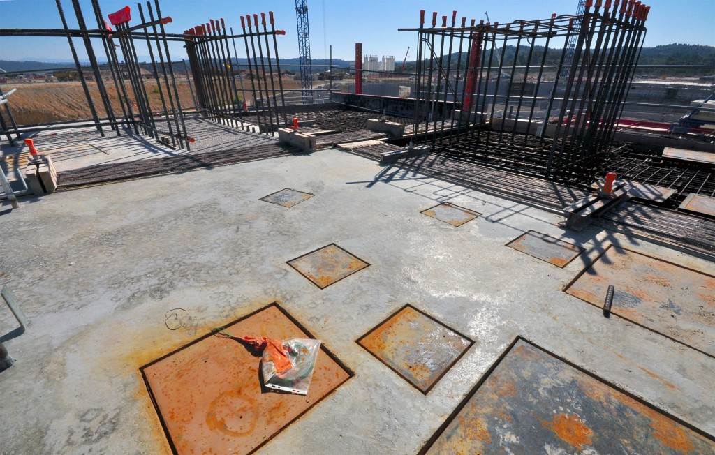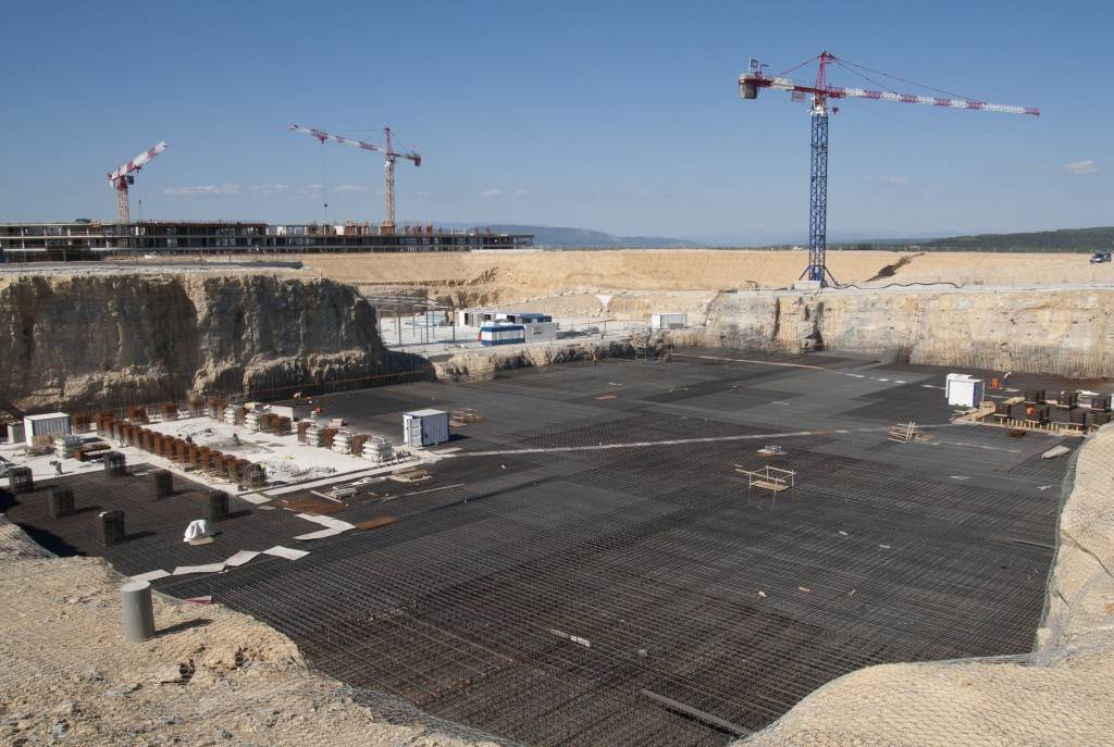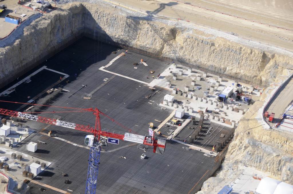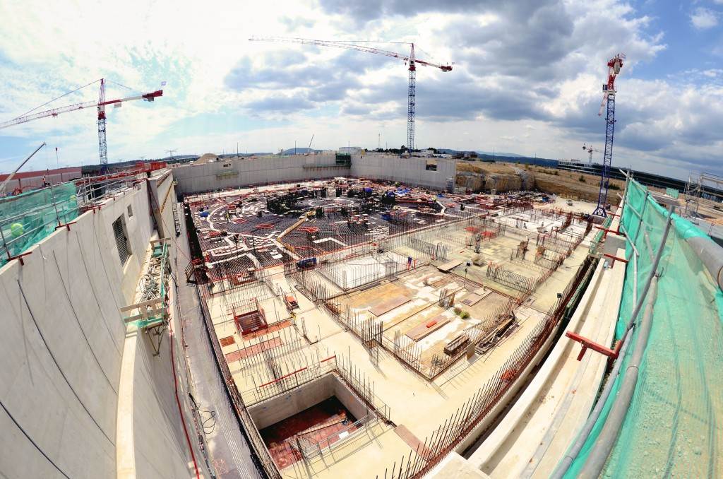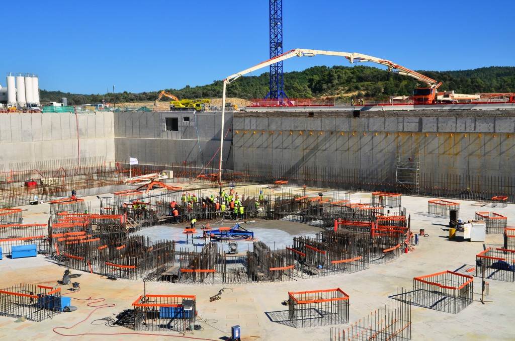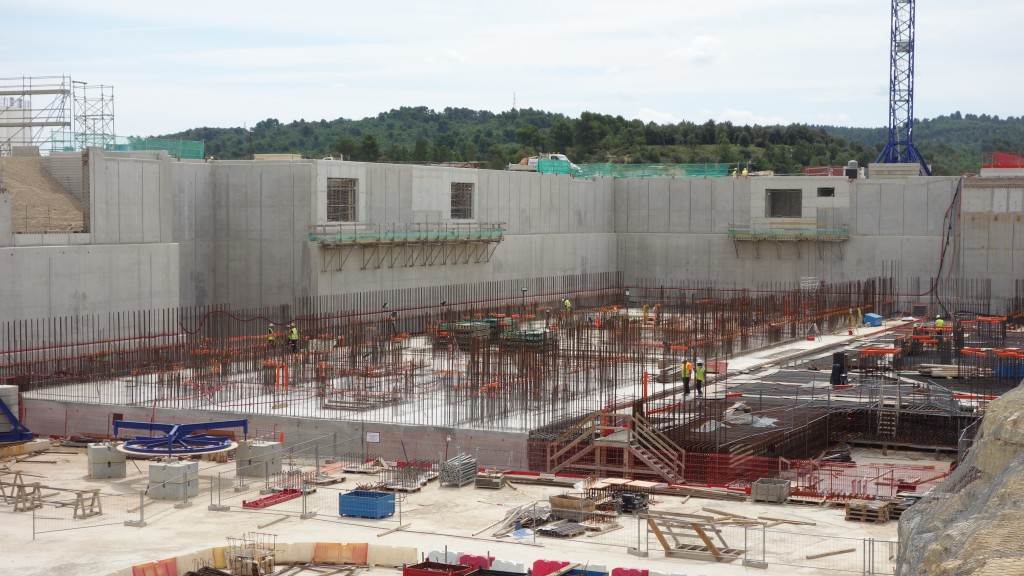 From August 2010 to August 2014, workers excavated the 17-metre-deep, 90 x 130 metre Tokamak Complex Seismic Pit, created a ground-level basemat and retaining walls, installed 493 seismic columns and pads, and poured the B2 basemat slab (the "floor" of the Tokamak Complex).