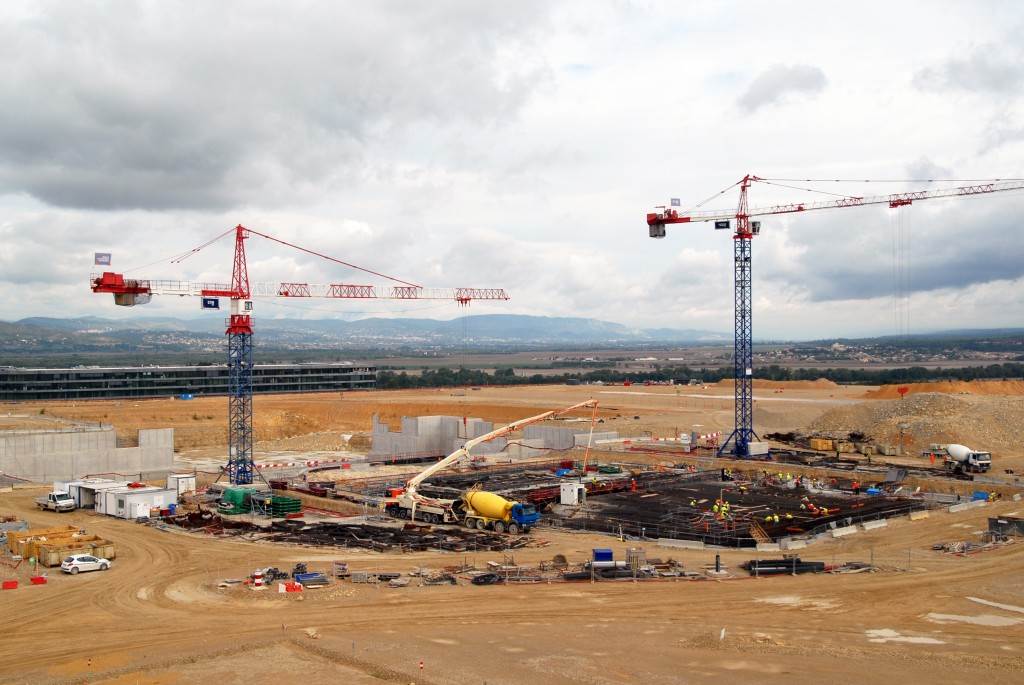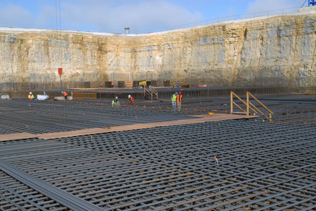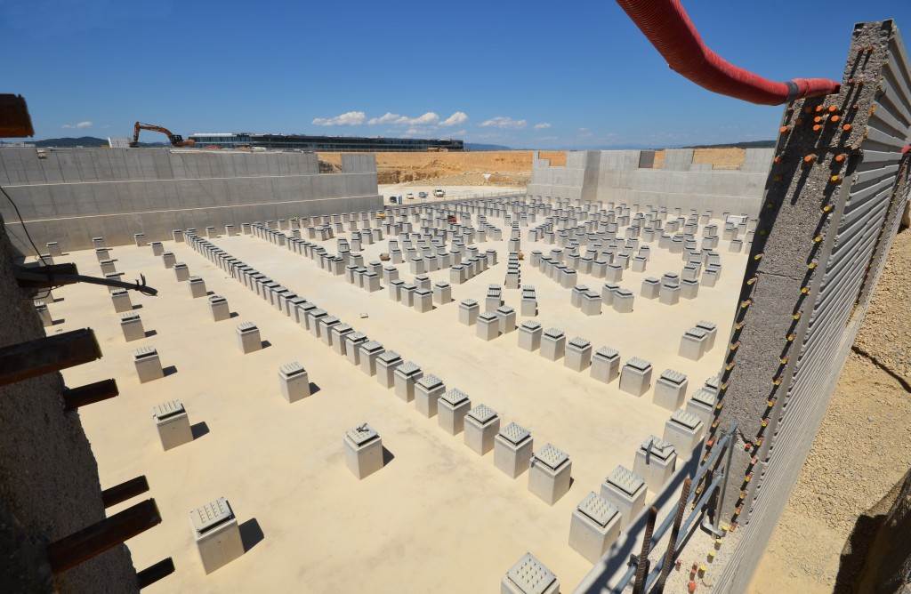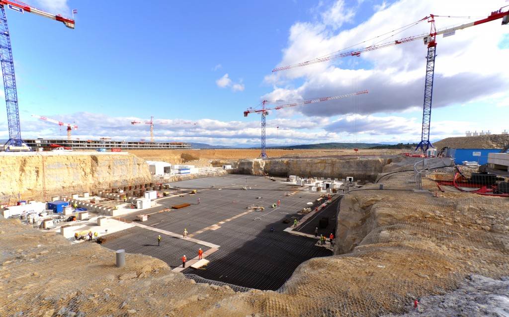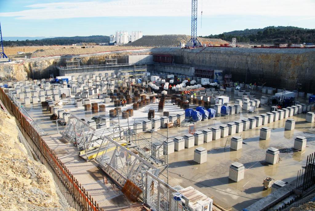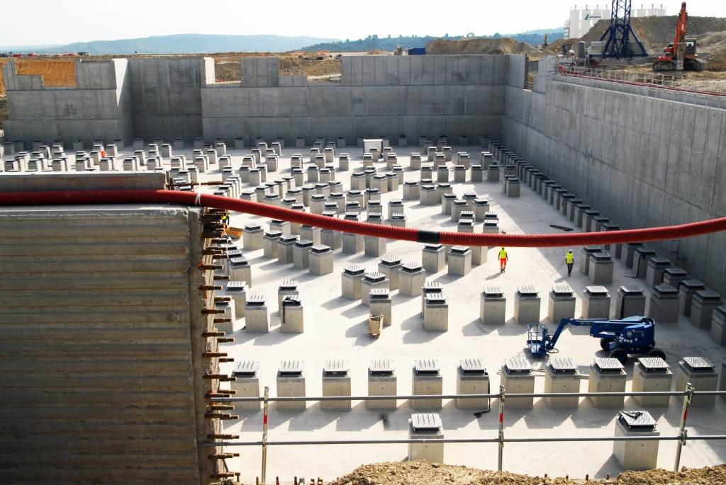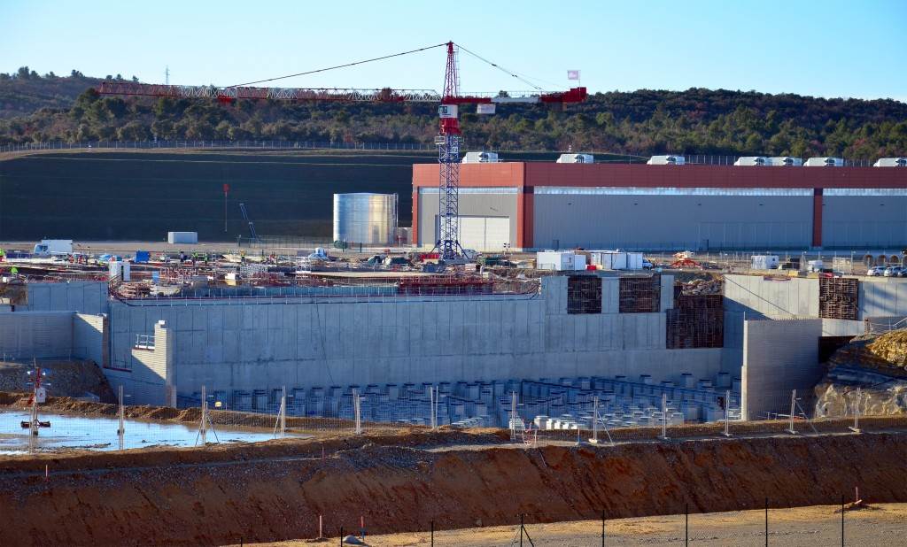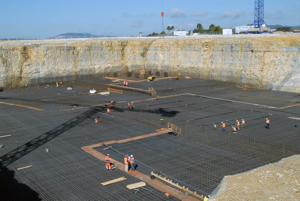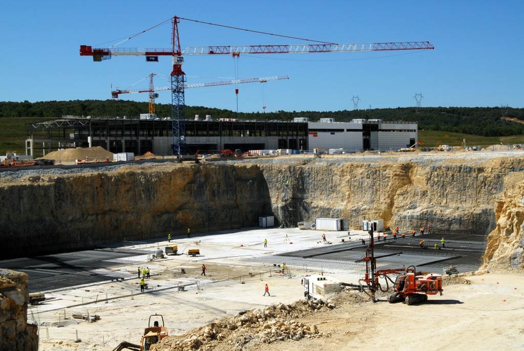 From August 2010 to August 2014, workers excavated the 17-metre-deep, 90 x 130 metre Tokamak Complex Seismic Pit, created a ground-level basemat and retaining walls, installed 493 seismic columns and pads, and poured the B2 basemat slab (the "floor" of the Tokamak Complex).