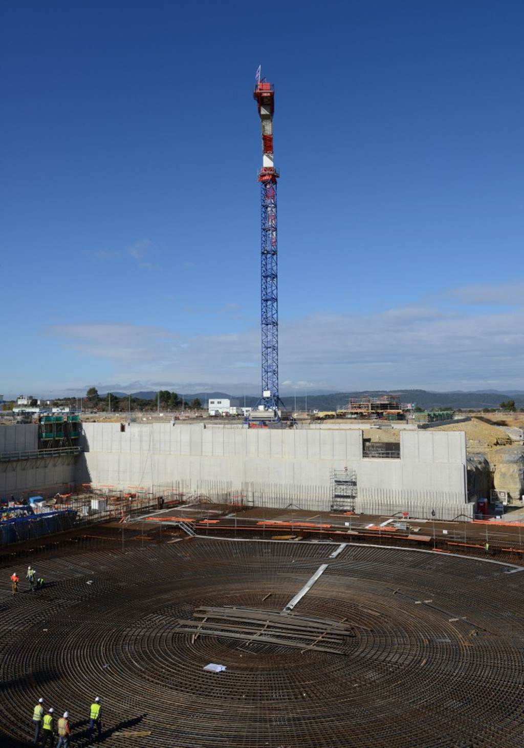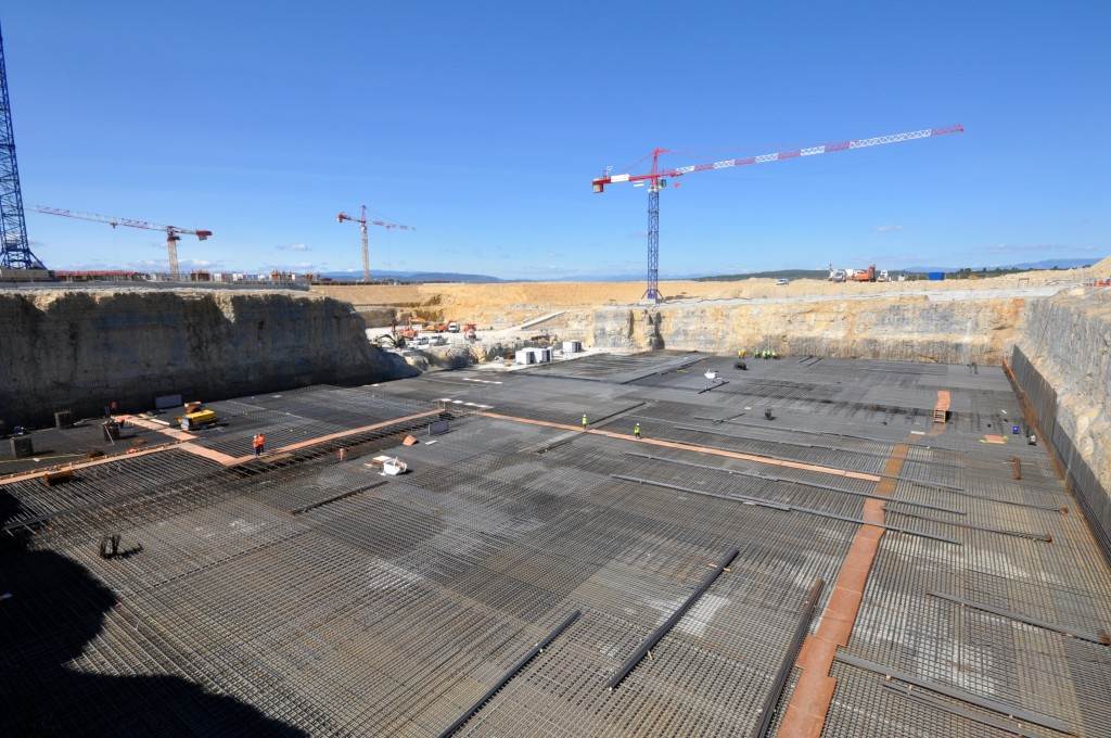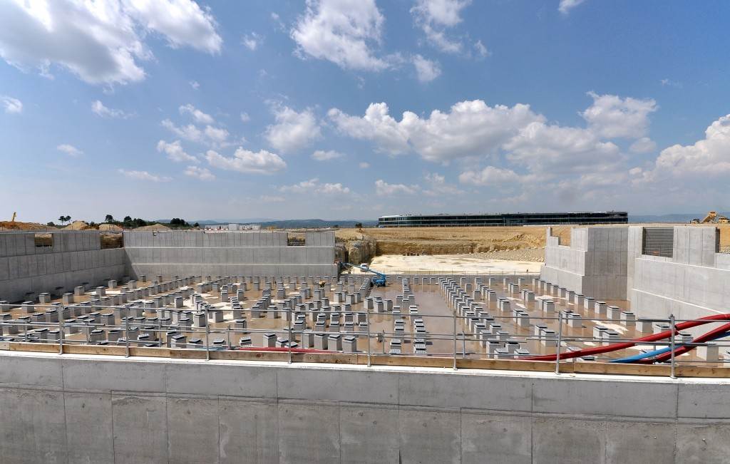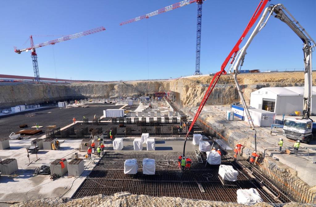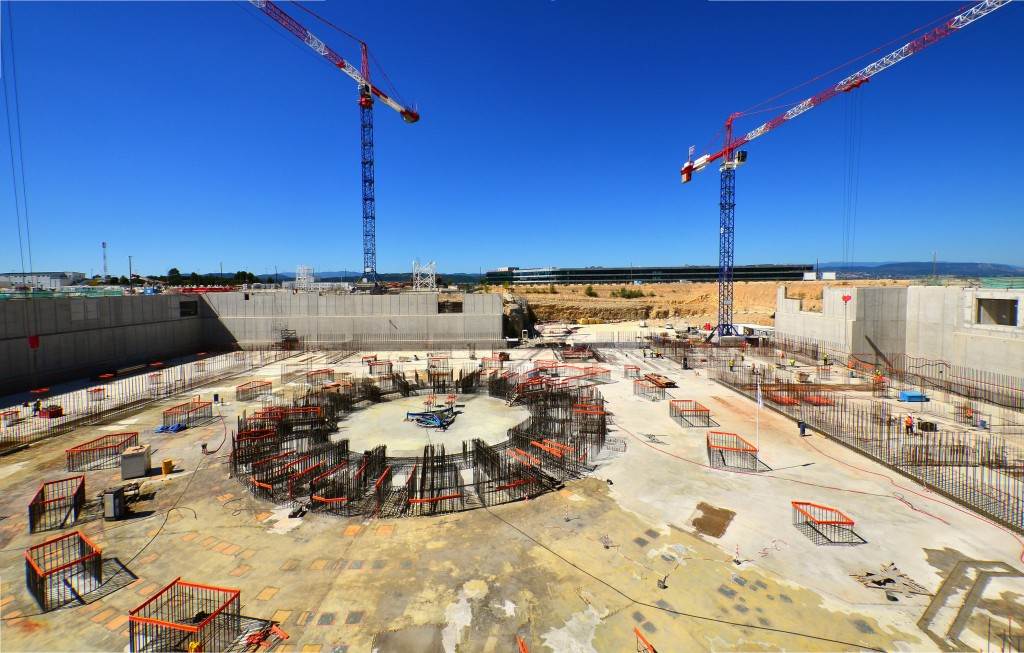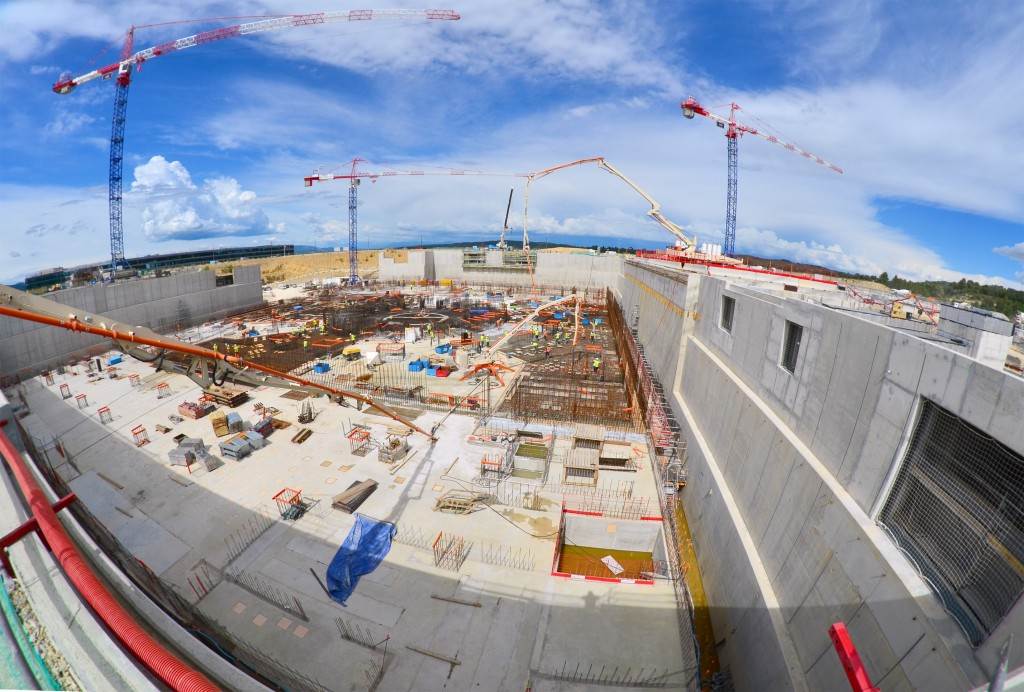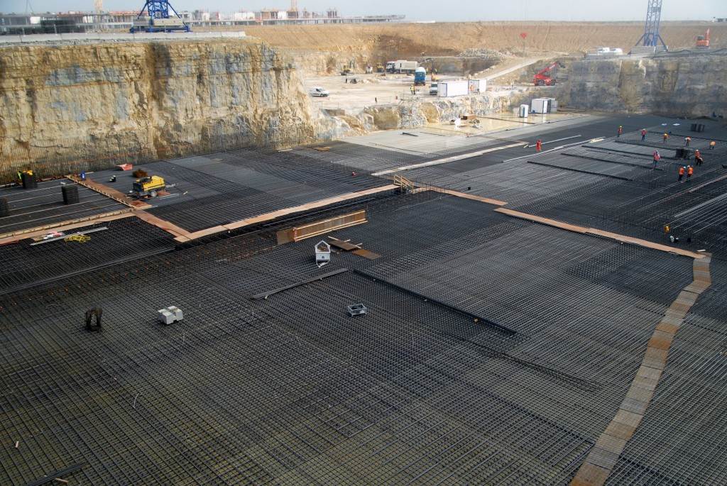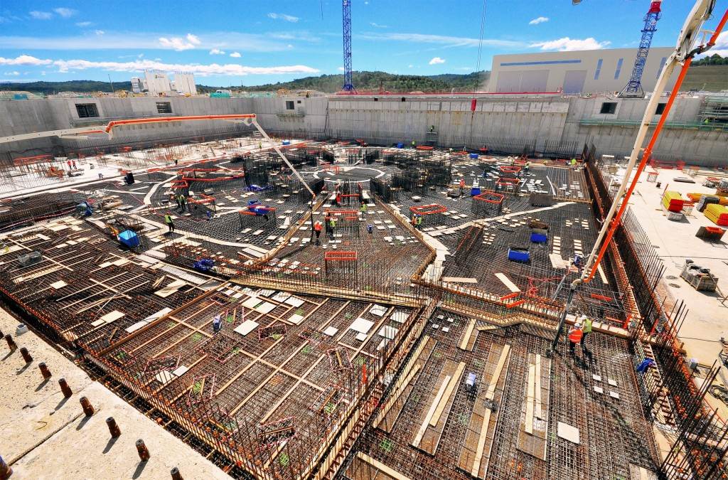 From August 2010 to August 2014, workers excavated the 17-metre-deep, 90 x 130 metre Tokamak Complex Seismic Pit, created a ground-level basemat and retaining walls, installed 493 seismic columns and pads, and poured the B2 basemat slab (the "floor" of the Tokamak Complex).