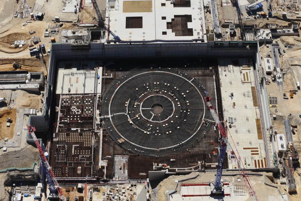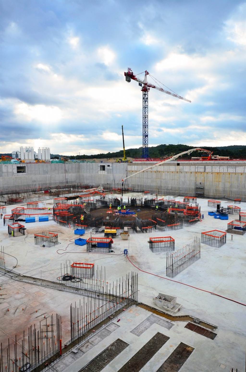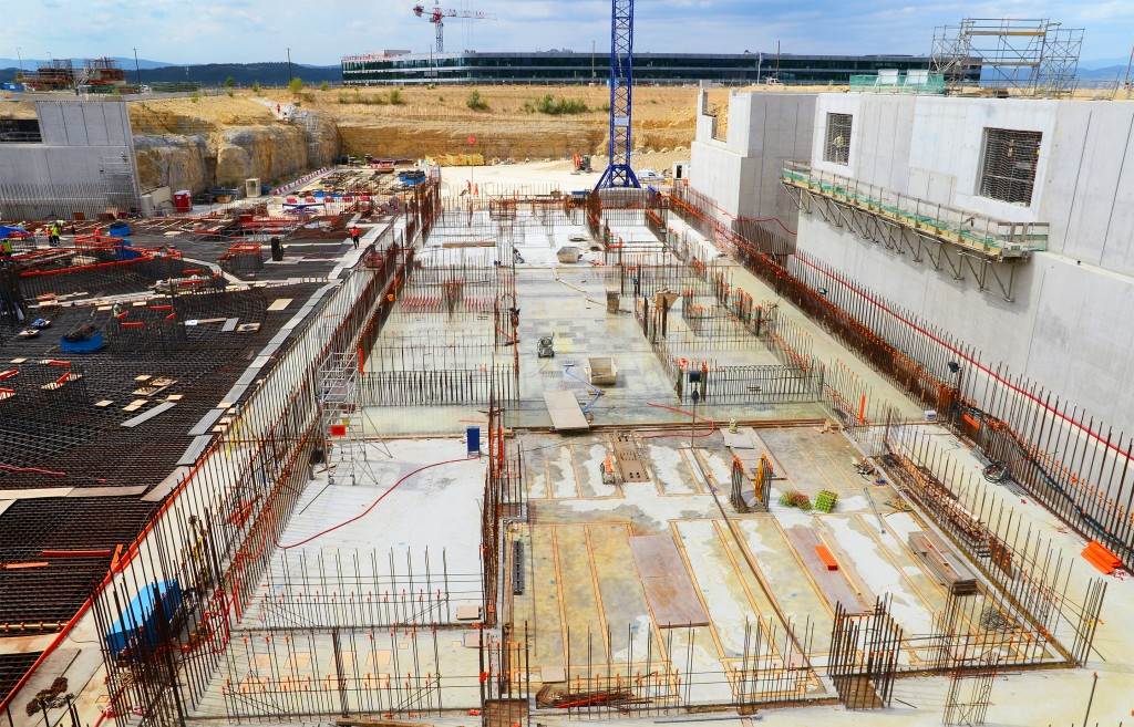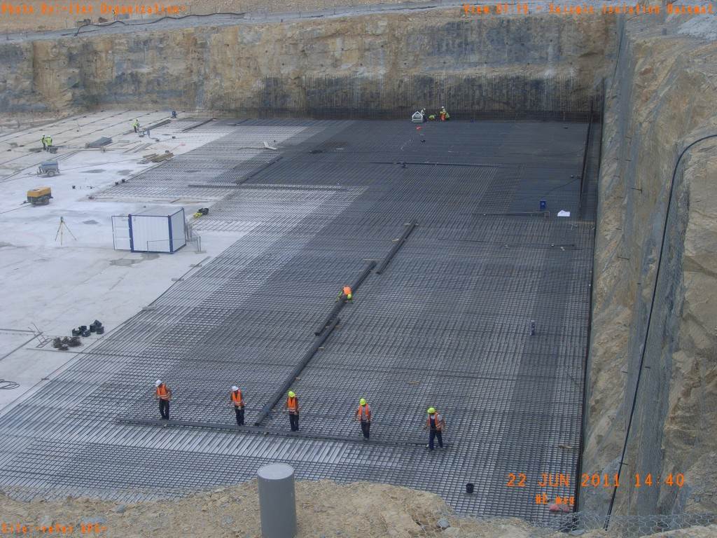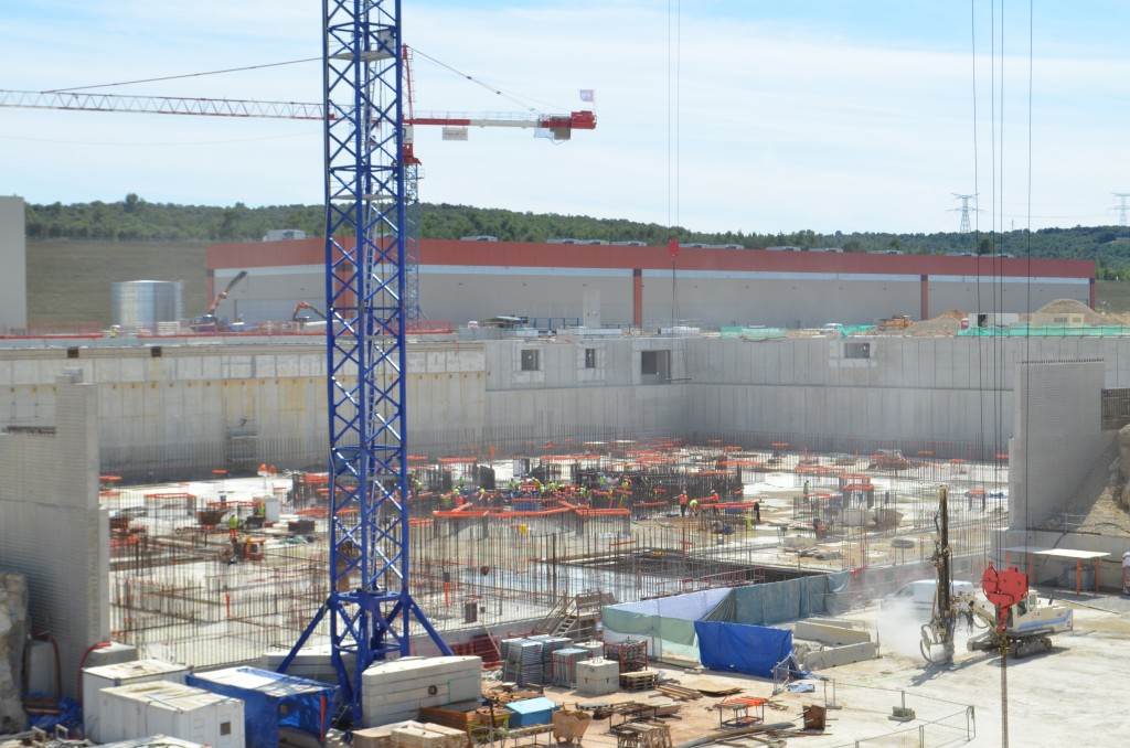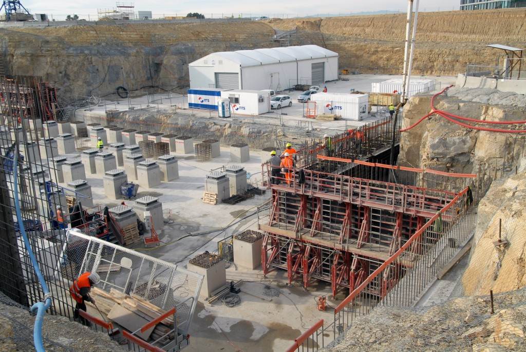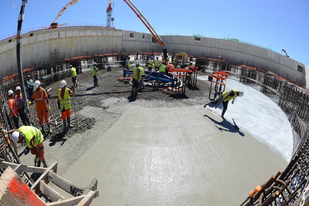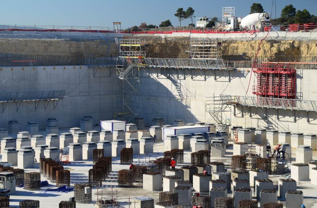 From August 2010 to August 2014, workers excavated the 17-metre-deep, 90 x 130 metre Tokamak Complex Seismic Pit, created a ground-level basemat and retaining walls, installed 493 seismic columns and pads, and poured the B2 basemat slab (the "floor" of the Tokamak Complex).