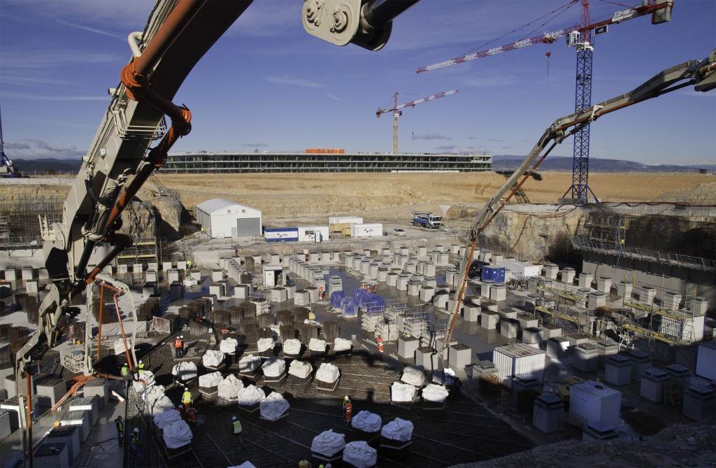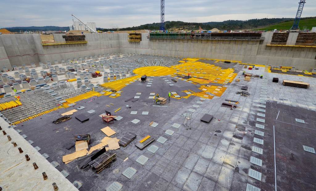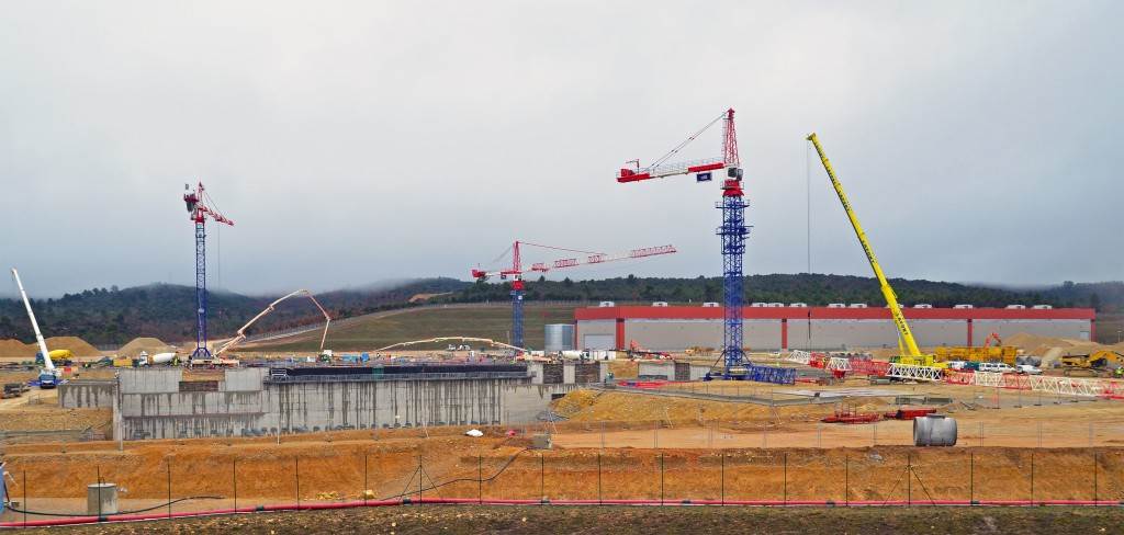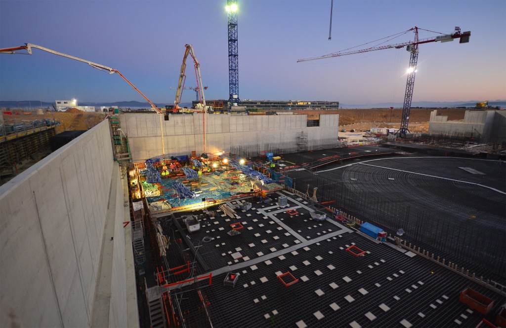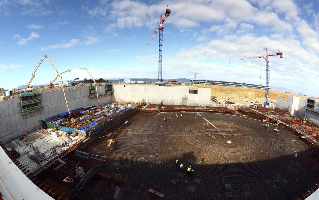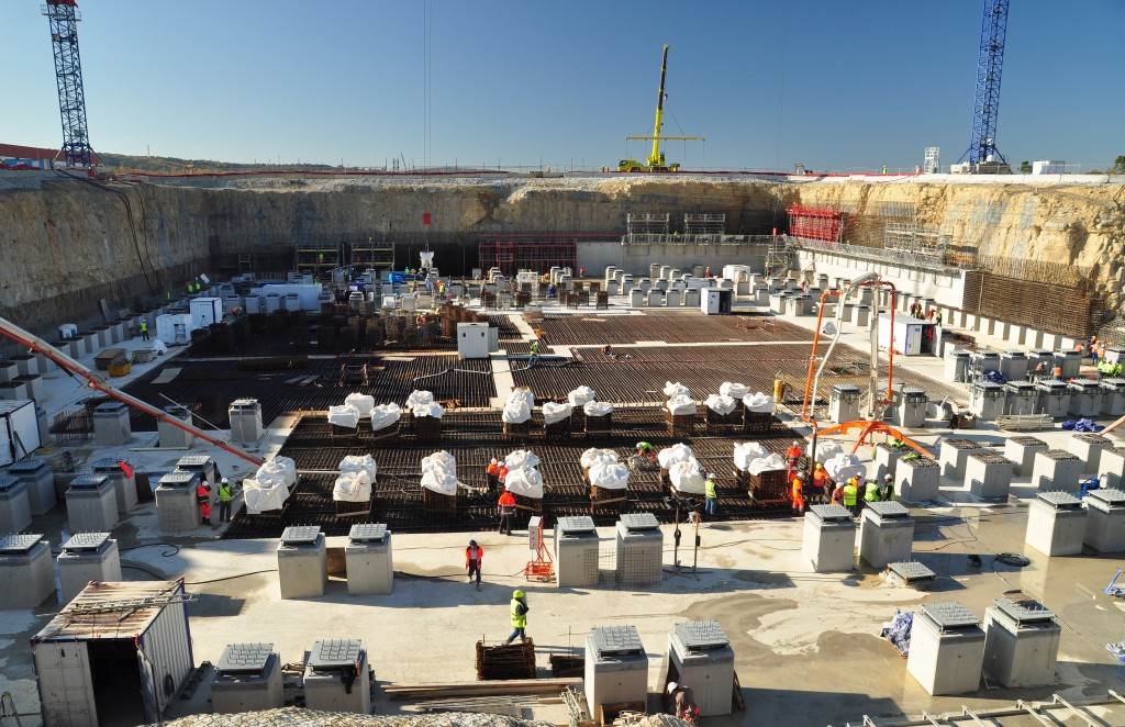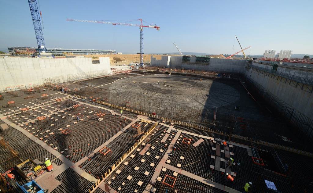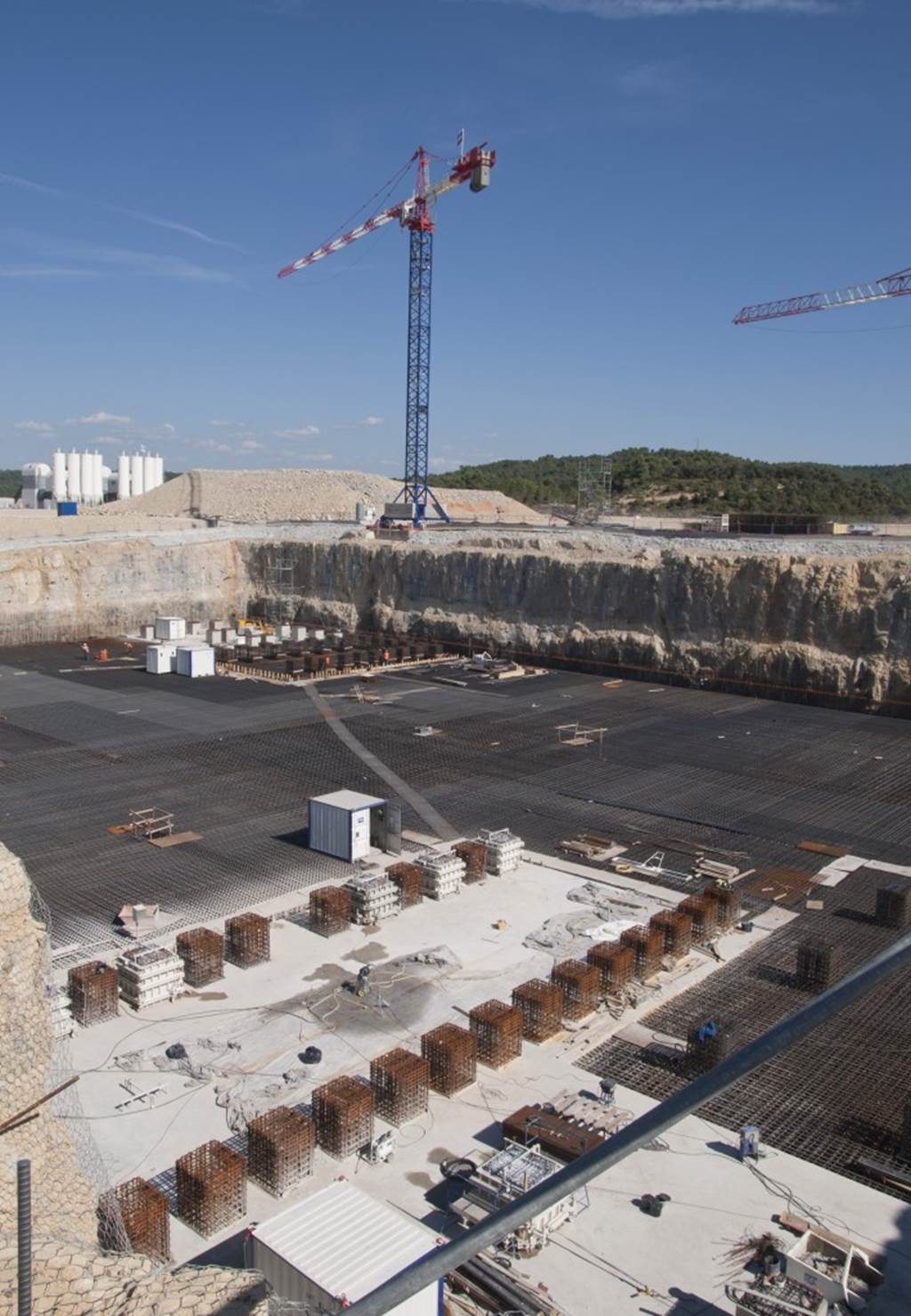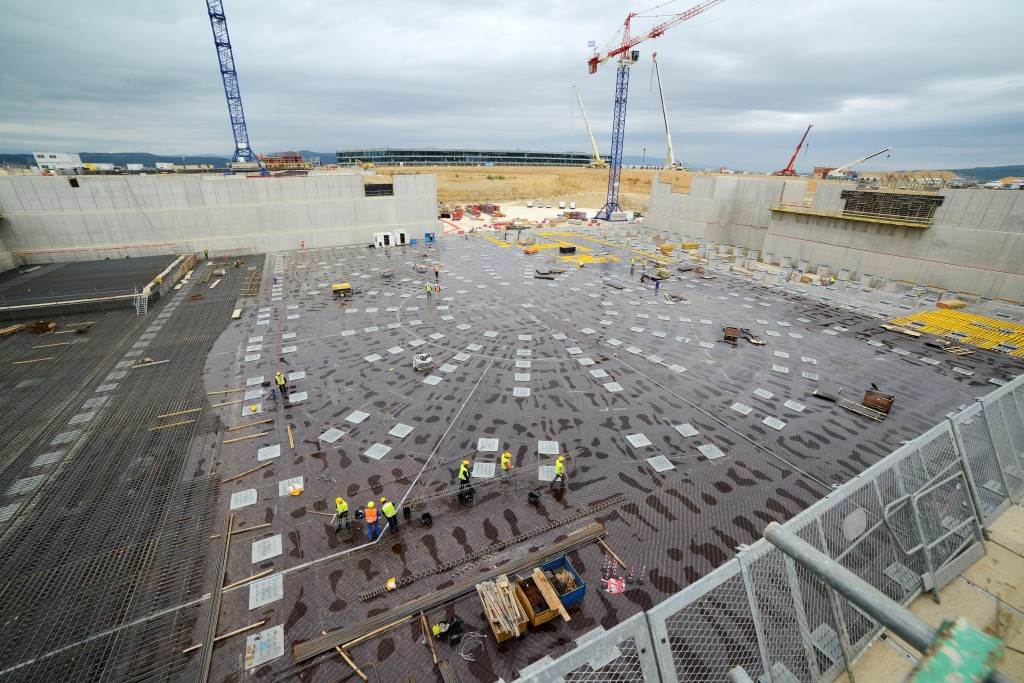 From August 2010 to August 2014, workers excavated the 17-metre-deep, 90 x 130 metre Tokamak Complex Seismic Pit, created a ground-level basemat and retaining walls, installed 493 seismic columns and pads, and poured the B2 basemat slab (the "floor" of the Tokamak Complex).