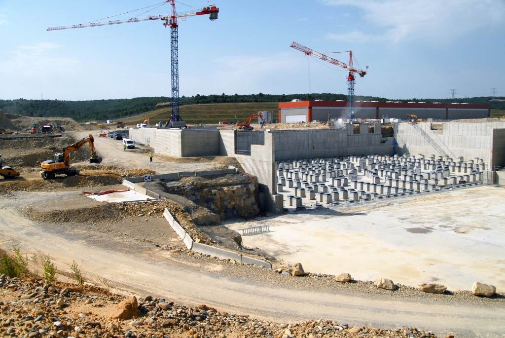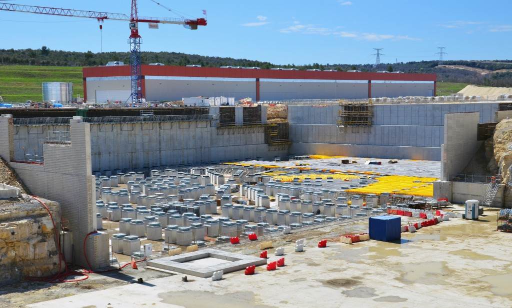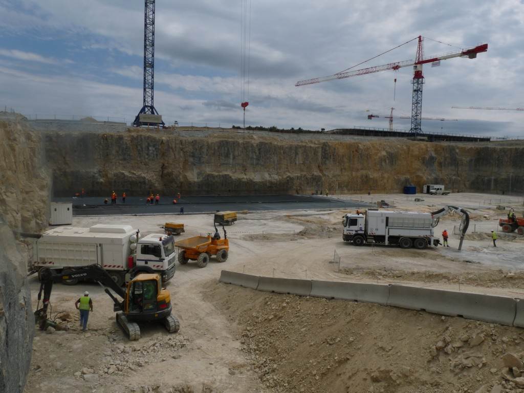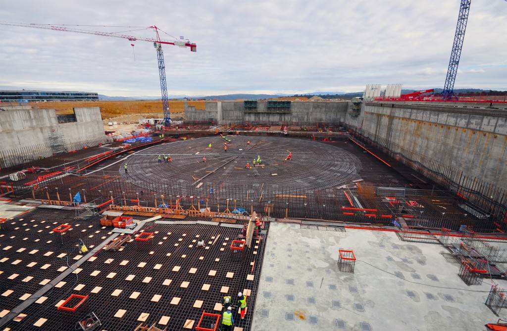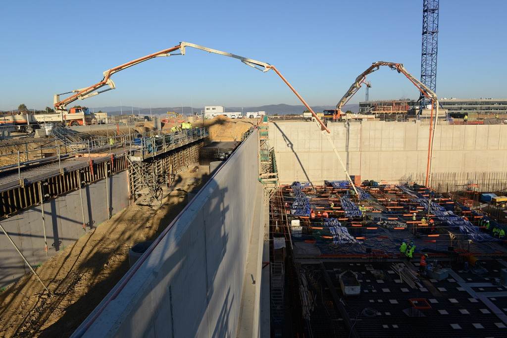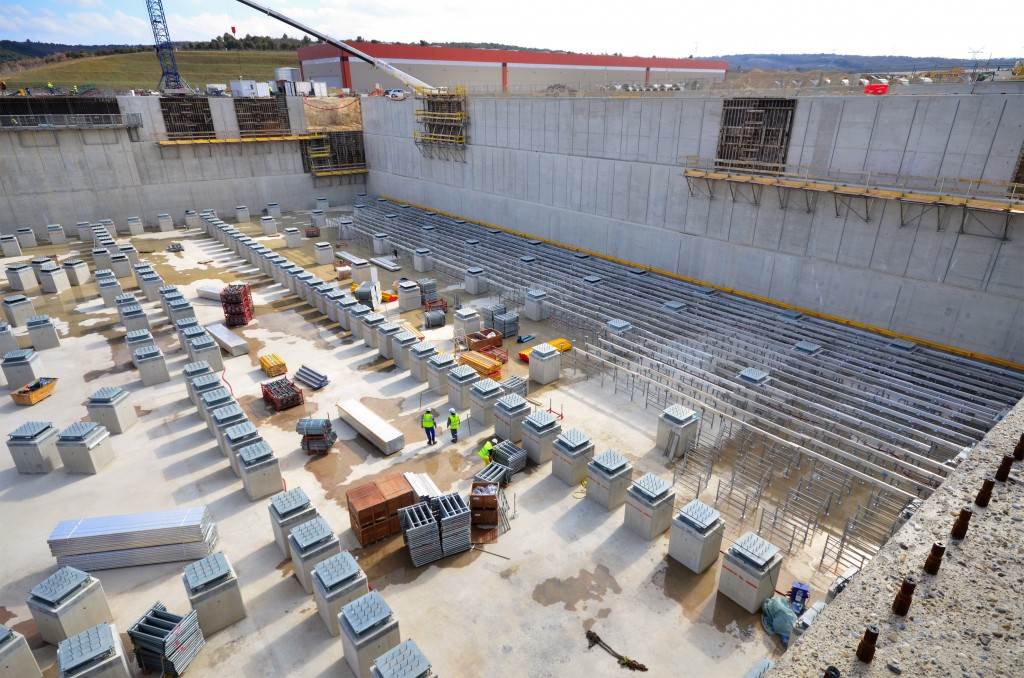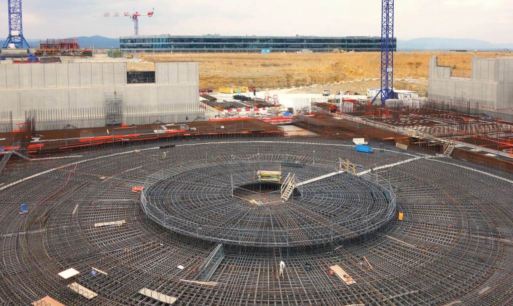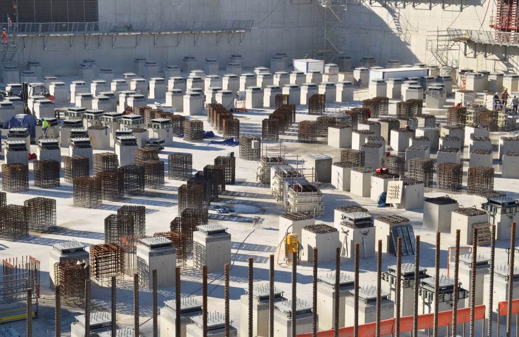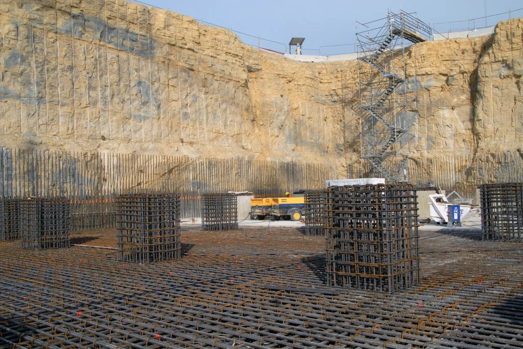 From August 2010 to August 2014, workers excavated the 17-metre-deep, 90 x 130 metre Tokamak Complex Seismic Pit, created a ground-level basemat and retaining walls, installed 493 seismic columns and pads, and poured the B2 basemat slab (the "floor" of the Tokamak Complex).