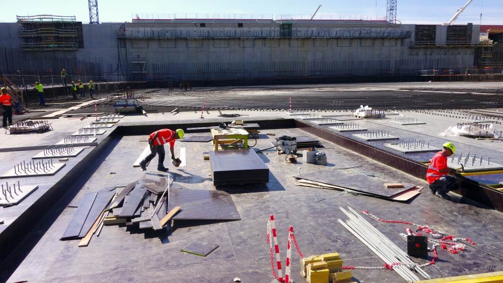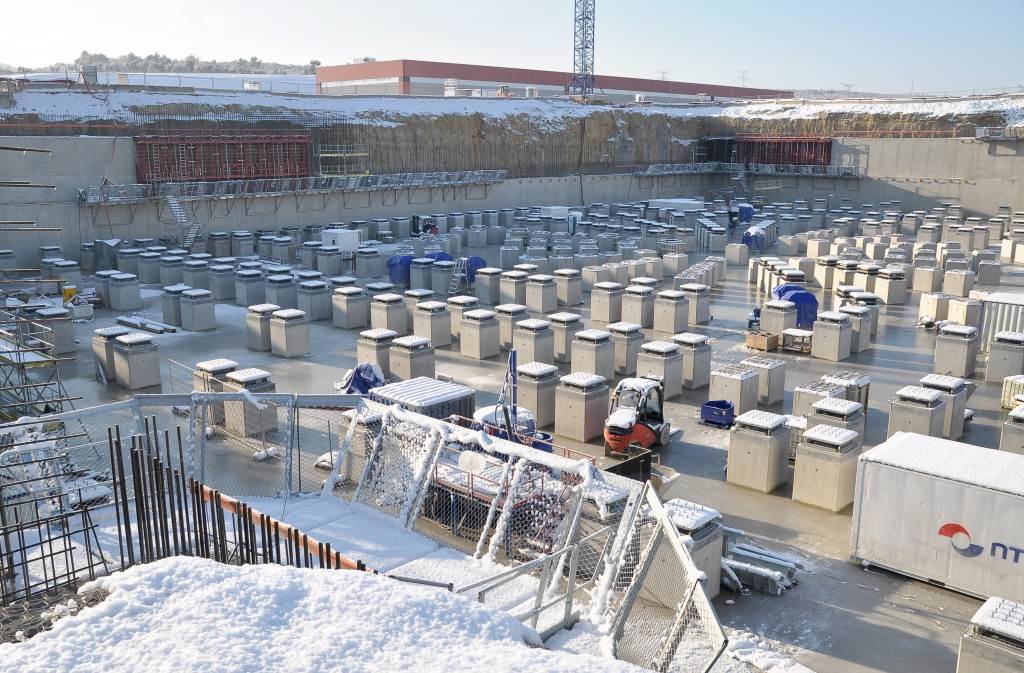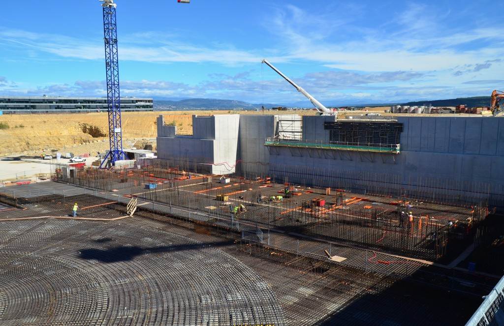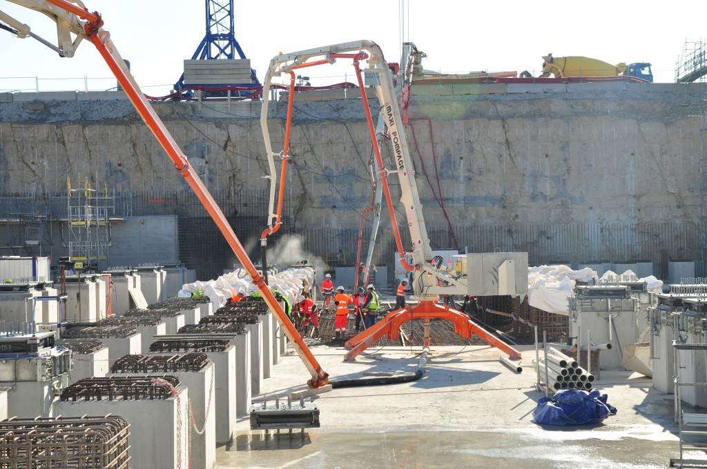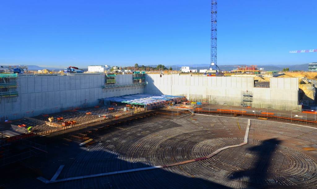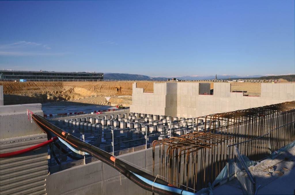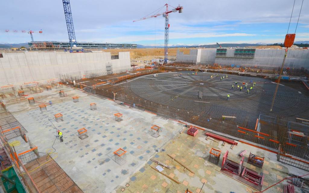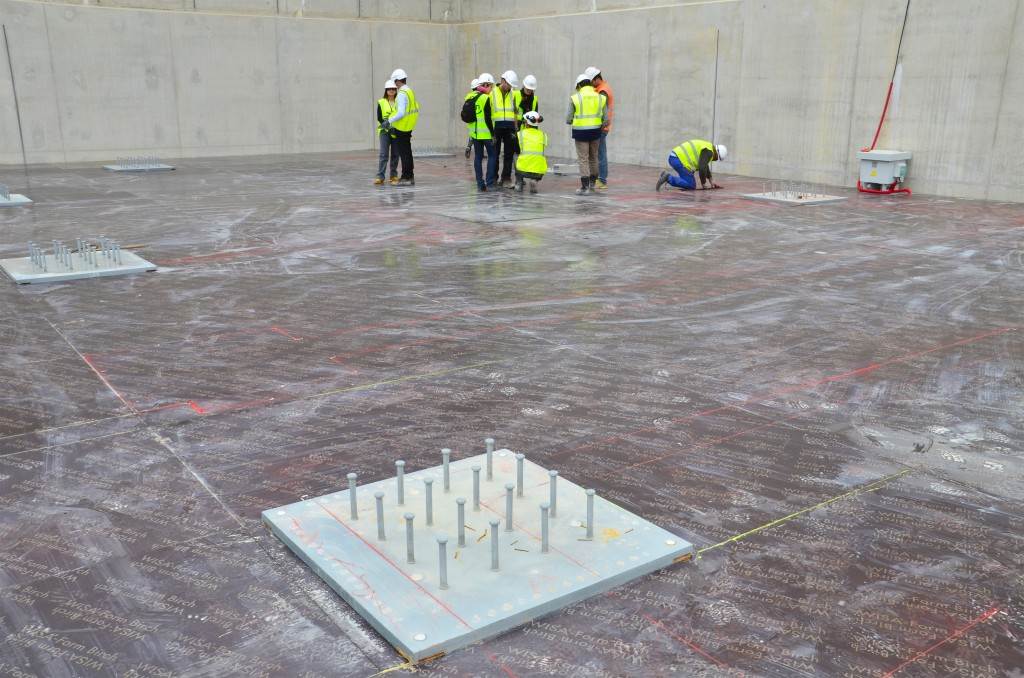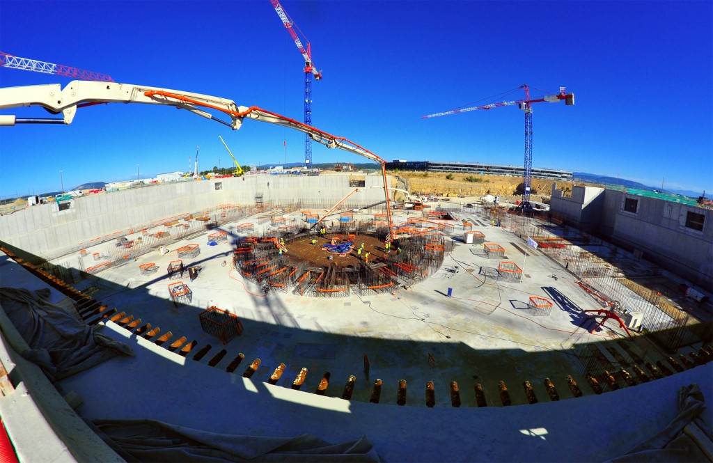 From August 2010 to August 2014, workers excavated the 17-metre-deep, 90 x 130 metre Tokamak Complex Seismic Pit, created a ground-level basemat and retaining walls, installed 493 seismic columns and pads, and poured the B2 basemat slab (the "floor" of the Tokamak Complex).