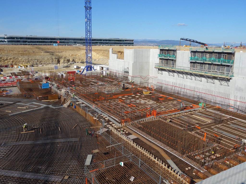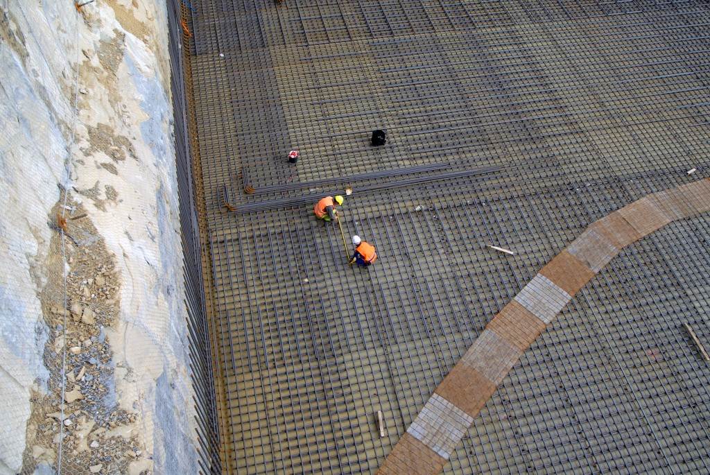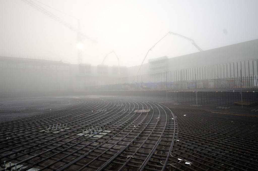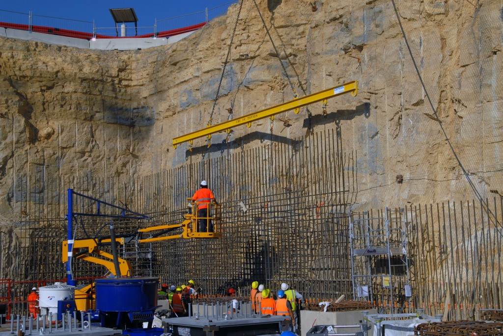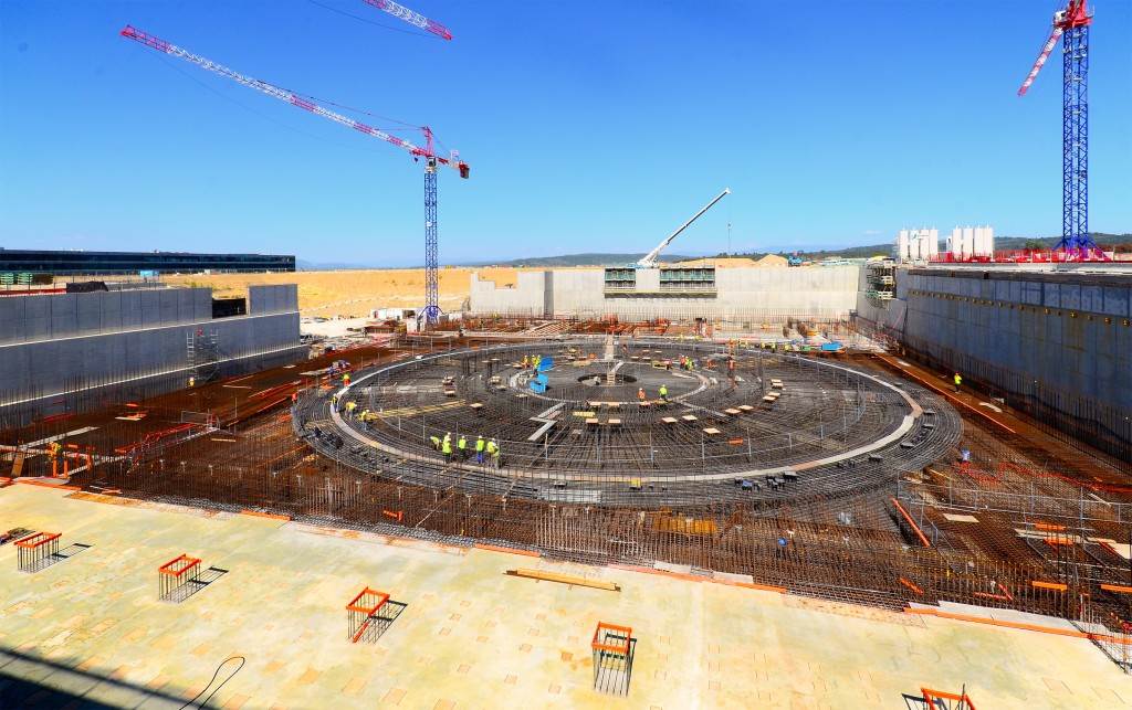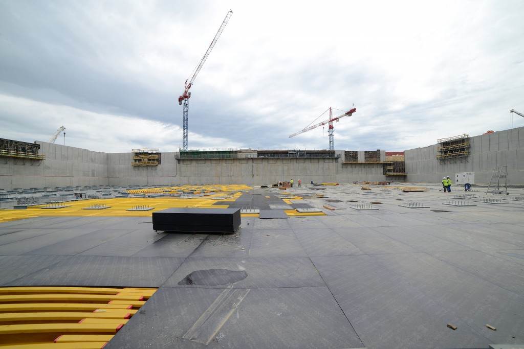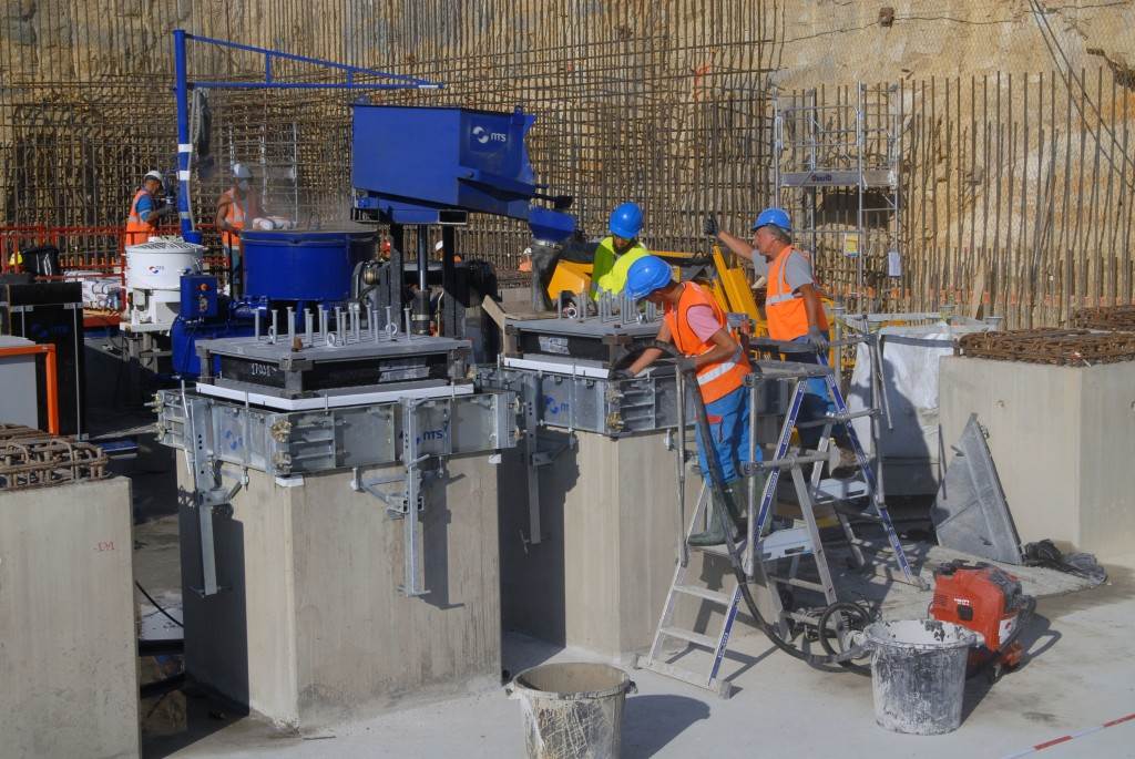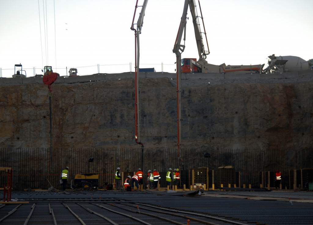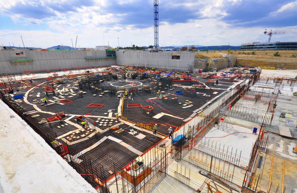 From August 2010 to August 2014, workers excavated the 17-metre-deep, 90 x 130 metre Tokamak Complex Seismic Pit, created a ground-level basemat and retaining walls, installed 493 seismic columns and pads, and poured the B2 basemat slab (the "floor" of the Tokamak Complex).