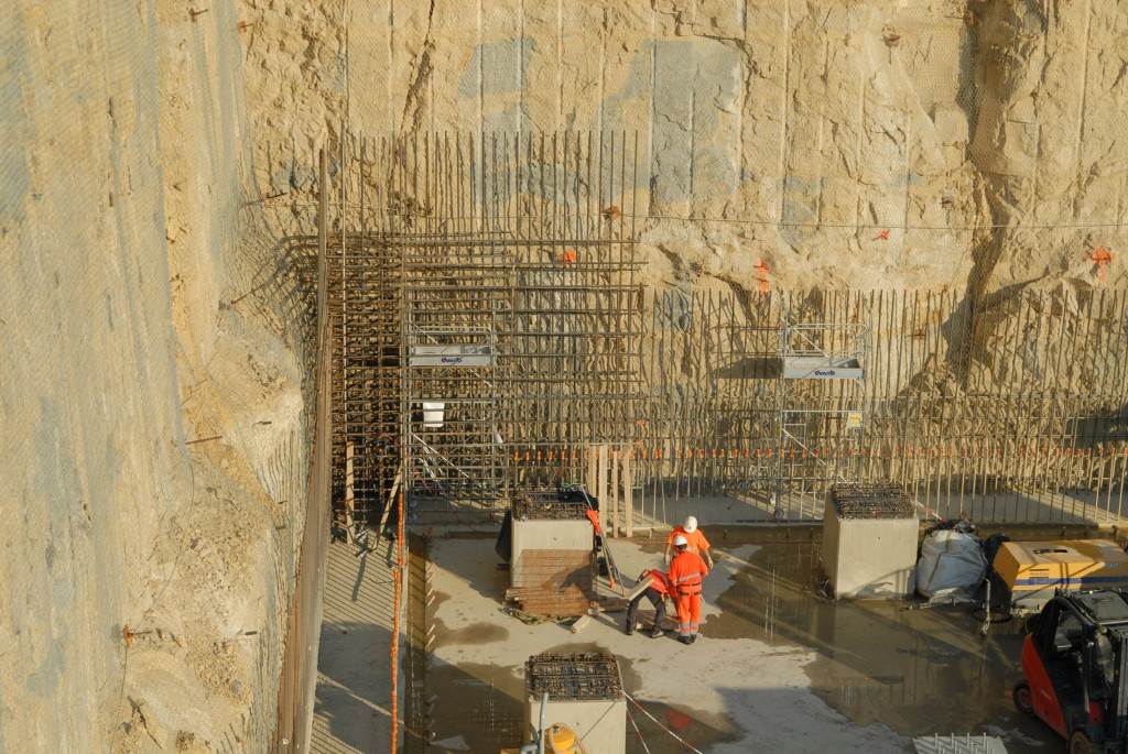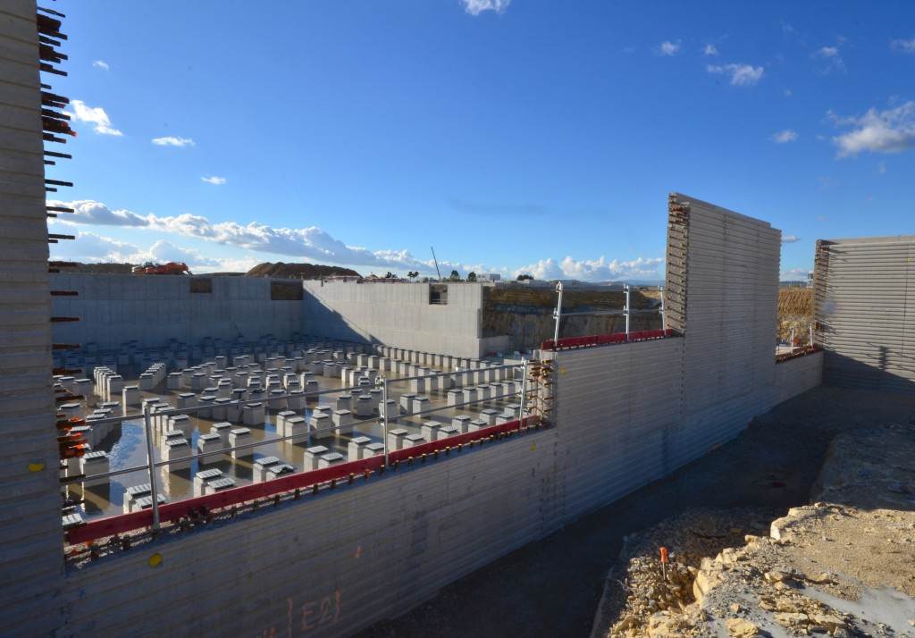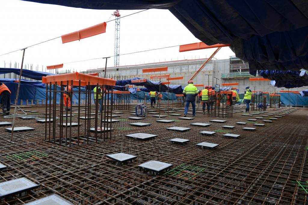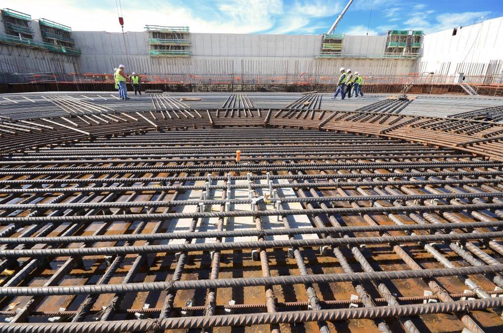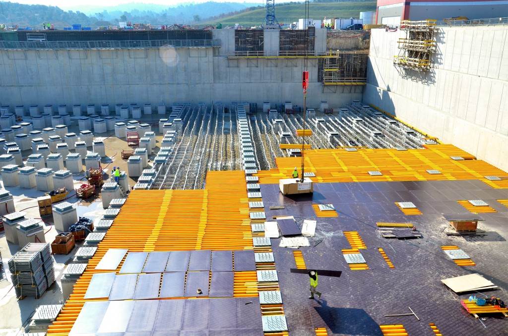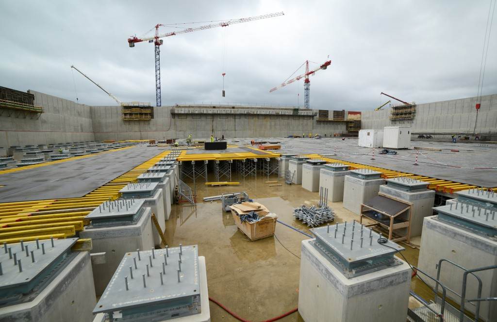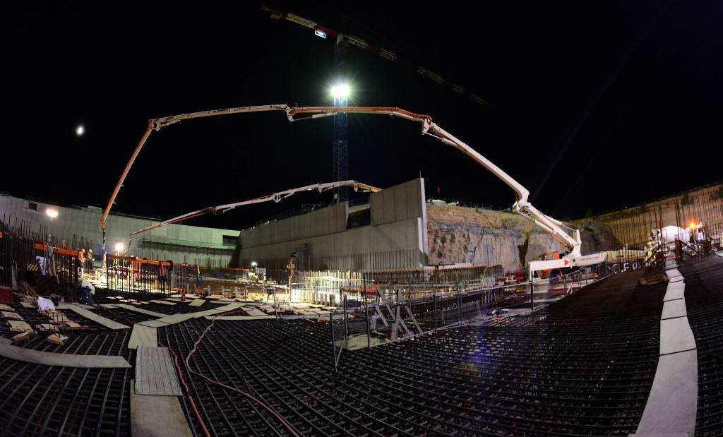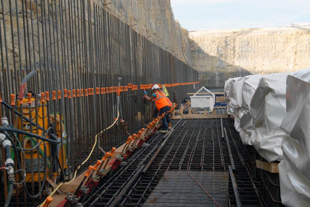 From August 2010 to August 2014, workers excavated the 17-metre-deep, 90 x 130 metre Tokamak Complex Seismic Pit, created a ground-level basemat and retaining walls, installed 493 seismic columns and pads, and poured the B2 basemat slab (the "floor" of the Tokamak Complex).