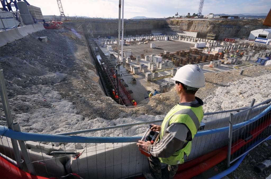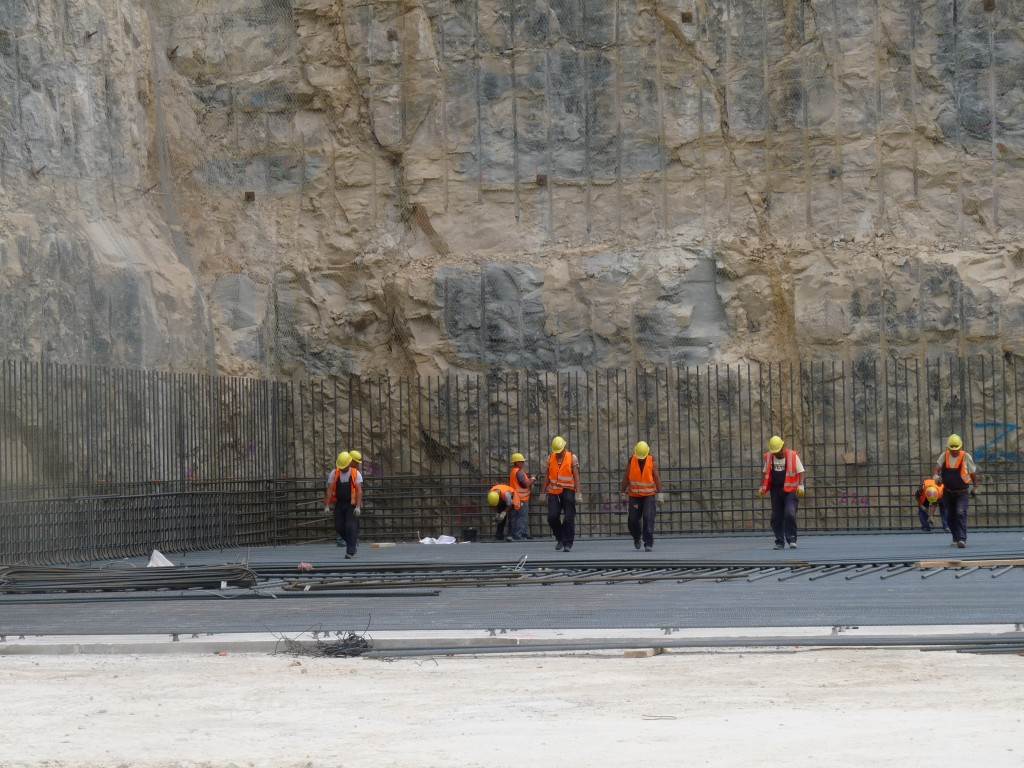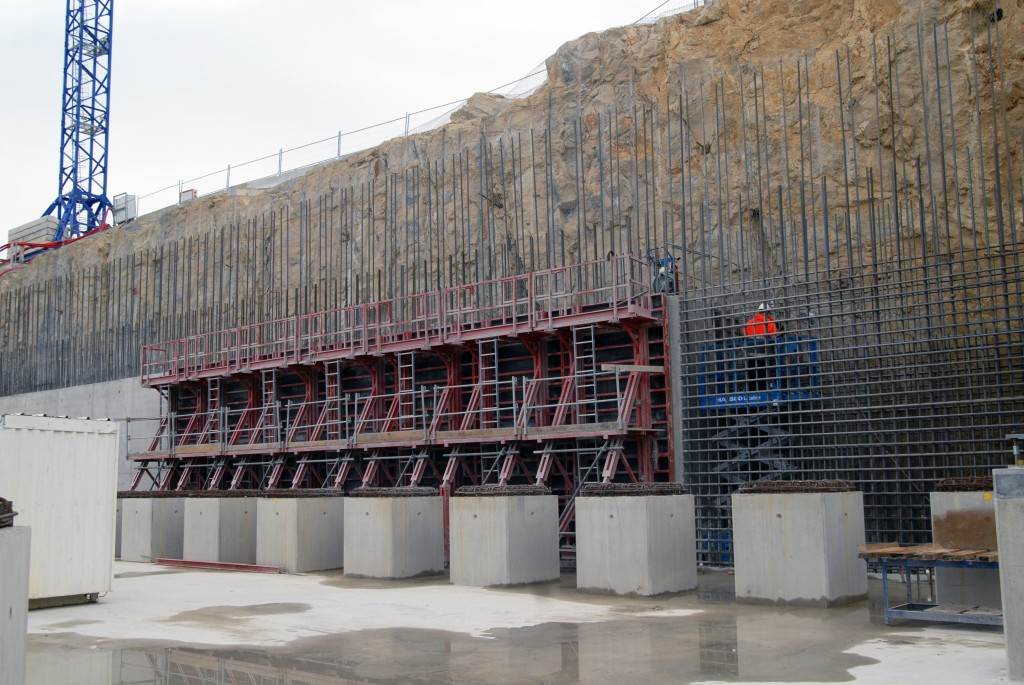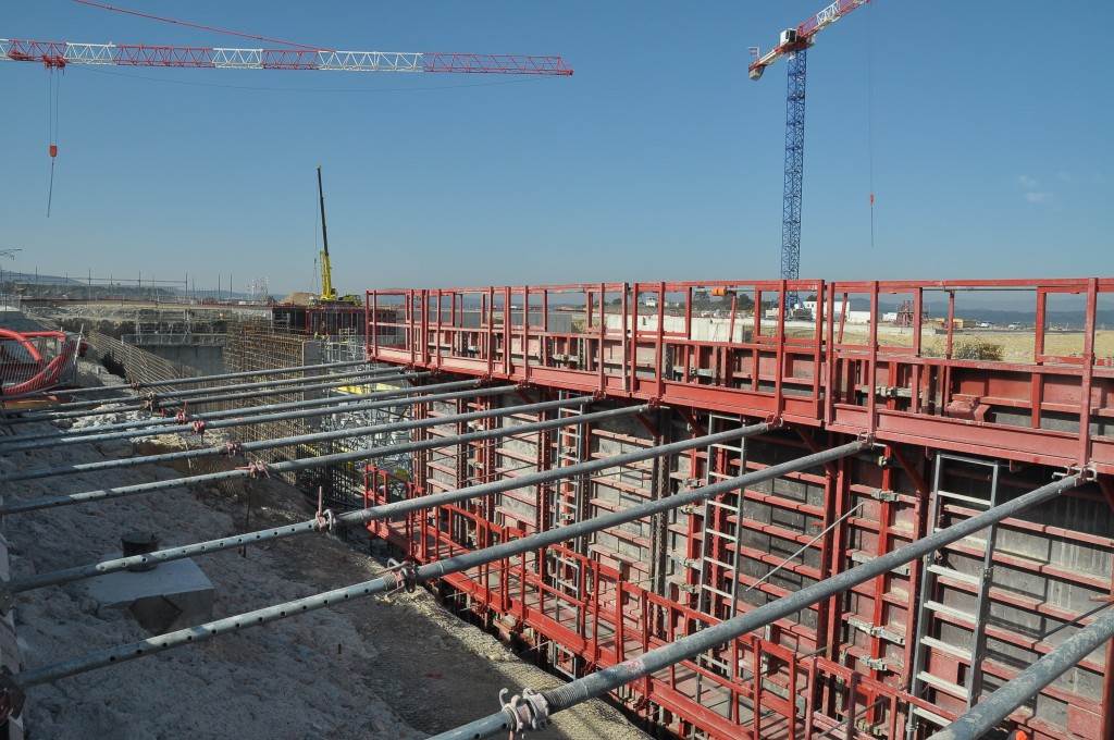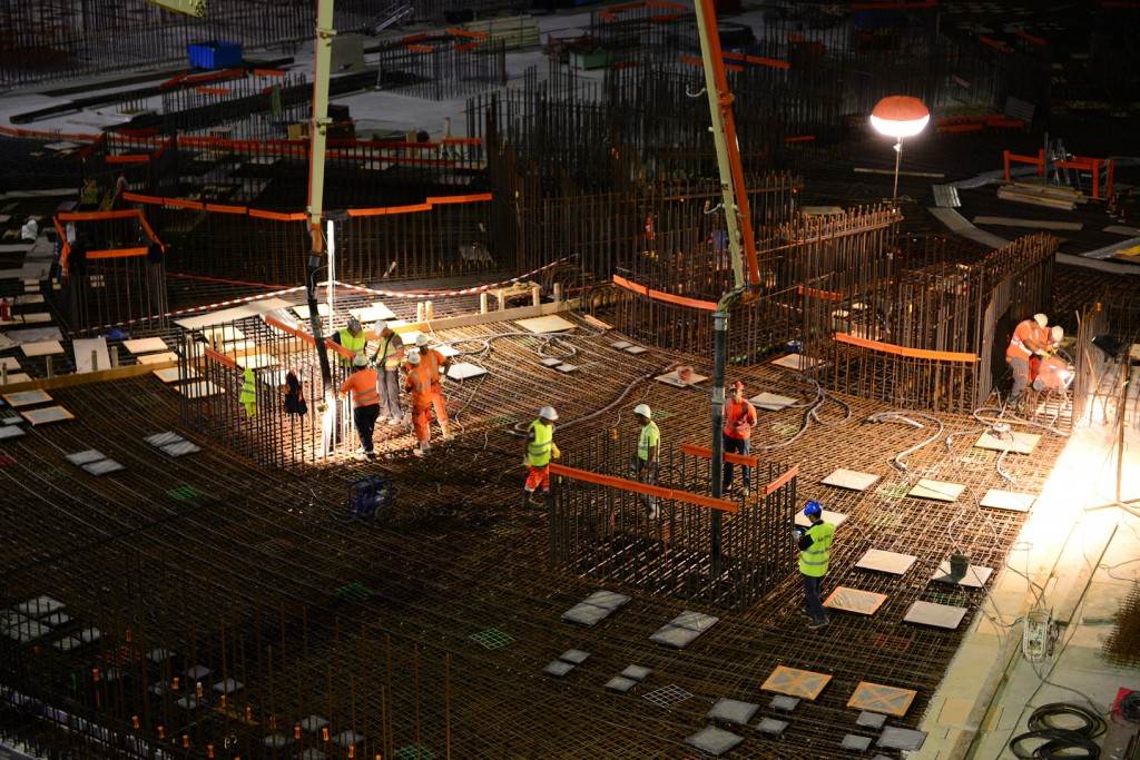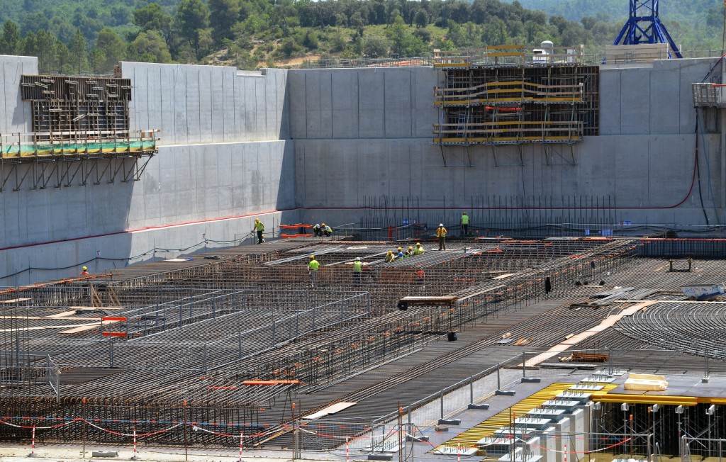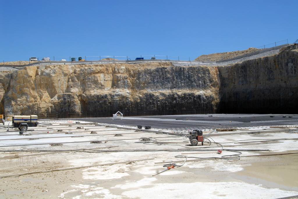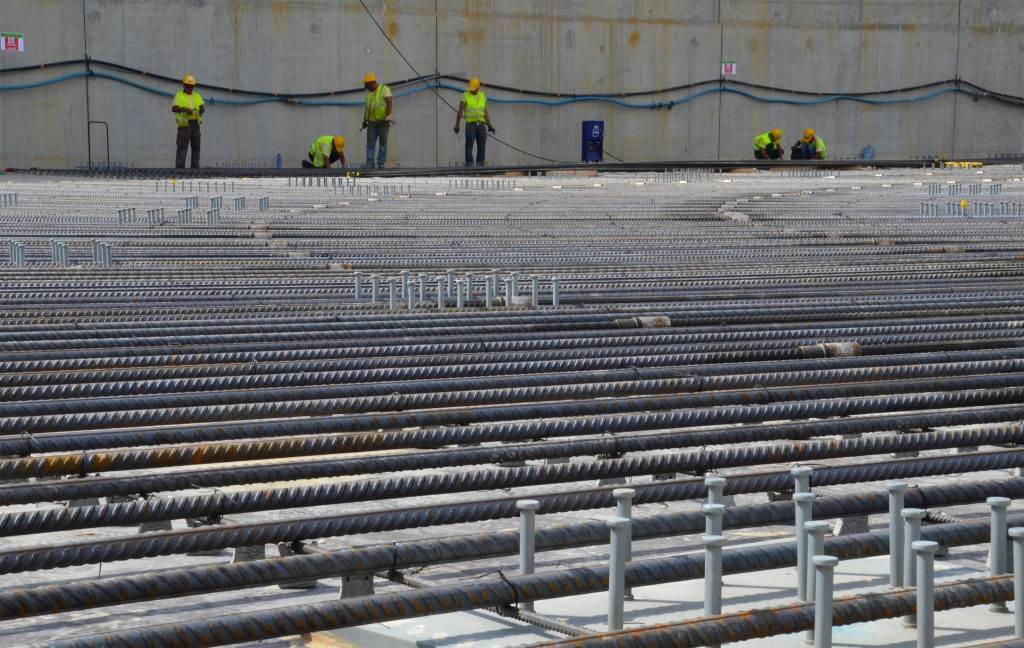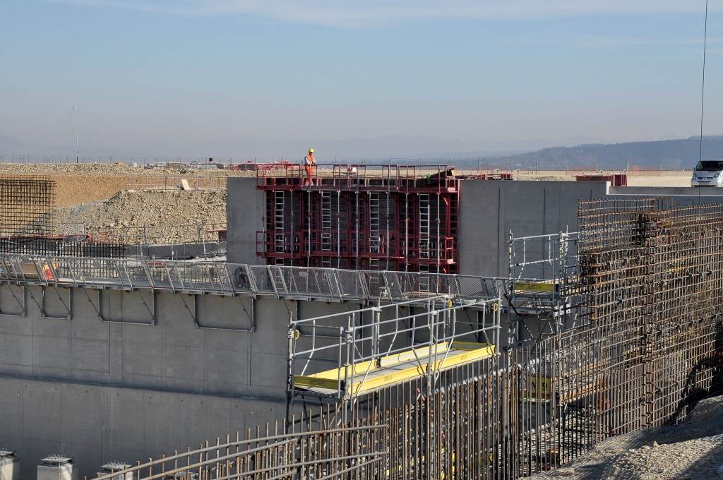 From August 2010 to August 2014, workers excavated the 17-metre-deep, 90 x 130 metre Tokamak Complex Seismic Pit, created a ground-level basemat and retaining walls, installed 493 seismic columns and pads, and poured the B2 basemat slab (the "floor" of the Tokamak Complex).