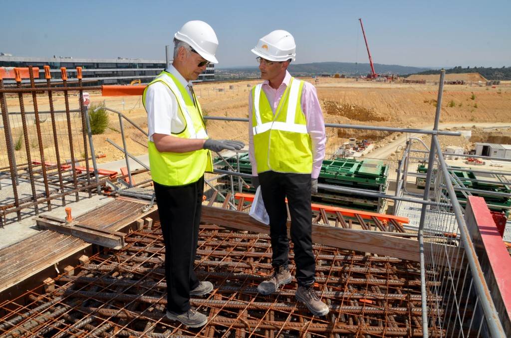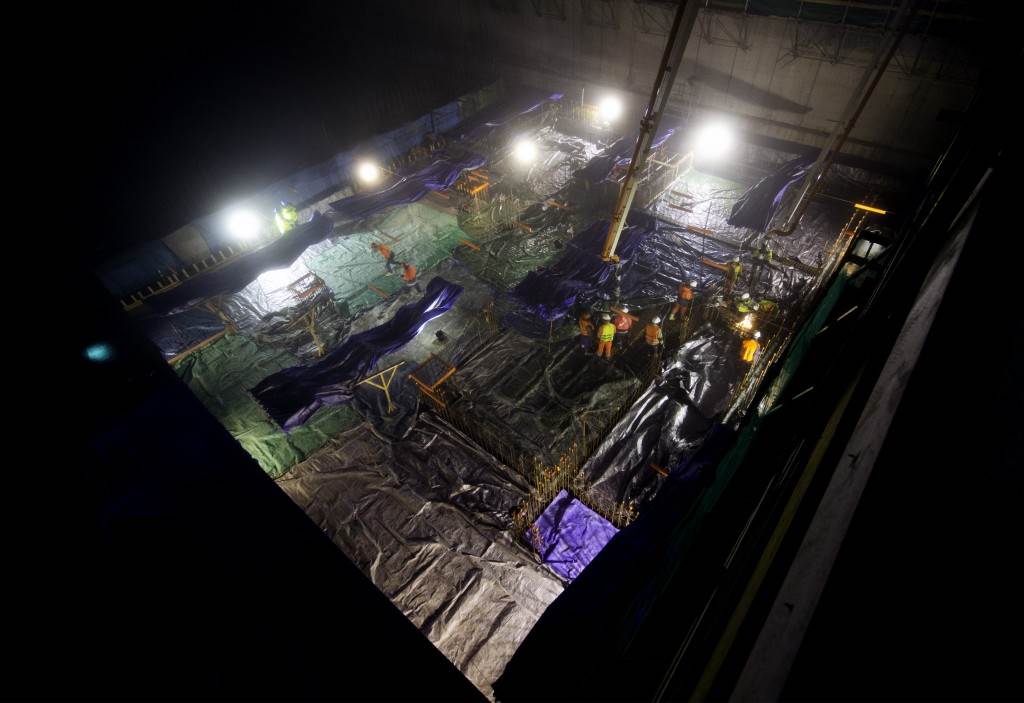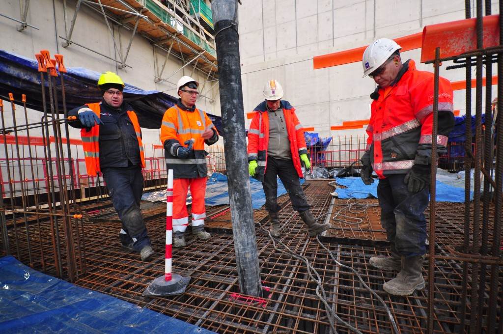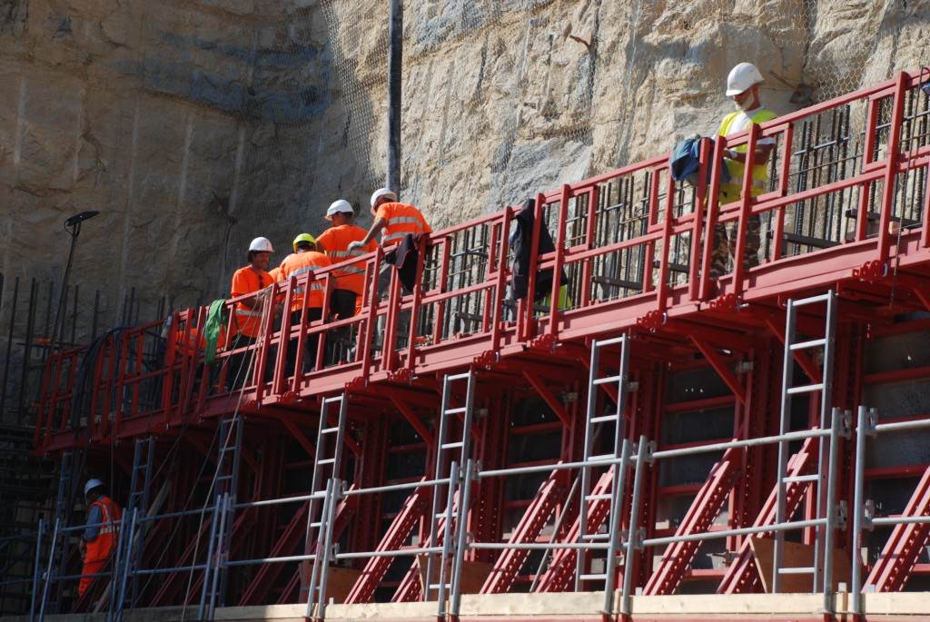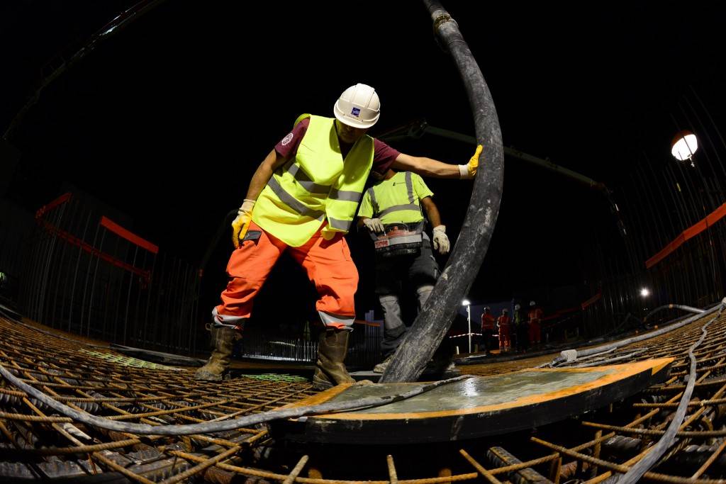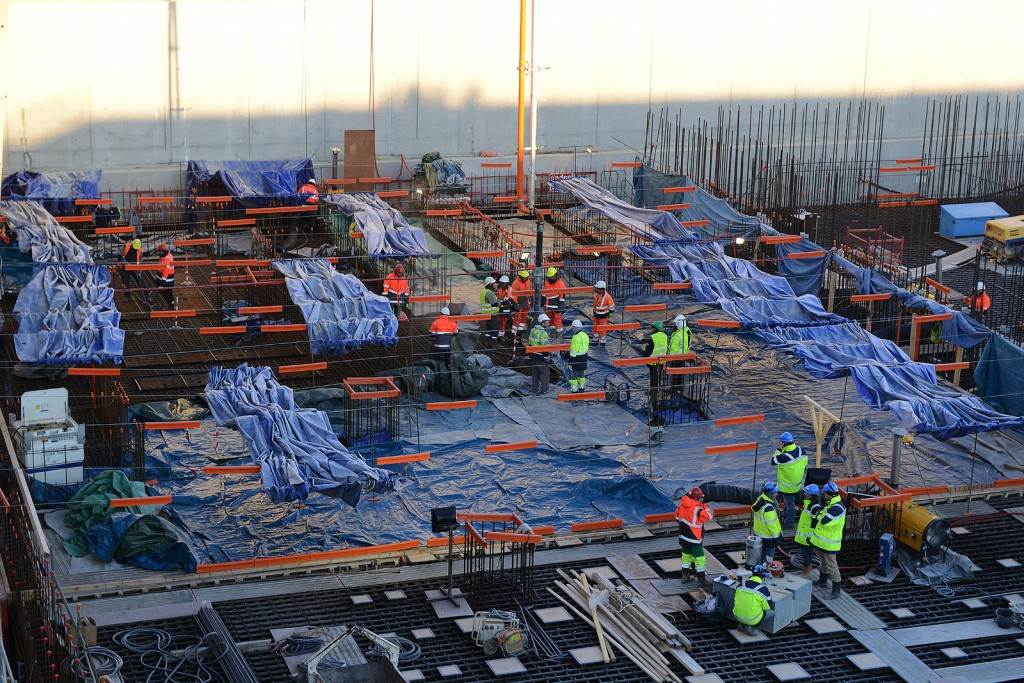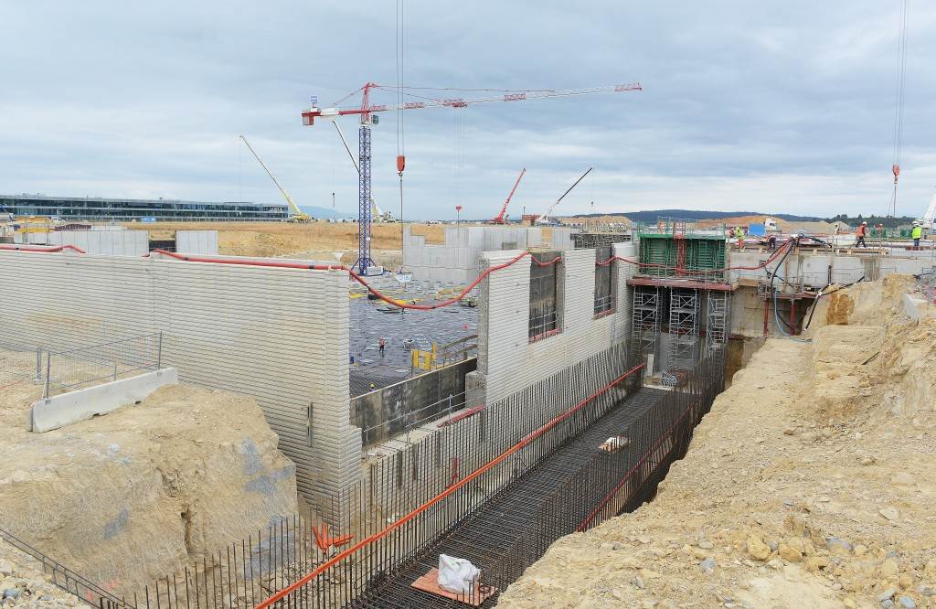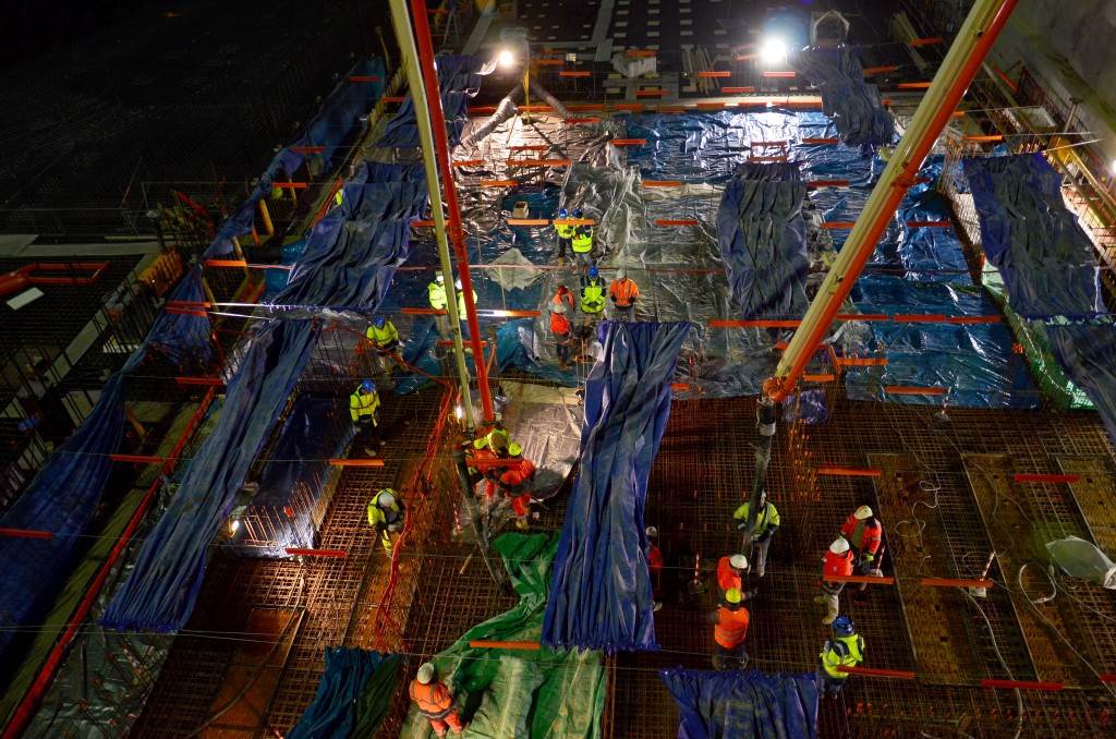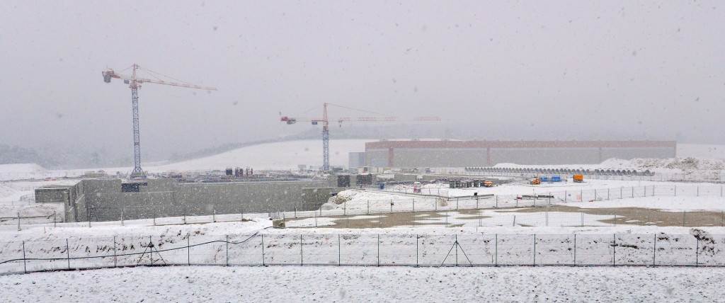 From August 2010 to August 2014, workers excavated the 17-metre-deep, 90 x 130 metre Tokamak Complex Seismic Pit, created a ground-level basemat and retaining walls, installed 493 seismic columns and pads, and poured the B2 basemat slab (the "floor" of the Tokamak Complex).