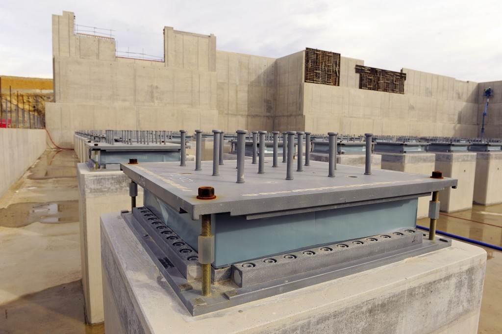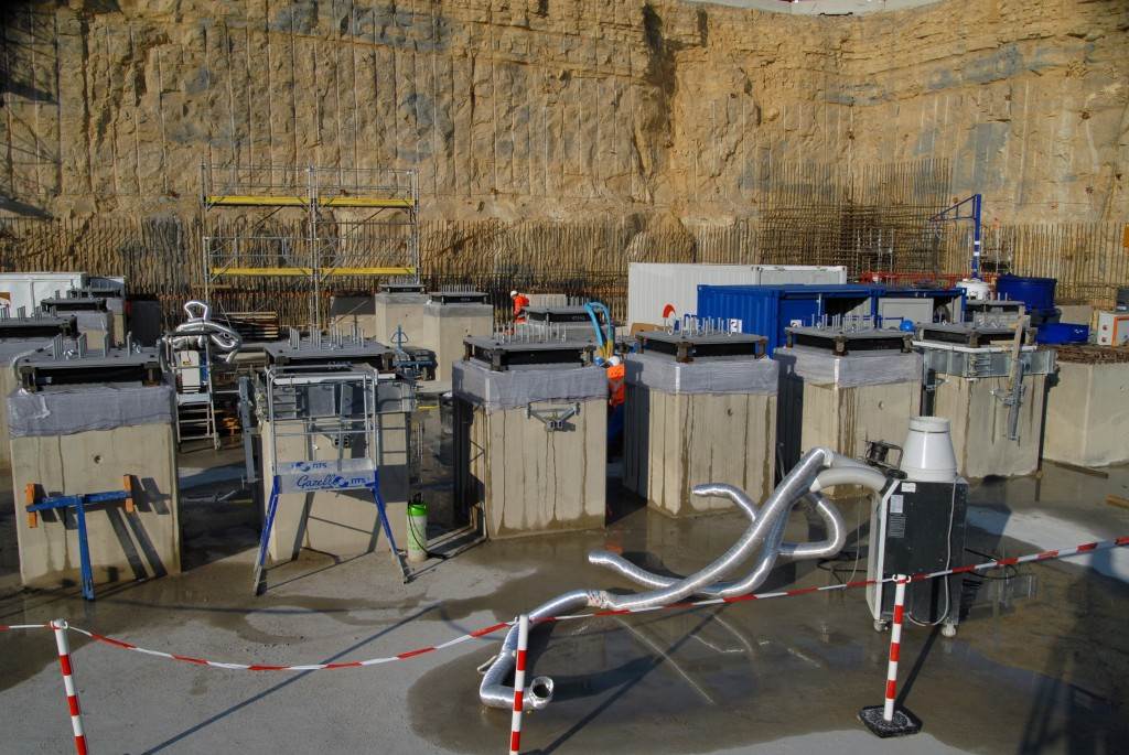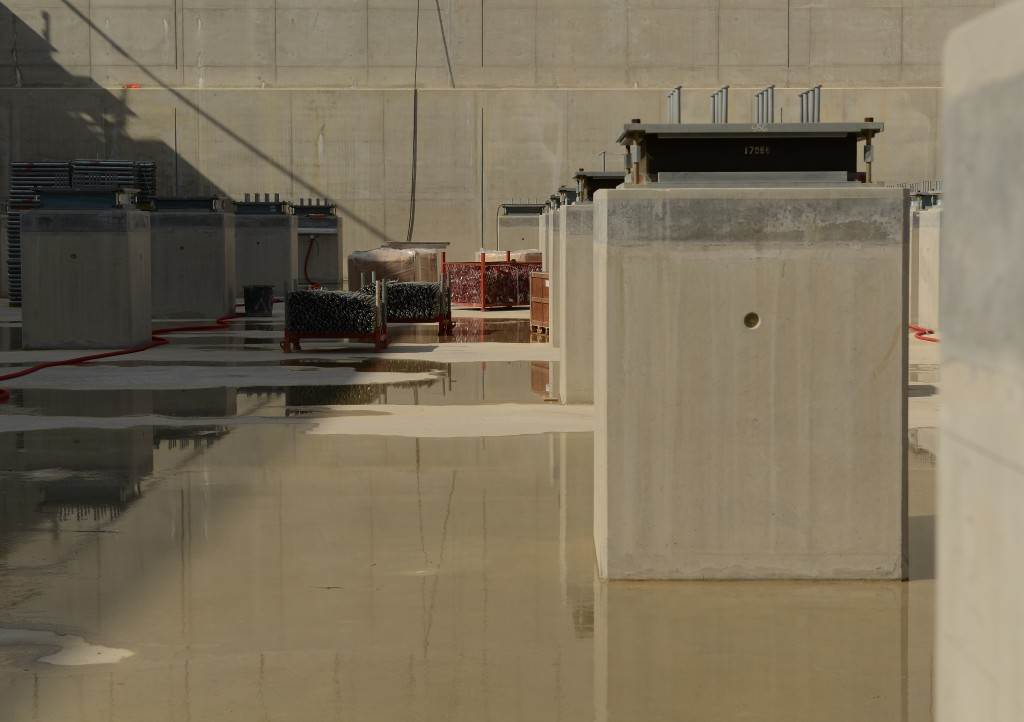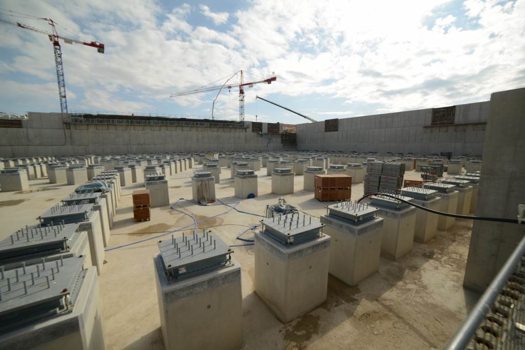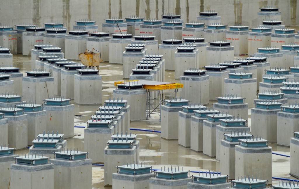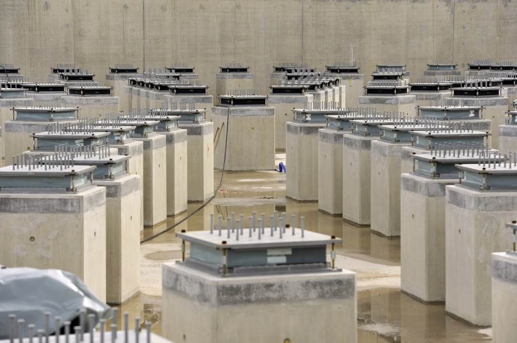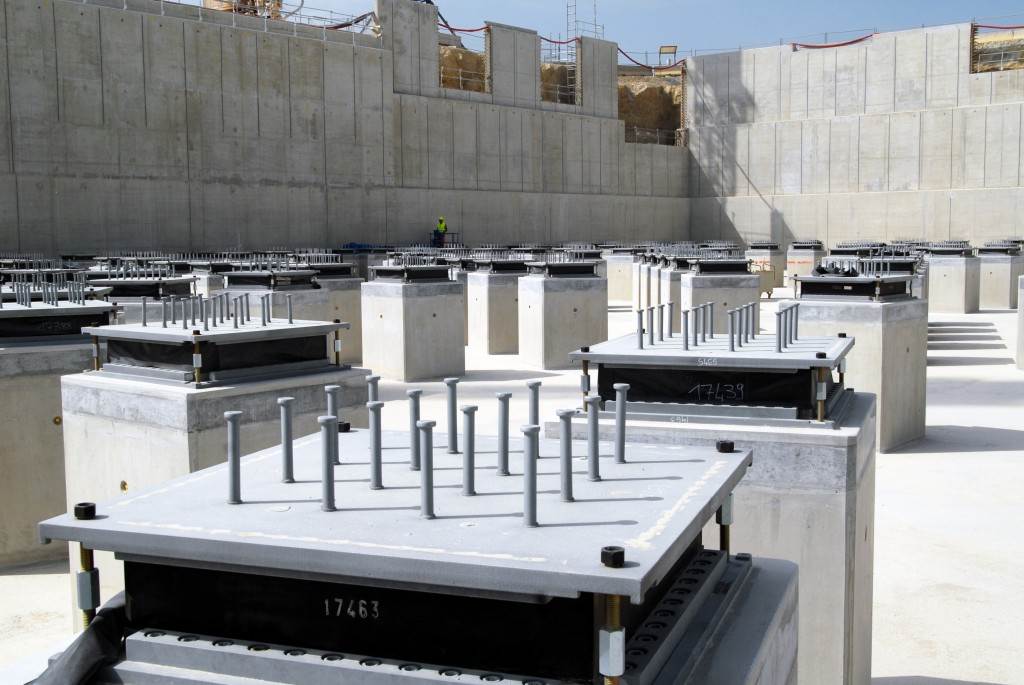 On the level surface of the Seismic Pit basemat, 493 columns topped with anti-seismic bearings, made of alternate layers of metal and rubber, were put in place at regular intervals. With a capacity for lateral movement of 10 cm, these 20-cm-thick bearings are capable of filtering and absorbing the accelerations linked to earthquake-induced ground motion.