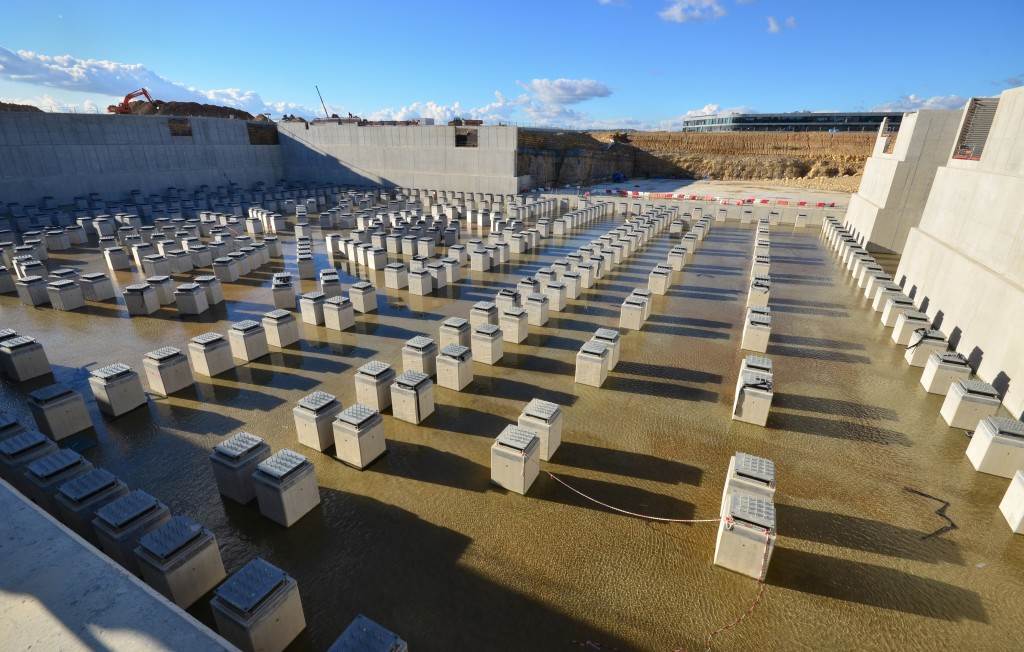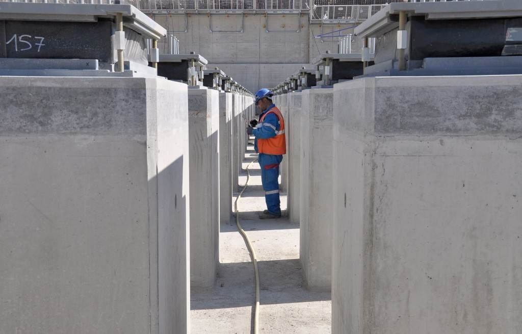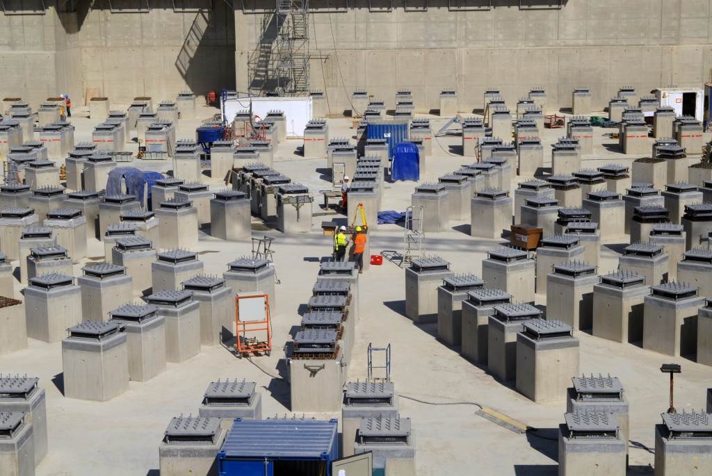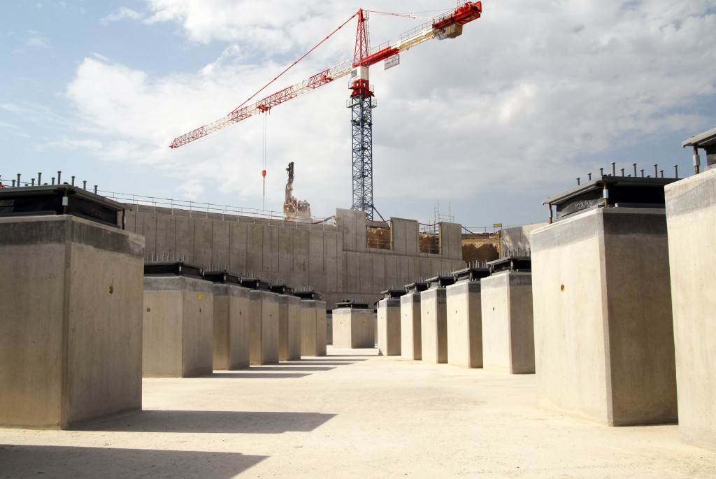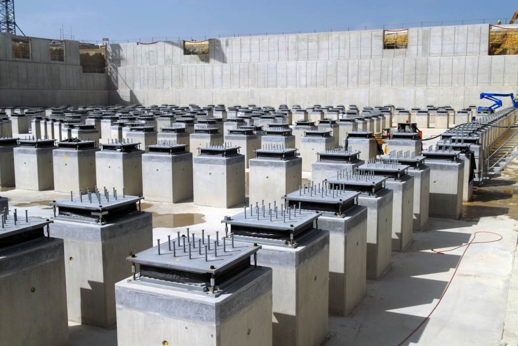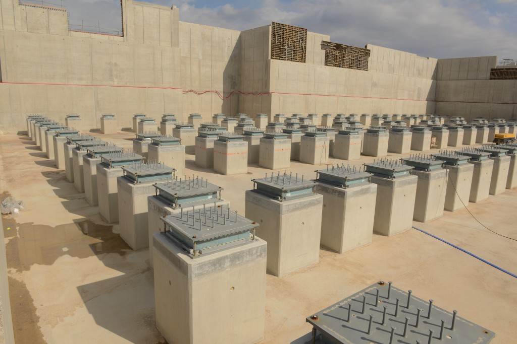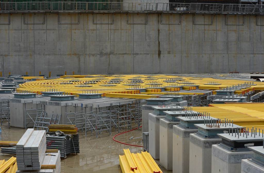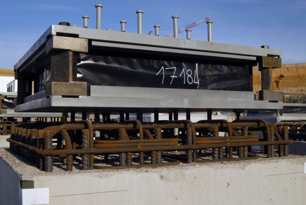 On the level surface of the Seismic Pit basemat, 493 columns topped with anti-seismic bearings, made of alternate layers of metal and rubber, were put in place at regular intervals. With a capacity for lateral movement of 10 cm, these 20-cm-thick bearings are capable of filtering and absorbing the accelerations linked to earthquake-induced ground motion.