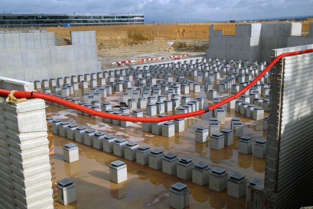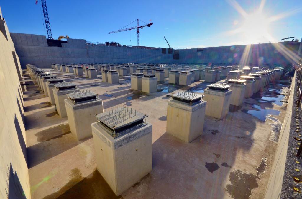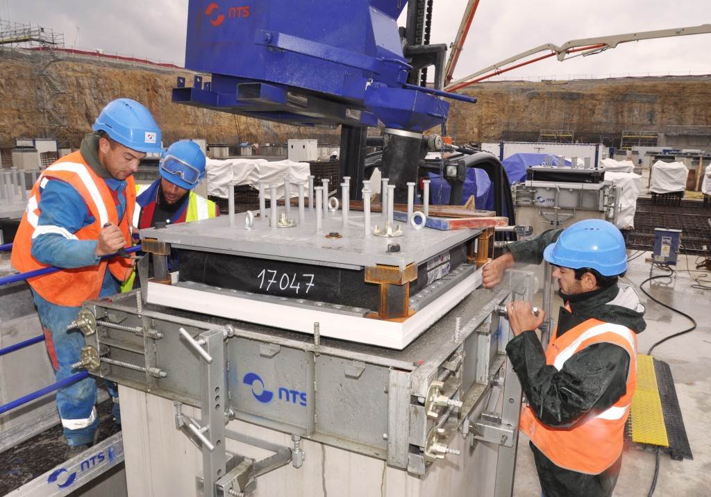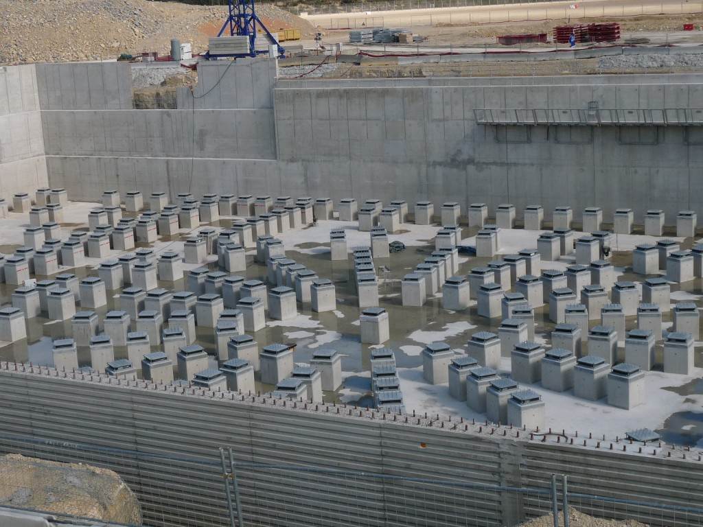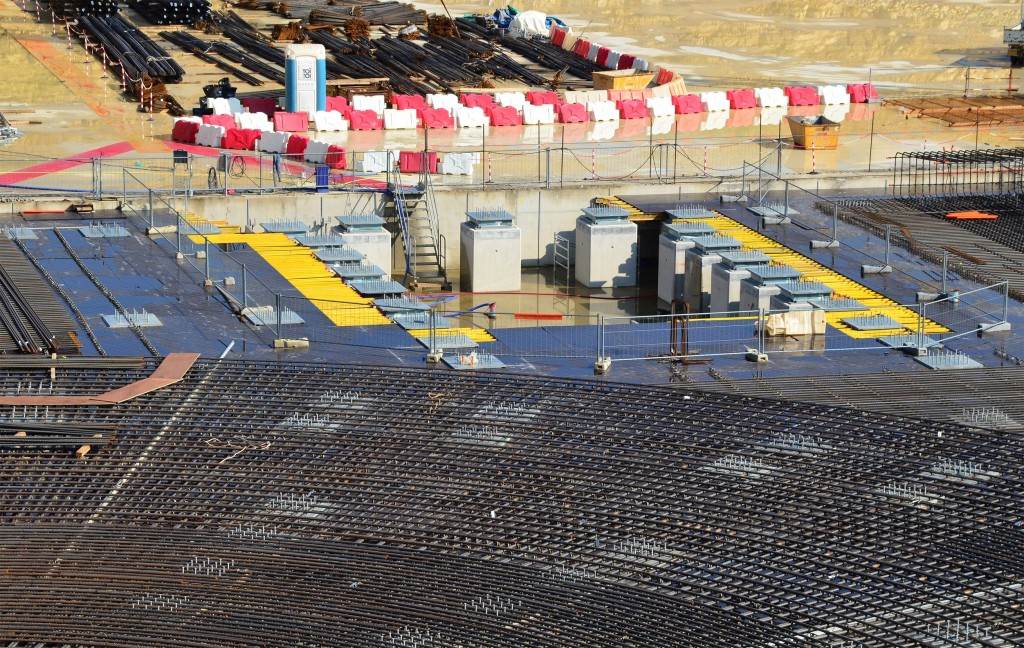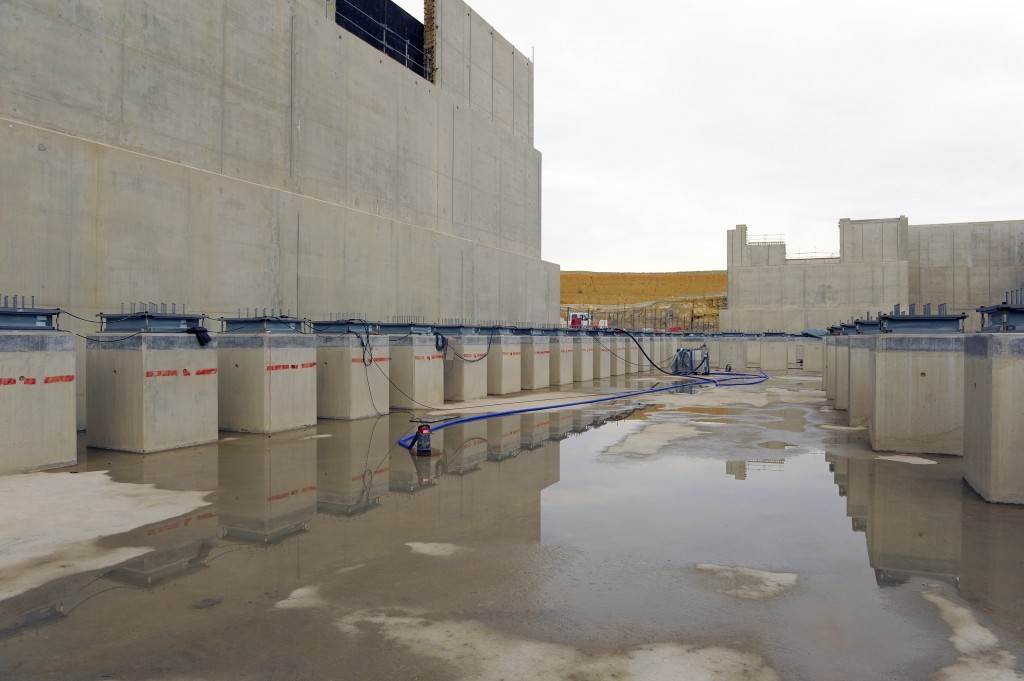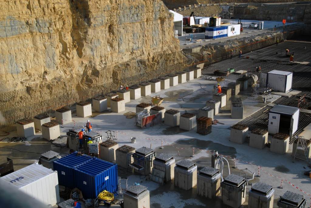On the level surface of the Seismic Pit basemat, 493 columns topped with anti-seismic bearings, made of alternate layers of metal and rubber, were put in place at regular intervals. With a capacity for lateral movement of 10 cm, these 20-cm-thick bearings are capable of filtering and absorbing the accelerations linked to earthquake-induced ground motion.
