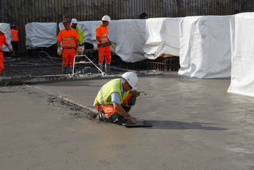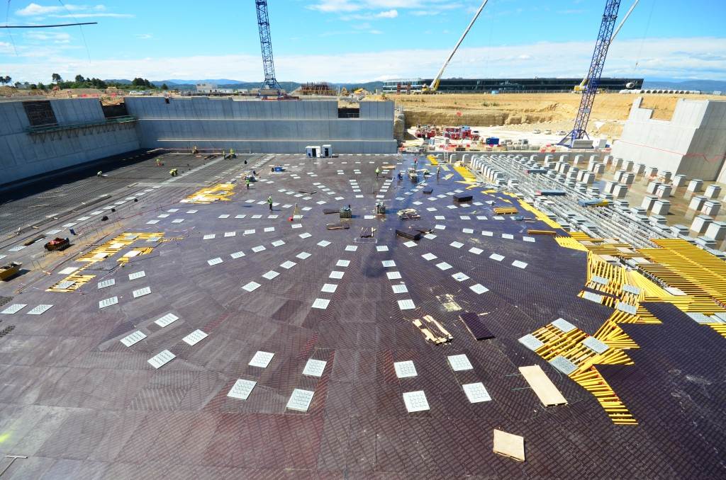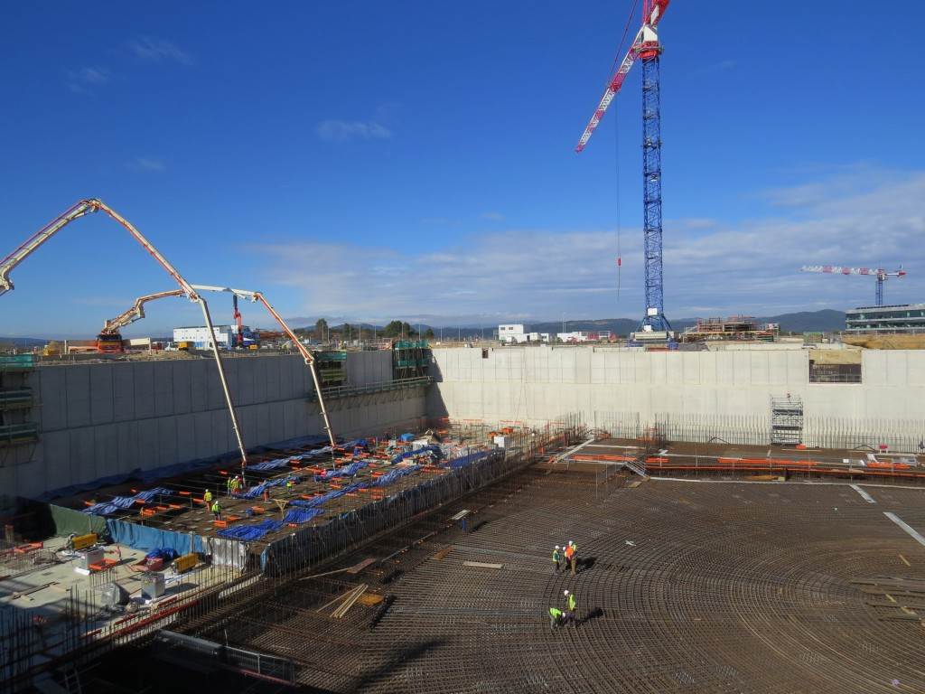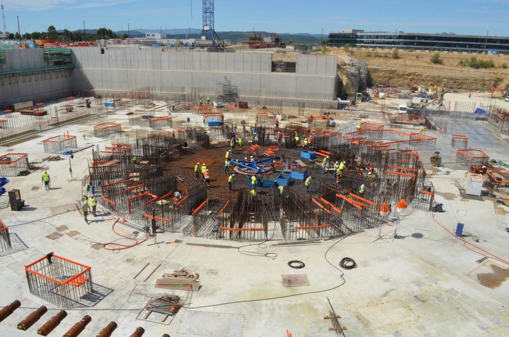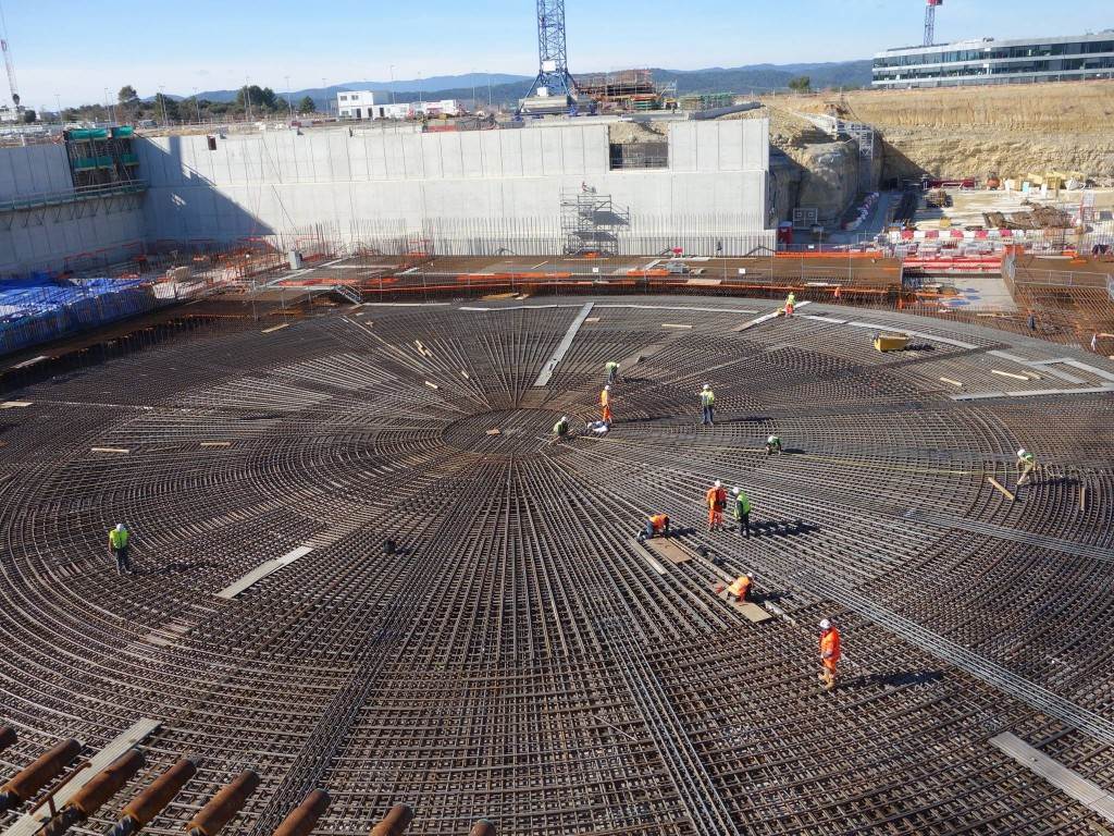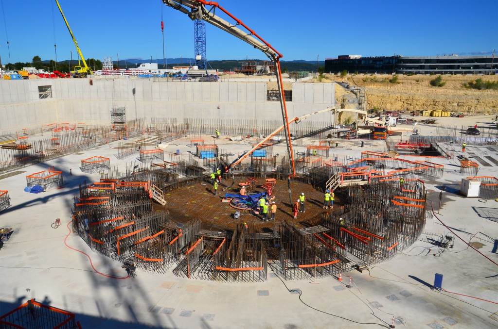 The Tokamak Complex B2 slab is a heavily reinforced basemat (9,300 m², 1.5 metre thick) that will support the Tokamak Complex and its 440,000 tonnes of buildings, machinery and equipment. The last segment—a perfectly circular, central plot that will support the ITER machine—was poured in August 2014.