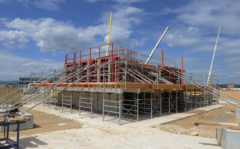 The completion of the B2 slab marked the beginning of the second phase of ITER construction: the start of civil construction works on the seven-storey Tokamak Complex. Eighty metres wide, 120 metres long and 80 metres tall (60 metres above ground level), the Tokamak Complex houses the Tokamak, Diagnostics and Tritium buildings. For more information on Tokamak Complex construction, see this page.