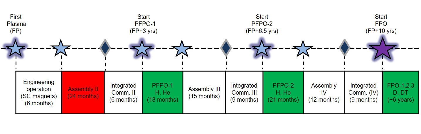 The document defines the plan for the exploitation of the facility necessary to meet the ITER mission goals. Following the demonstration of First Plasma, operation is divided into two main phases: operation in hydrogen/helium plasmas (Pre-Fusion Power Operation, PFPO) and operation in deuterium and deuterium-tritium plasmas (Fusion Power Operation, FPO) to demonstrate the project's fusion production goals (see Figure 2). This is namely a fusion gain (Q) of Q = 10 for 300-500 s, and Q = 5 for 1000 s and 3000 s (corresponding to steady-state operation).
