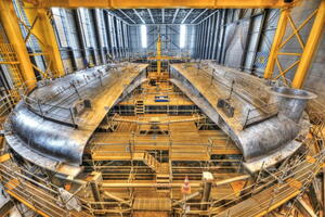 The cryostat lid in March 2021, as it was assembled and welded by Indian contractors in a workshop on site. The 3,850-tonne cryostat, which was completed in 2022, is the largest of India's 14 procurement packages.