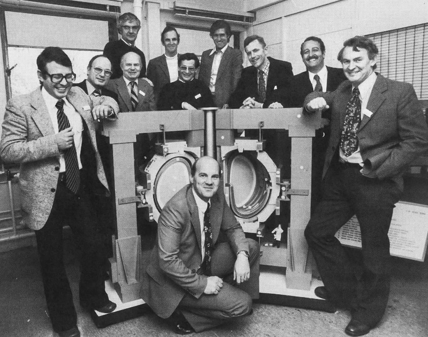 Following four years of design activities, Europe's decision to build JET, in 1977, marked the first international collaborative effort in the construction of a fusion machine. JET remains to this day the largest operating tokamak. Here, the design team headed by France's Paul-Henri Rebut (centre) in 1977.