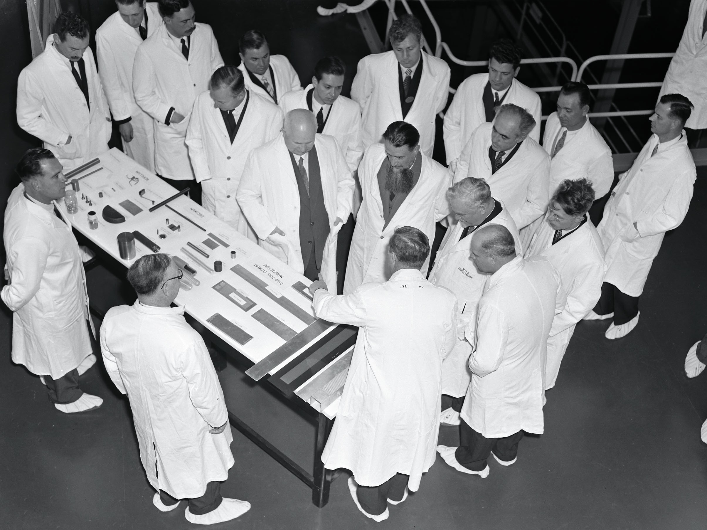 Nikita S. Khrushchev (centre) and Nikolai A. Bulganin (to his left) during the historical visit to the Atomic Energy Research Establishment in Harwell on 26 April 1956, also attended by Igor V. Kurchatov, the "father" of the Soviet nuclear program (to the right of Khrushchev). Opposite is Sir John D. Cockcroft, Director of the Atomic Energy Research Establishment. On the table, mockups of elements from the material testing reactor DIDO, which had just entered operation, are exhibited.