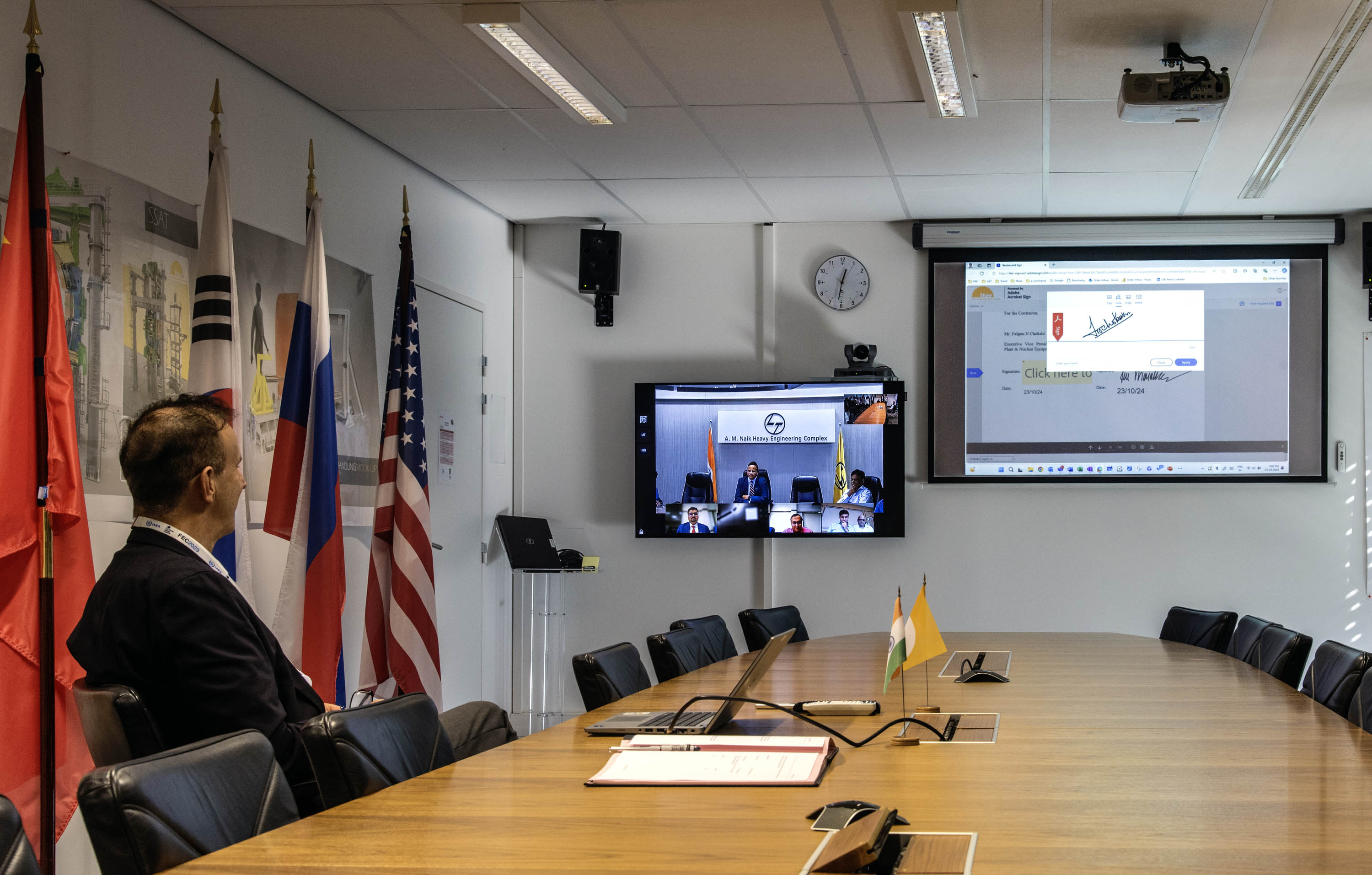 On his return to ITER, a digital contract was signed with Larsen & Toubro representatives for a contract titled "Port Positioning Alignment & Welding." Ports provide access inside the vacuum vessel for auxiliary plasma heating, diagnostics, vacuum pumping, and other needs at three levels (upper, equatorial, and lower).