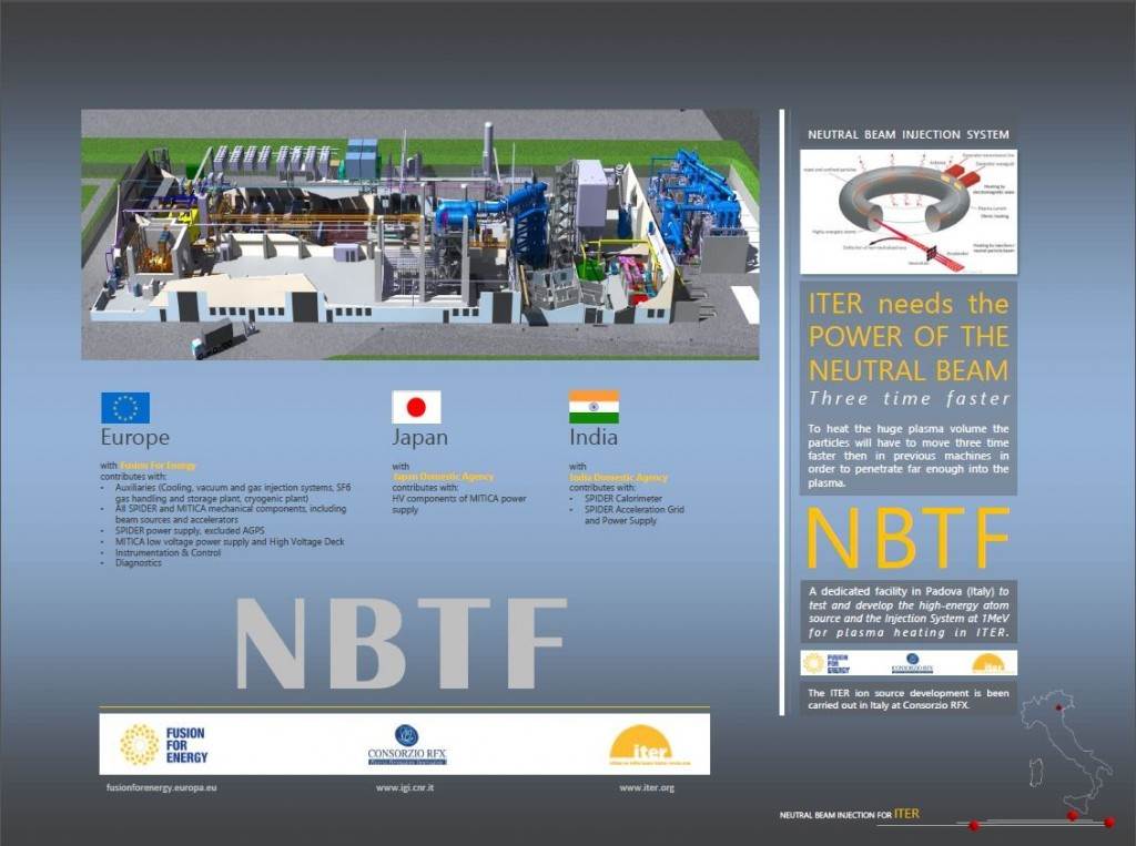 The next step is a facility that can achieve the challenging requirements for the ITER neutral beam system in terms of power, energy, and pulse length simultaneously. The Neutral Beam Test Facility—launched in 2012 after the approval of the ITER Council—has been strongly endorsed by the ITER Organization and the ITER parties involved in the development of the neutral beam injectors, namely Europe and Japan for the in-kind contribution of the heating neutral beam injectors, and India for the diagnostic neutral beam.