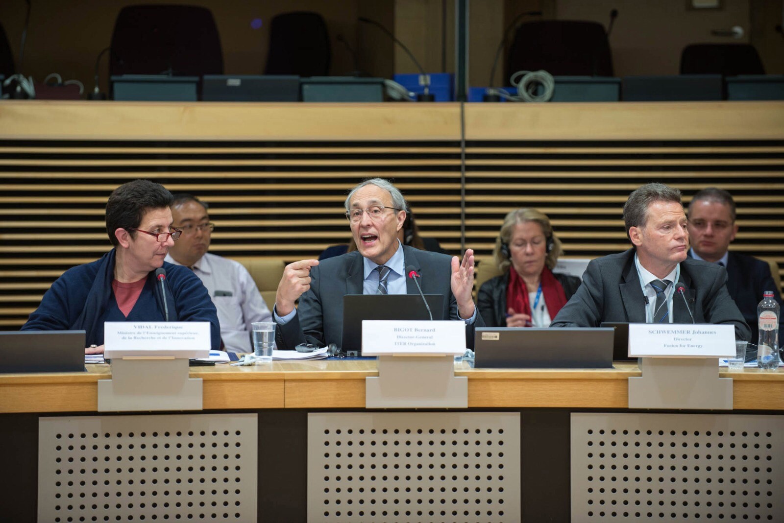 Director-General Bernard Bigot—here between Frédérique Vidal, French Minister of Higher Education, Research and Innovation (left) and Johannes Schwemmer, Director of the European Domestic Agency for ITER—briefed the ITER Industry Day gathering on recent project progress.