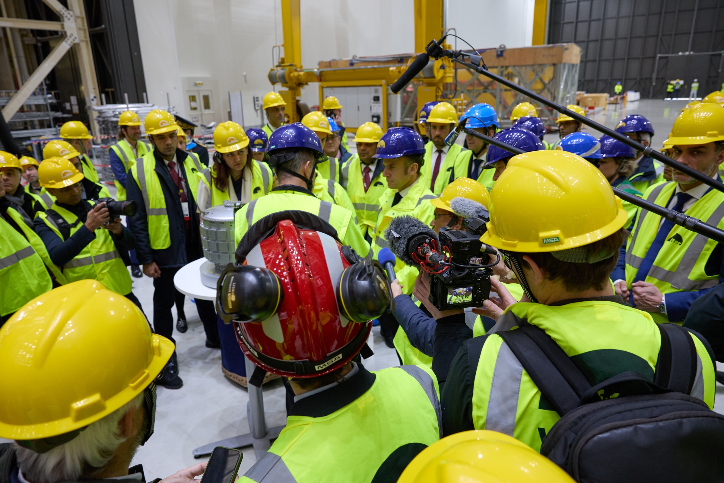 In the dramatic setting of the Assembly Hall, approximately 100 people—comprising the official delegations, ITER senior managers, journalists, and security personnel—made their way along a narrow path that led them past massive steel components in various stages of readiness and a jungle of purpose-built tools, some standing over seven stories tall. An order had gone out for a temporary work stop in the building—or it would have been too hard to converse—and the assembly teams stood at attention all along the trajectory.