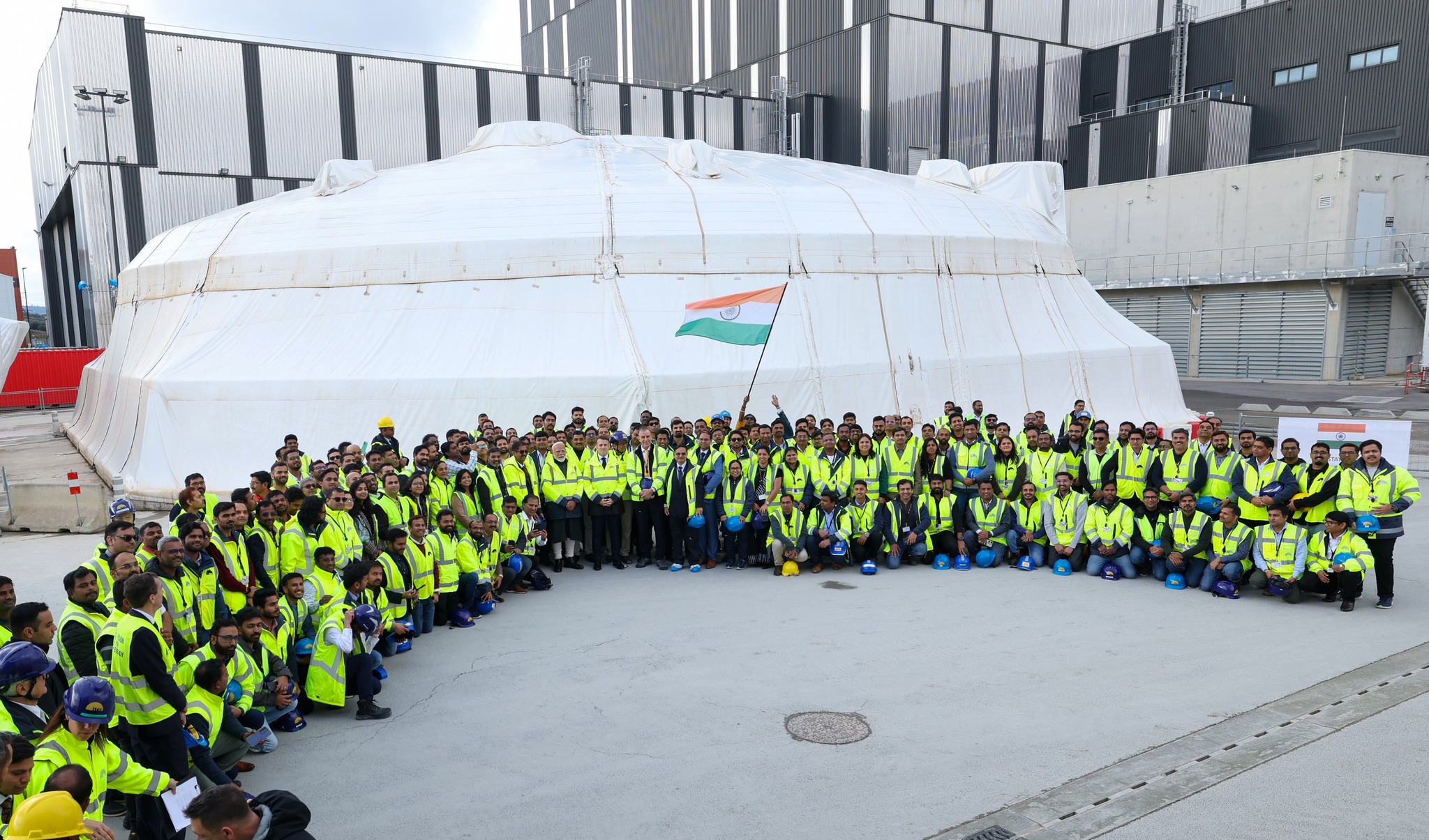 India contributes approximately 9% of ITER construction costs, nine-tenths of which is delivered in the form of “in-kind” procurement (components and systems). India’s largest package is the ITER cryostat—a nearly 4,000-tonne stainless steel vacuum pressure chamber. The Indian manufacturer Larsen & Toubro fabricated the segments of the cryostat in India and then shipped them to the ITER site for subsequent assembly into four large sections. Described to Prime Minister Modi as a “magnificent structure” by the ITER Director-General, part of the cryostat was visible during a stop at a viewpoint looking into the tokamak pit. A second part of the cryostat—the top lid—served as a backdrop to the photo taken with 200 members of Indian staff before the heads of state were ushered back into the car by their aides, seeking to keep the visit on schedule.