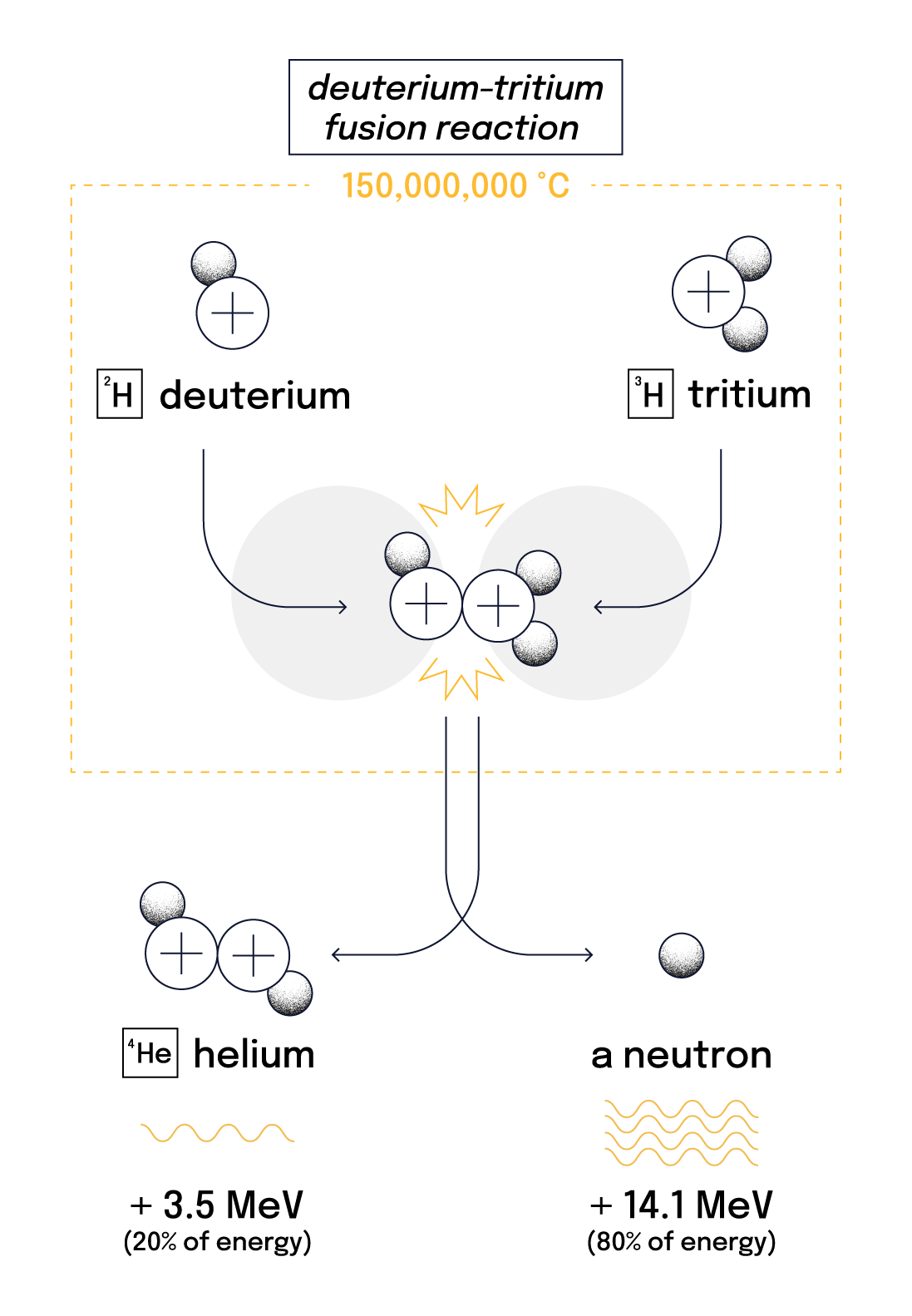 Au XXe siècle, la science de la fusion a identifié la réaction de fusion la plus efficace réalisable en laboratoire: il s'agit de la réaction entre deux isotopes de l'hydrogène (H), le deutérium (D) et le tritium (T). La réaction de fusion D-T est celle qui permet d'obtenir le gain énergétique le plus élevé aux températures les plus « basses ». Mais elle exige des températures de 150 millions de degrés, soit dix fois plus que la réaction H-H qui se produit au cœur du Soleil.